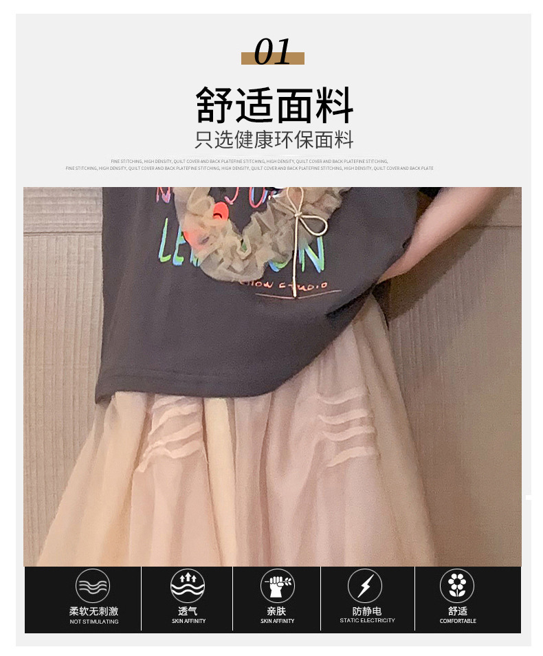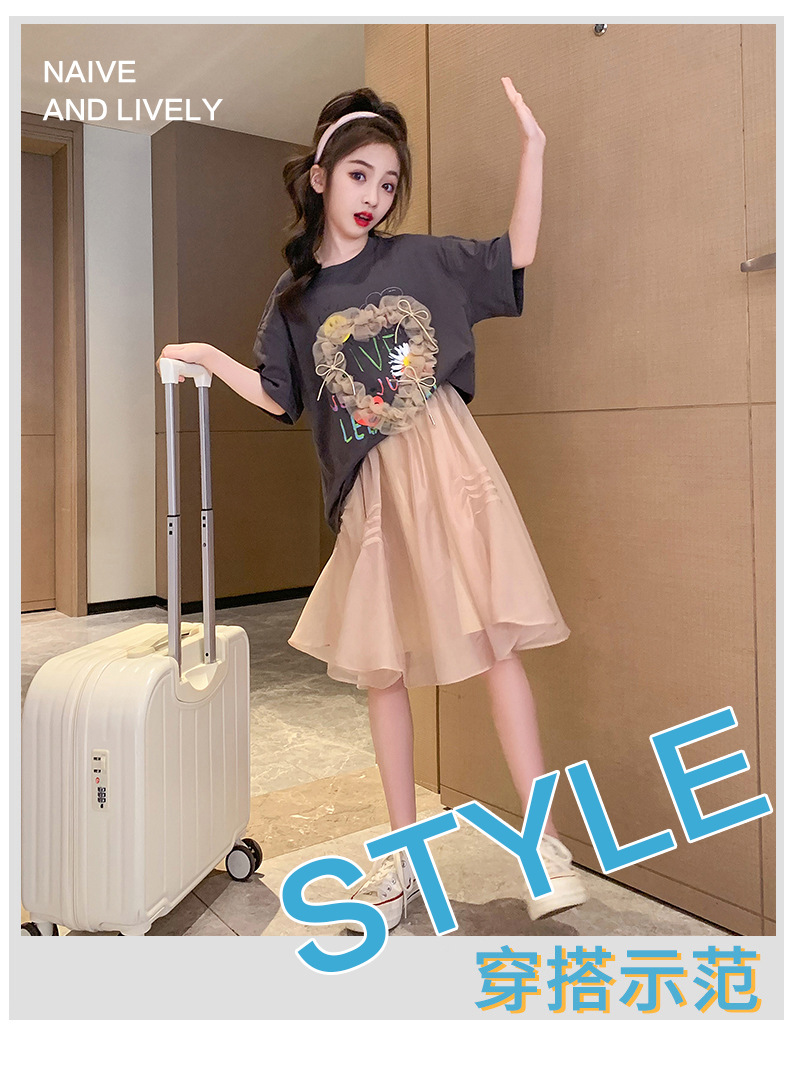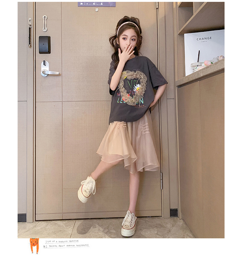 새끼 어린이 여성 세트 여름 새로운 2024 패션 사랑 자수 짧은 소매 상단 절반 거즈 스커트 투피스 대외 무역스토어 가기
