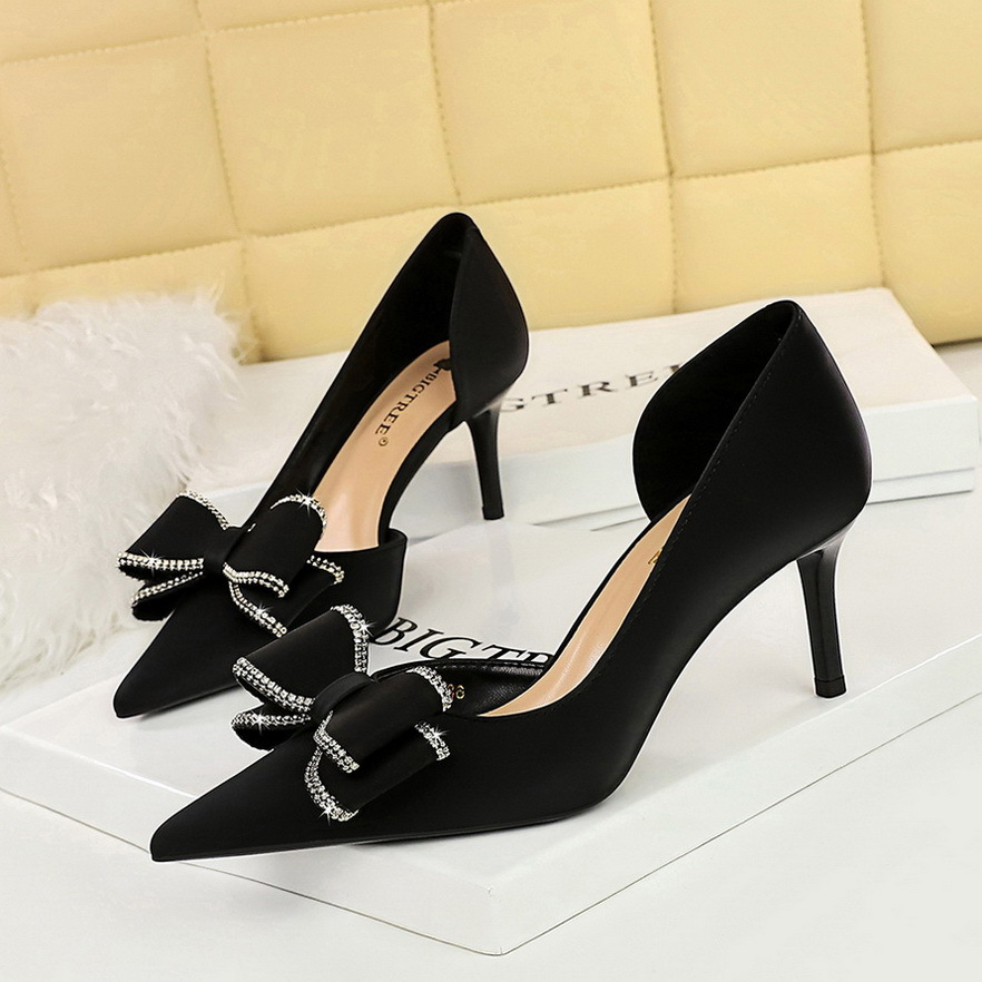 326-AH36 유럽과 미국 스타일의 연회 여성 신발 얇은 굽 높은 얕은 입 뾰족한 측면 할로우 라인스톤 활 신발