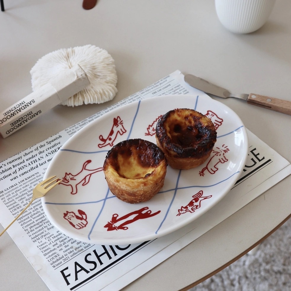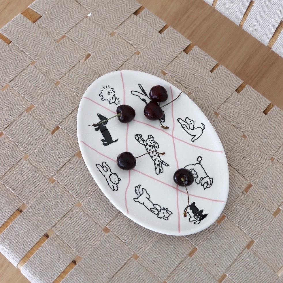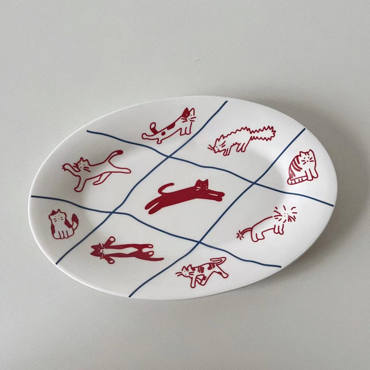 한국 귀여운 만화 라인 고양이 개 세라믹 플레이트 타원형 플레이트 피쉬 플레이트 아침 식사 플레이트 디저트 플레이트스토어 가기