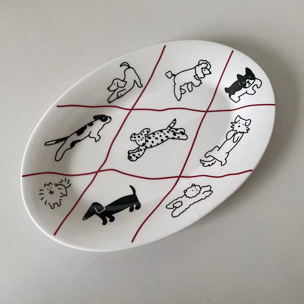 한국 귀여운 만화 라인 고양이 개 세라믹 플레이트 타원형 플레이트 피쉬 플레이트 아침 식사 플레이트 디저트 플레이트