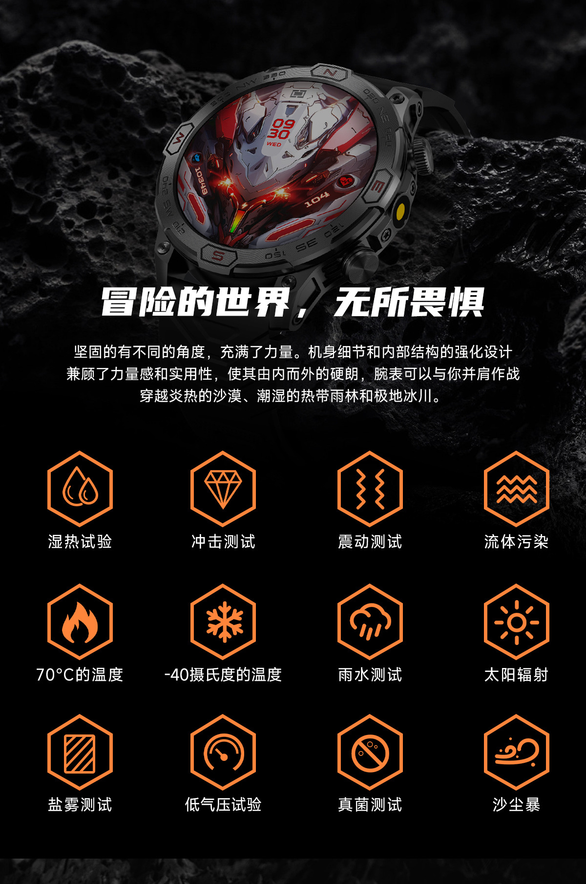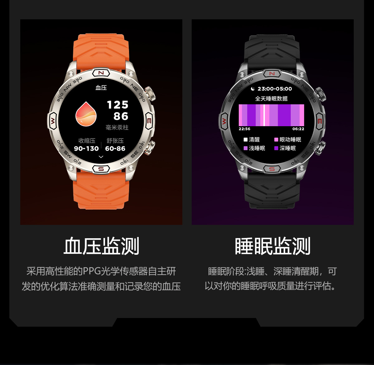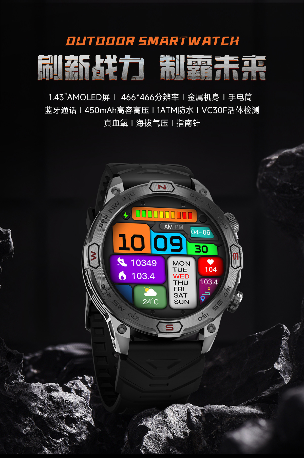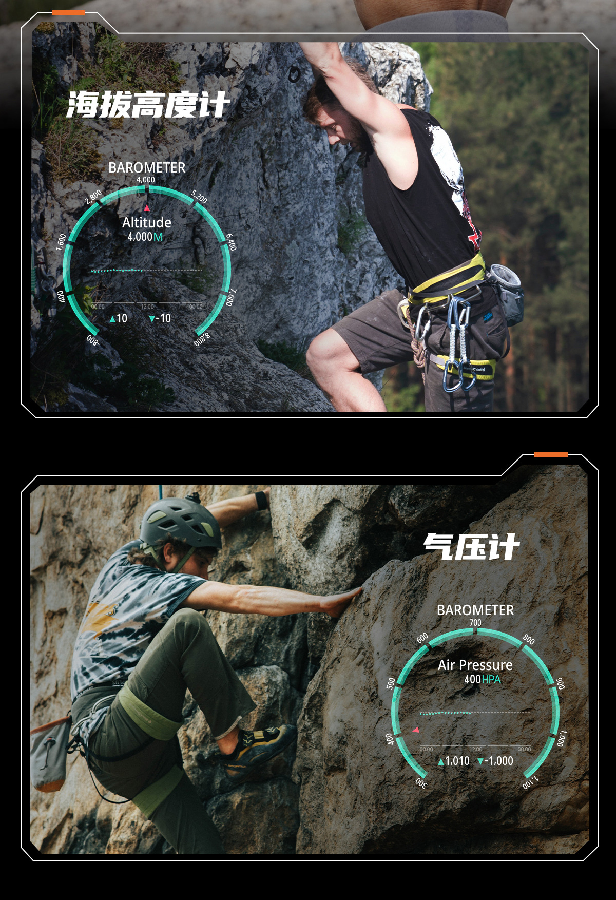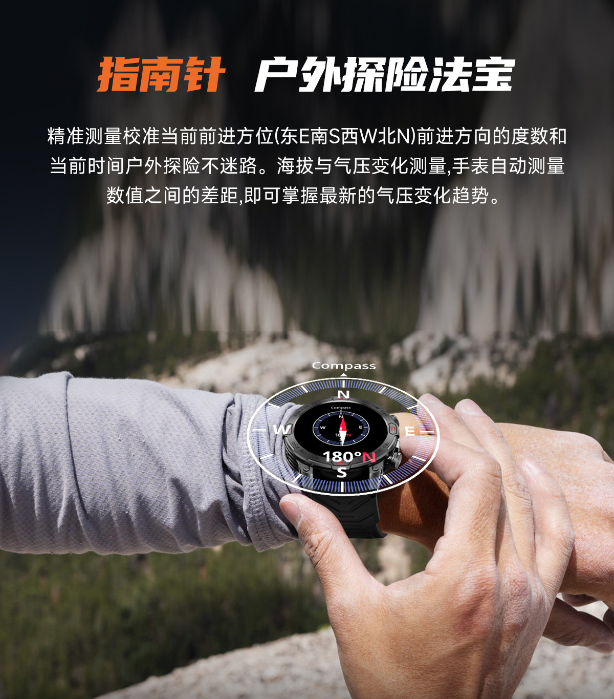 4- 气压计,指南针,3套UI风格,70+表盘可选,支持DIY,113+种运动模式, 21国多语言,100个本地通讯录等;