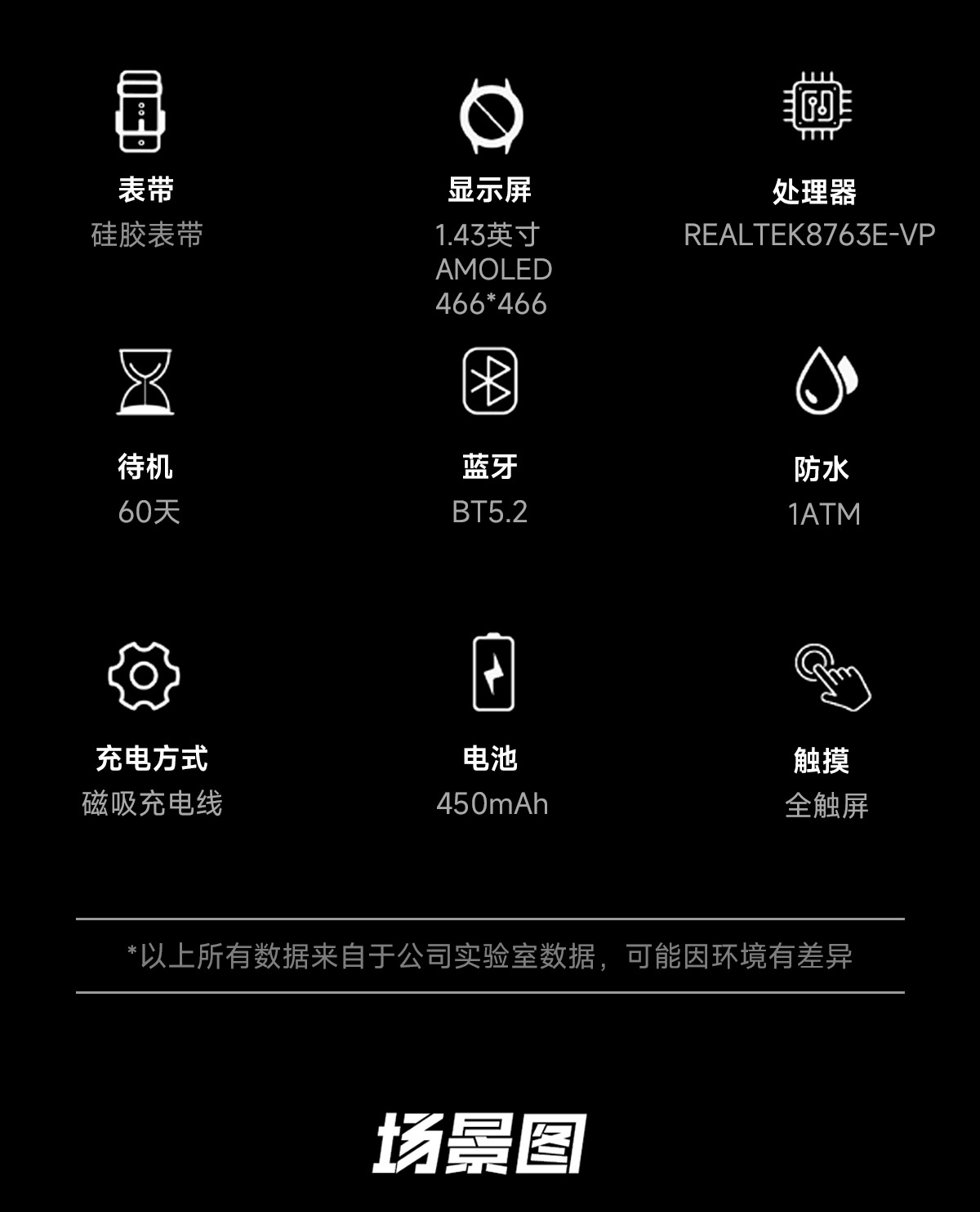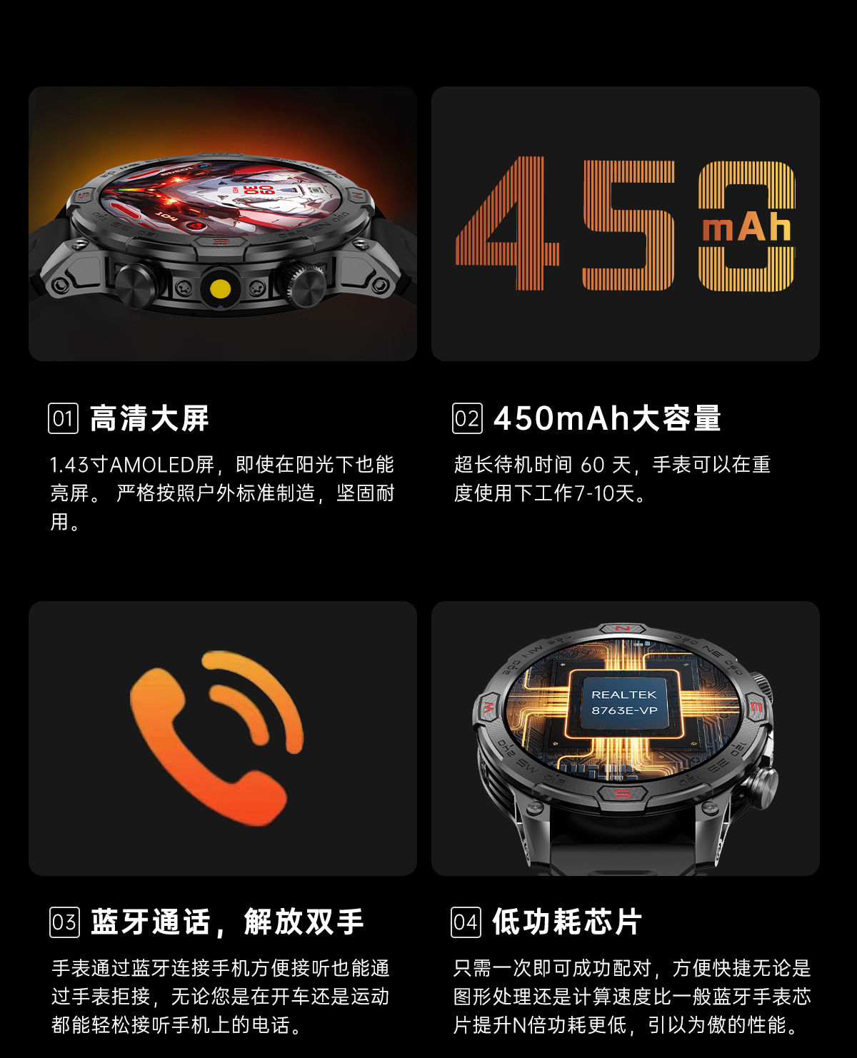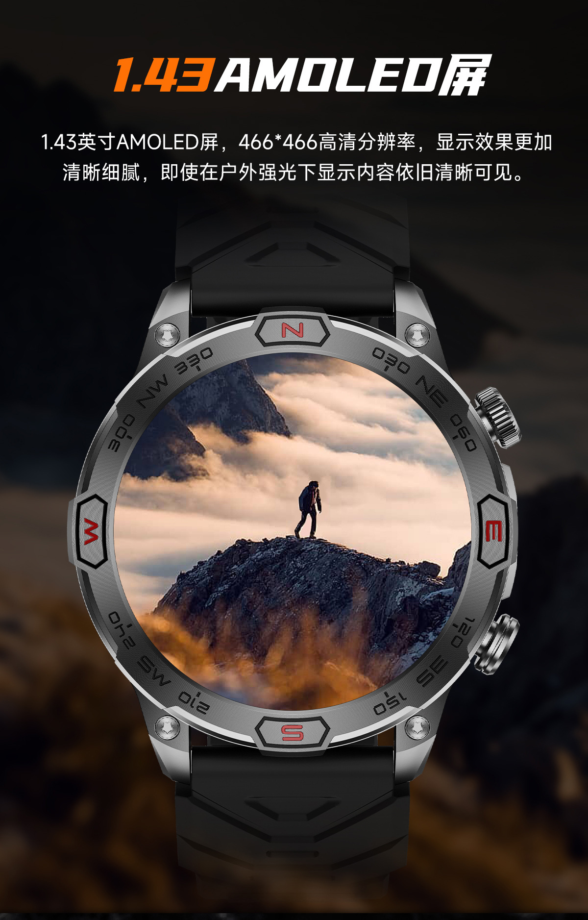 1- 1.43inch高清全触满屏 AMOLED彩屏,分辨率466*466pixel;