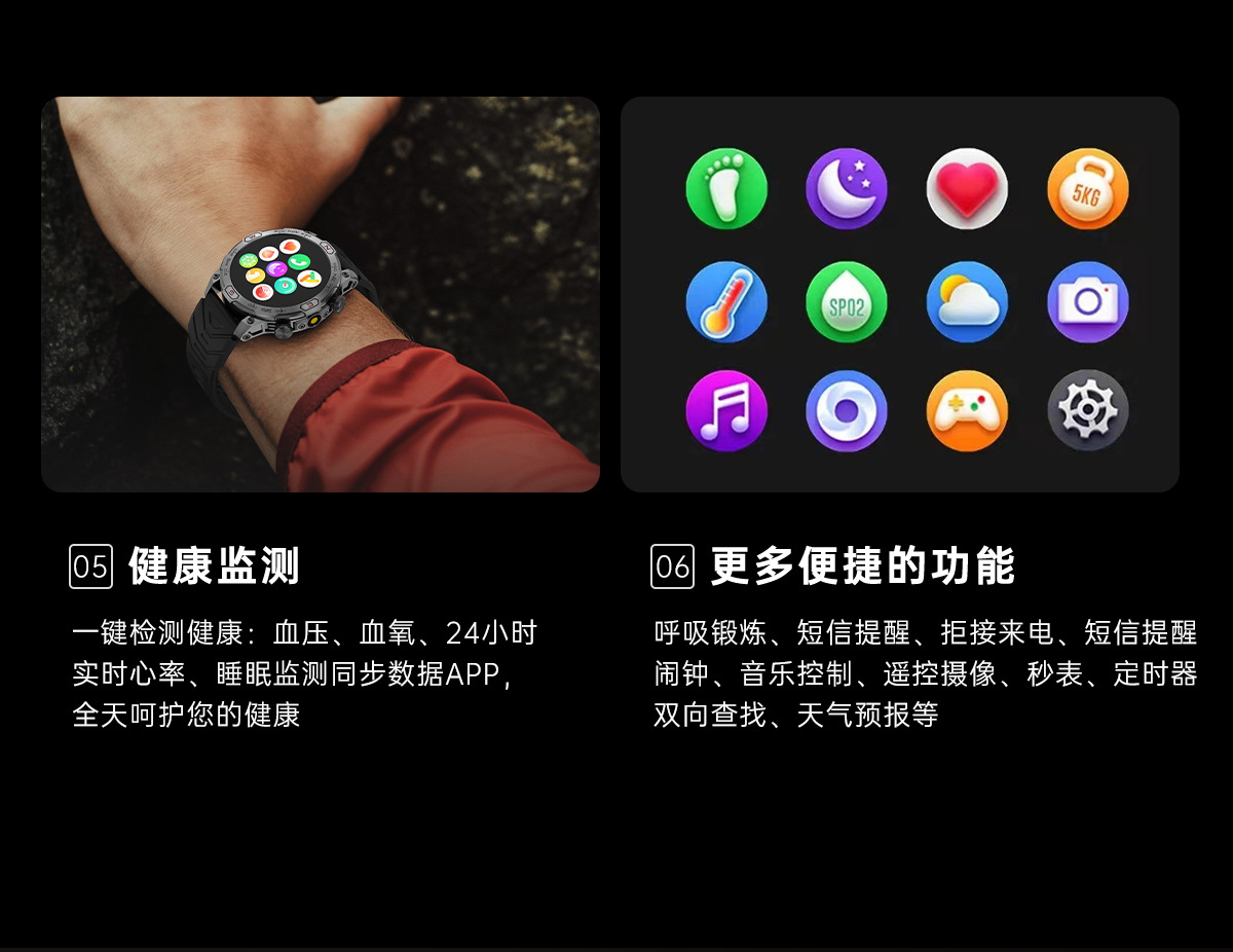 5- 拨打接听电话,蓝牙音乐,SOS一键求救,女性生理周期,天气,实时心率血氧体温监测,等