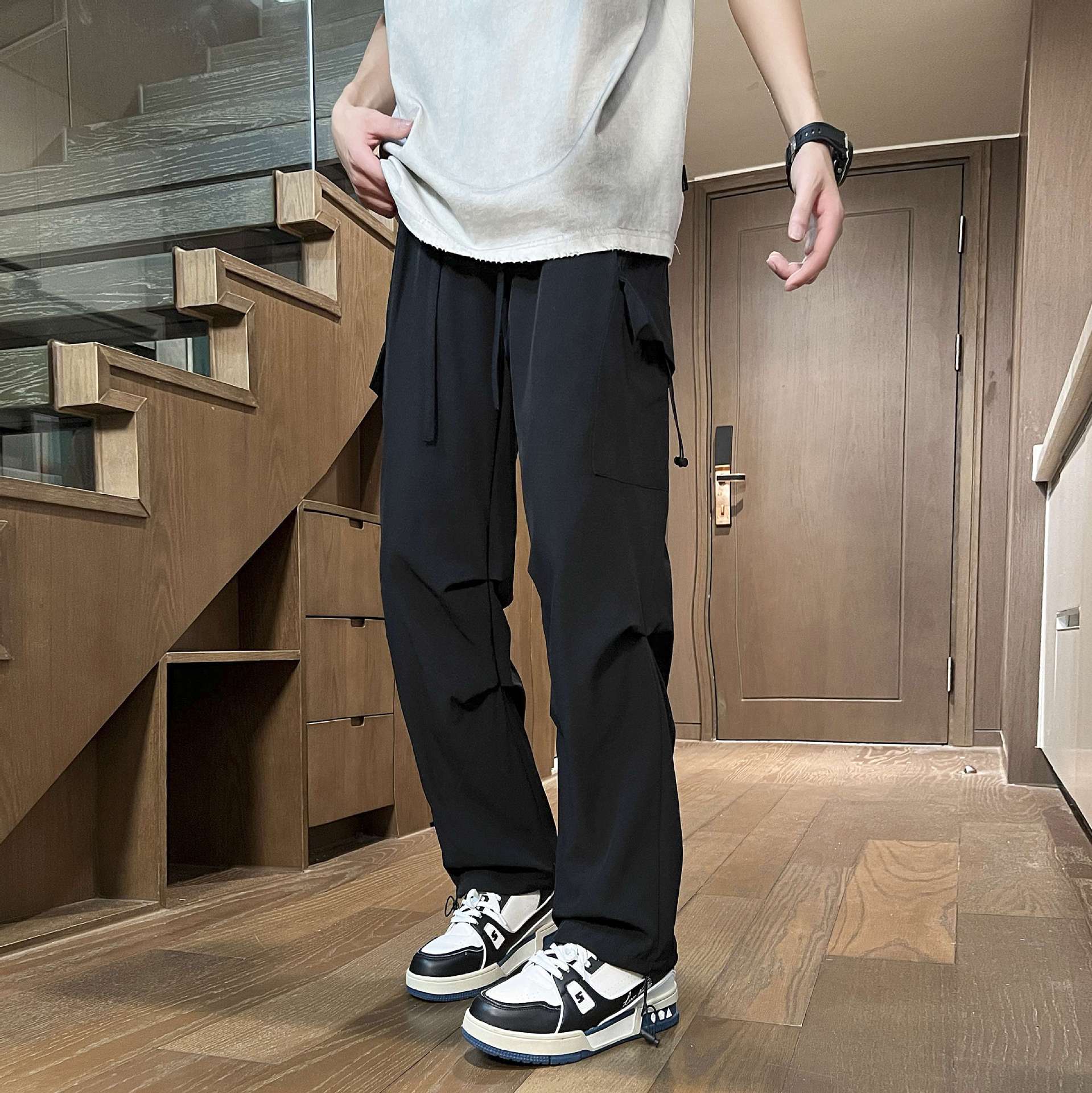 아메리칸 스타일 스포츠 바지 아이스 실크 바지 드롭 센스 느슨한 여름 품질 스트레이트 남성 캐주얼 바지 드롭 센스 마이크로 탄성 바지스토어 가기