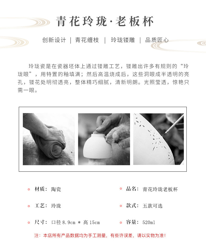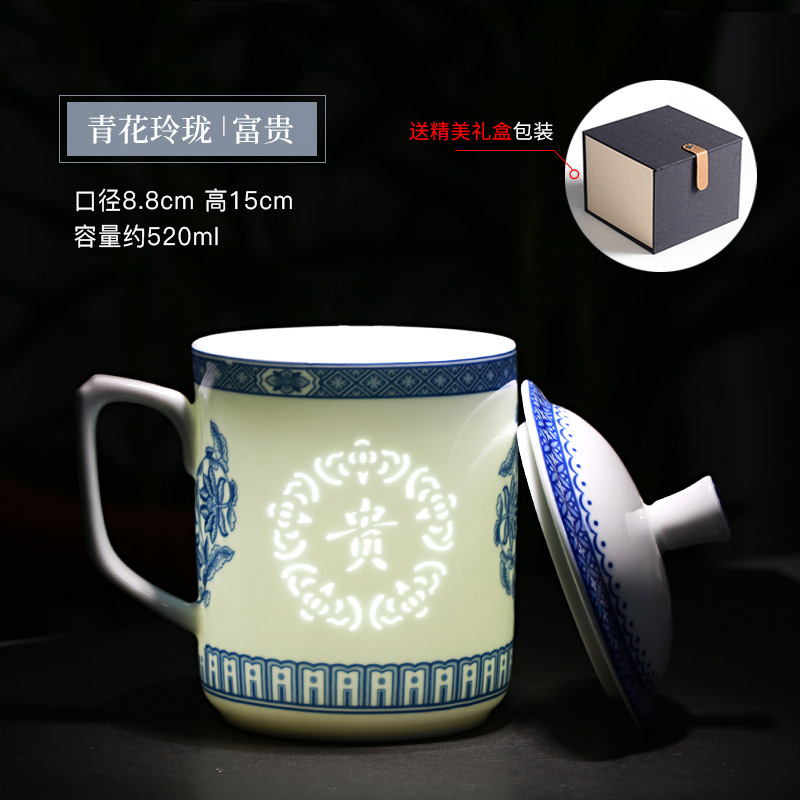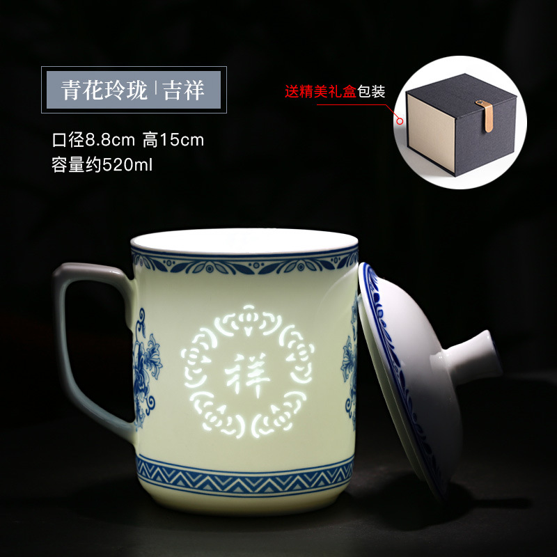 Jingdezhen Qinghua Linglong 티 컵 세라믹 뚜껑 오피스 컵 컨퍼런스 컵 가정용 워터 컵 오피스 컵 선물