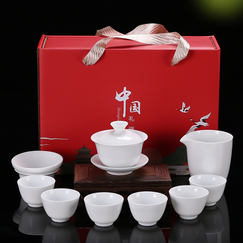 선물 상자 세라믹 쿵푸 차 세트 홈 오피스 데화 화이트 도자기 커버 그릇 티 컵 조각 로고 세트