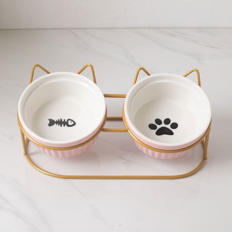 • 핑크색 이중 식기와 금색 고양이 귀 모양 기울임 받침대 세트 --- 특가 상품