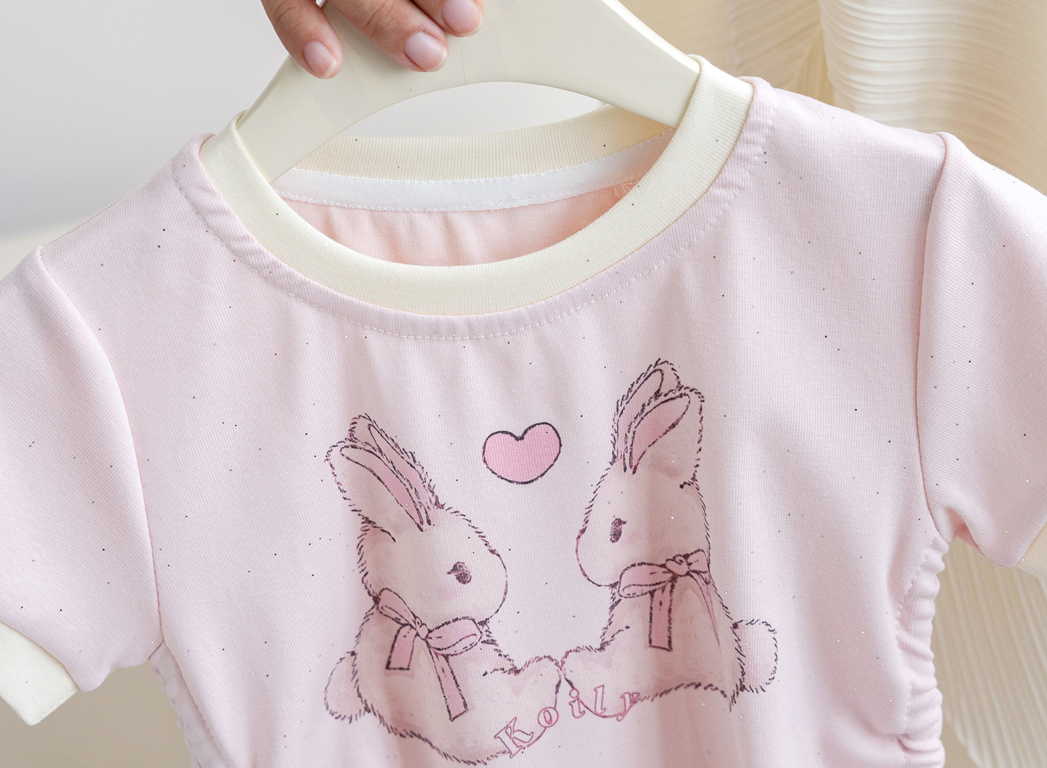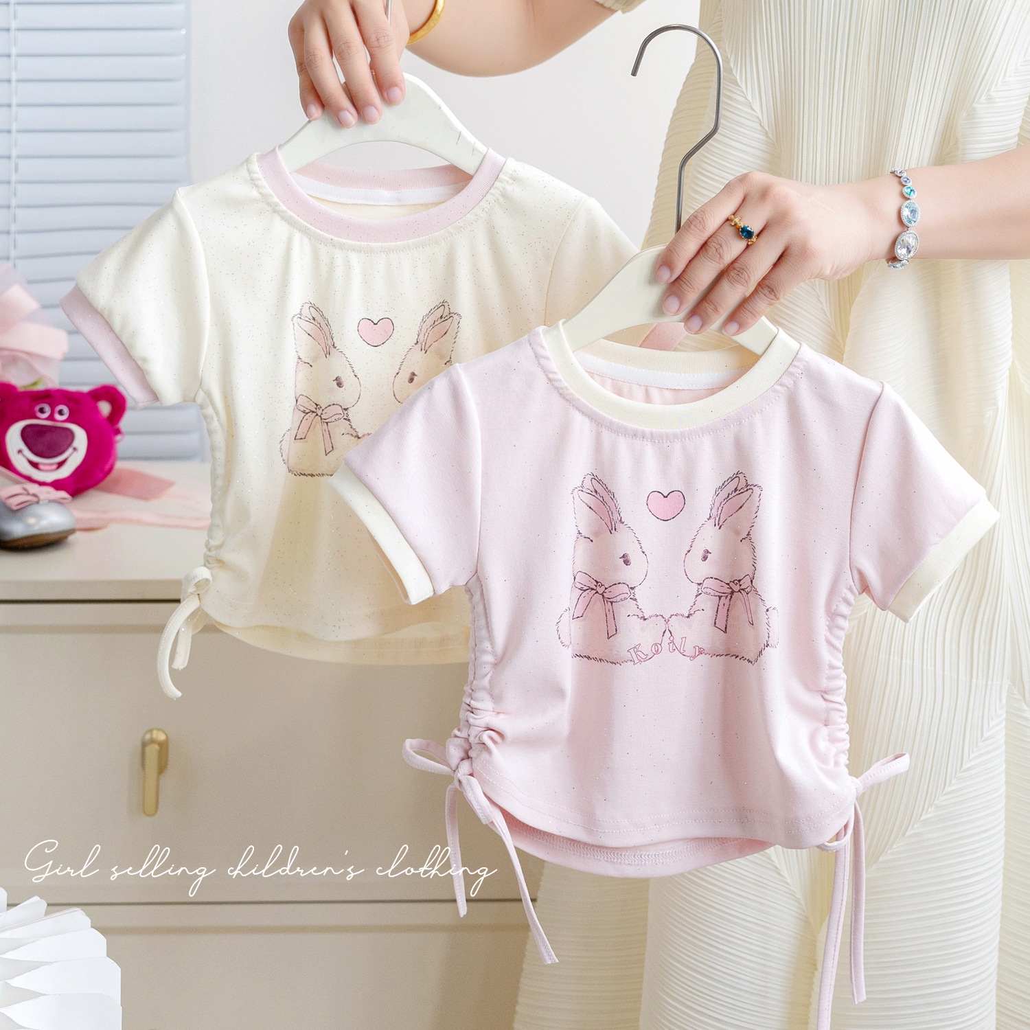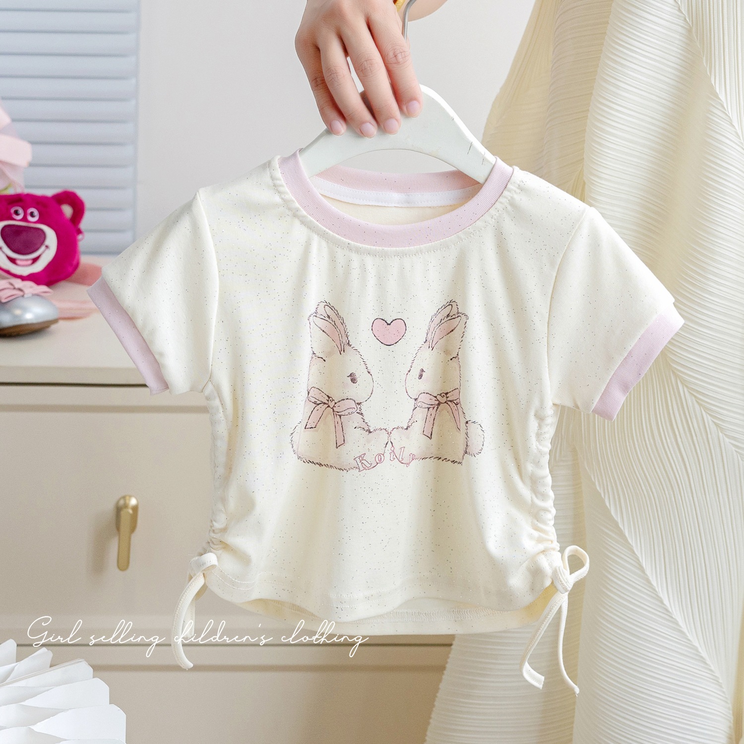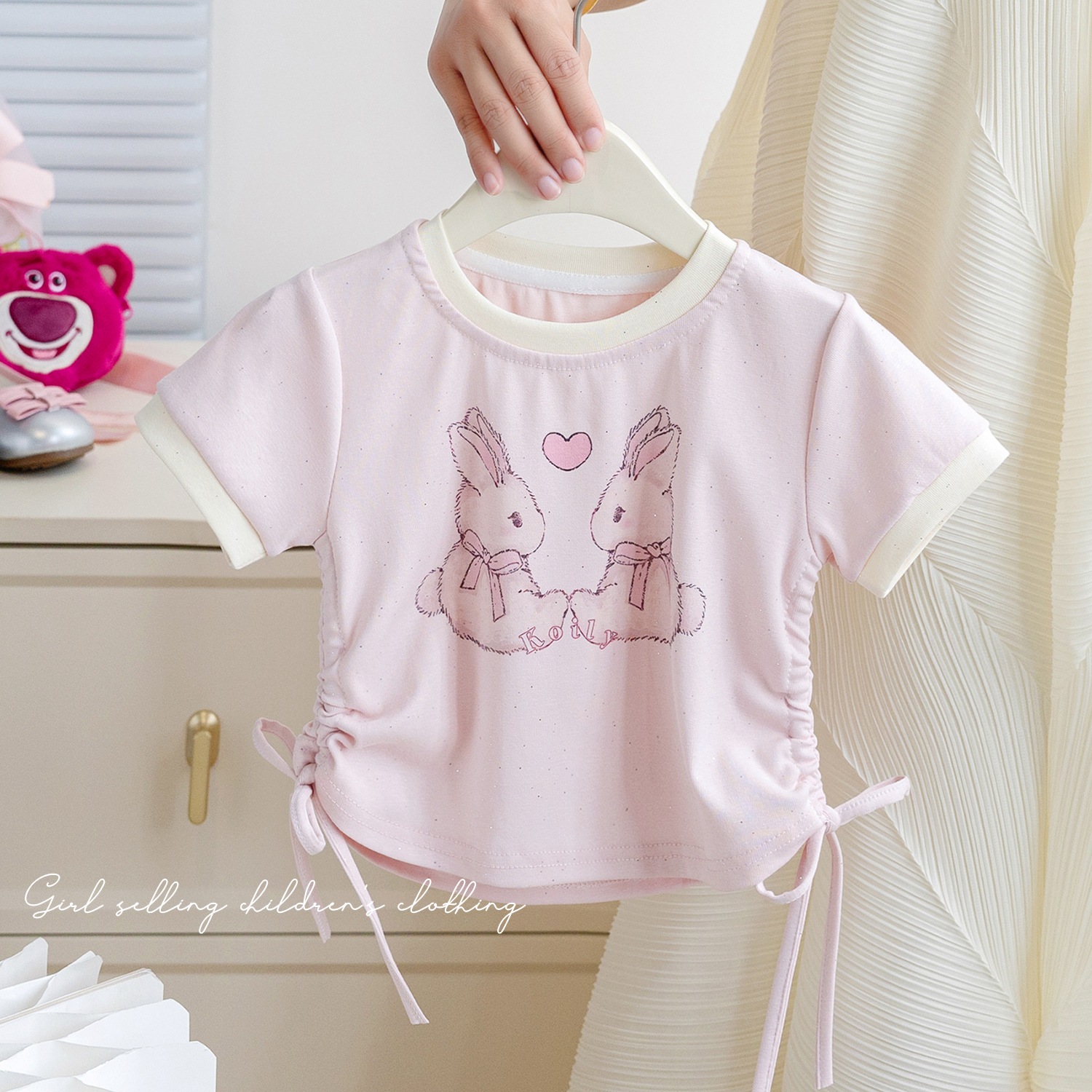 여자 여름 반소매 한국 스타일 2024 새로운 어린이 단색 만화 티셔츠 여성 아기 끈 반소매 최고 트렌디스토어 가기