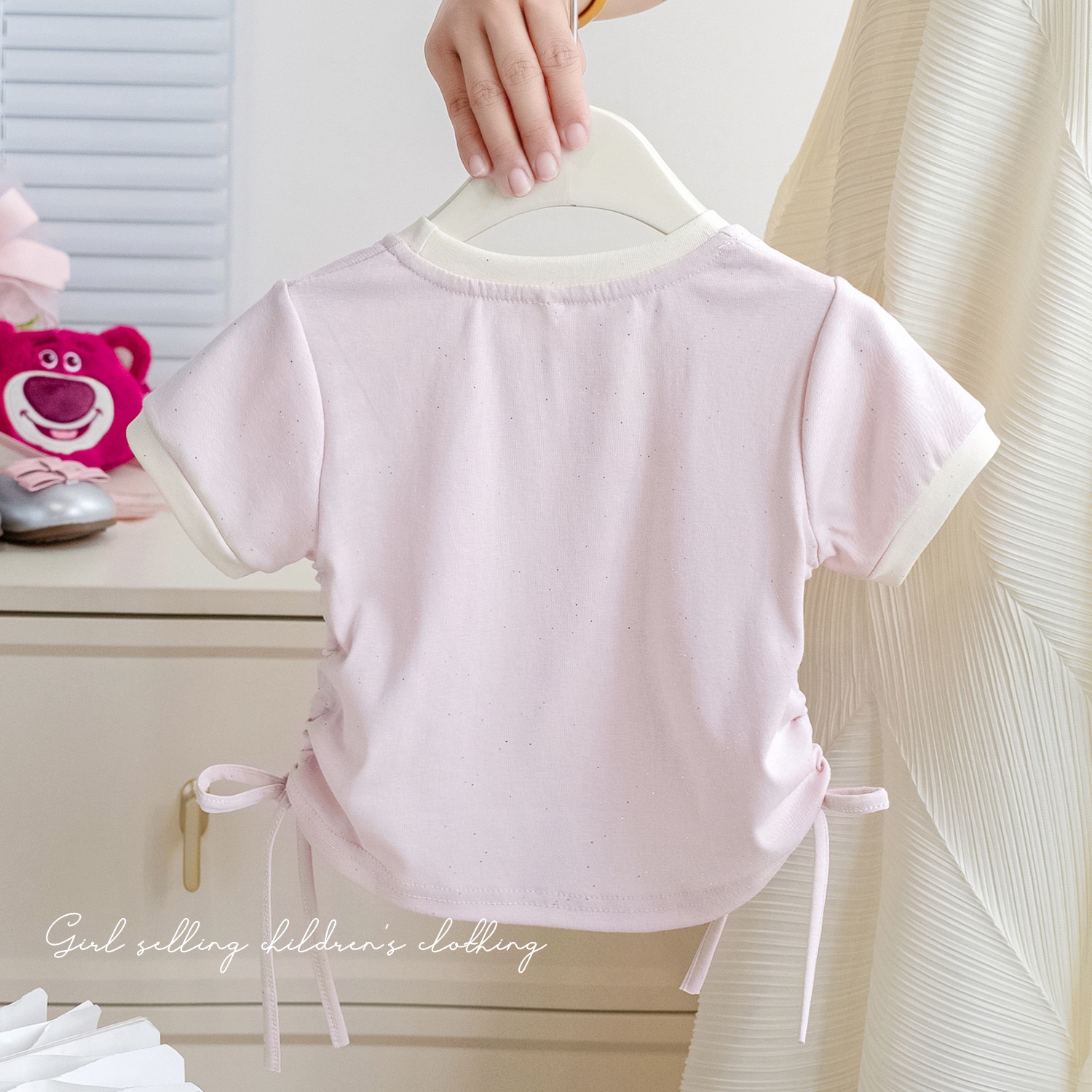 여자 여름 반소매 한국 스타일 2024 새로운 어린이 단색 만화 티셔츠 여성 아기 끈 반소매 최고 트렌디