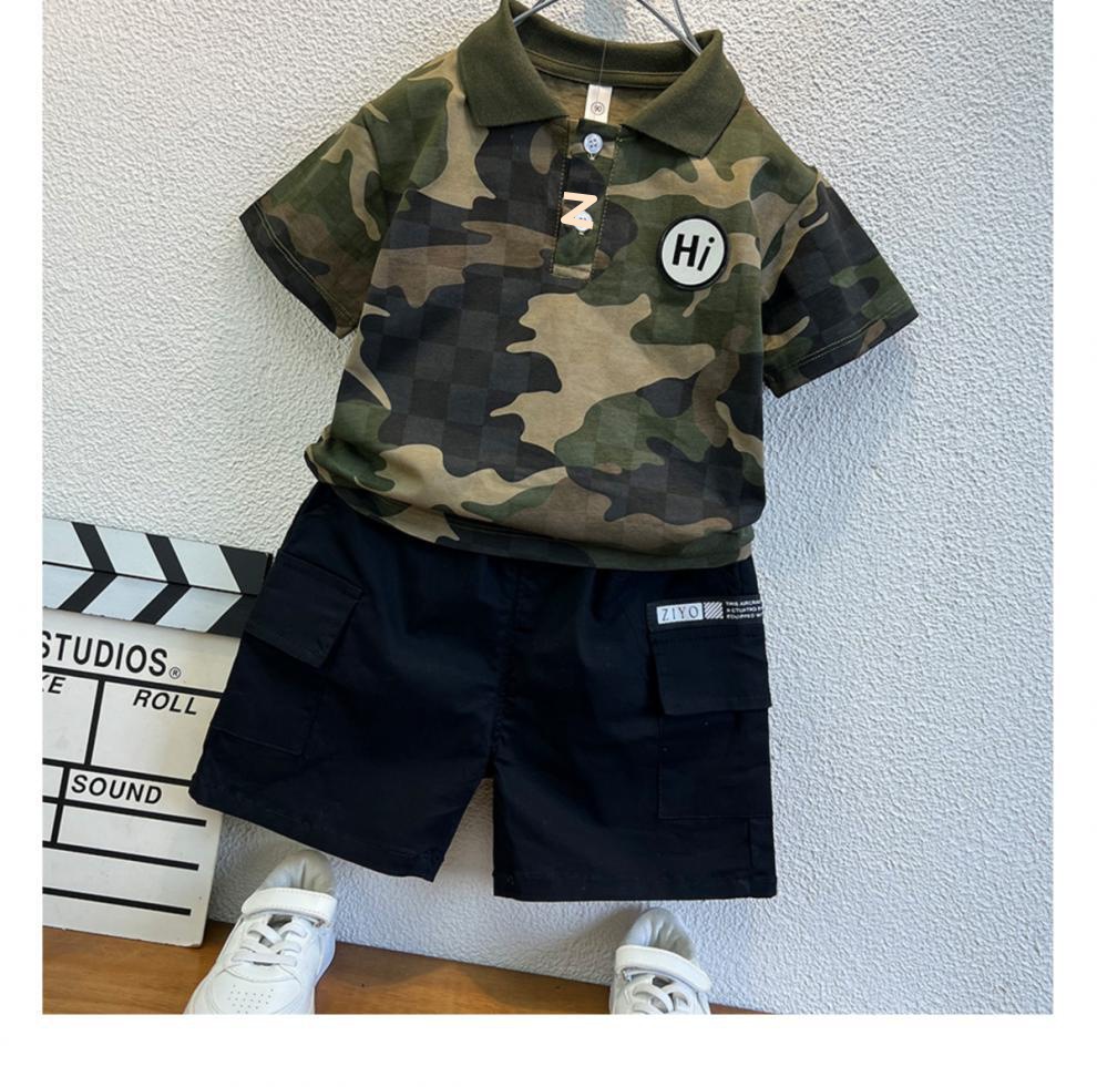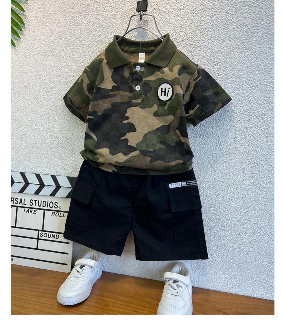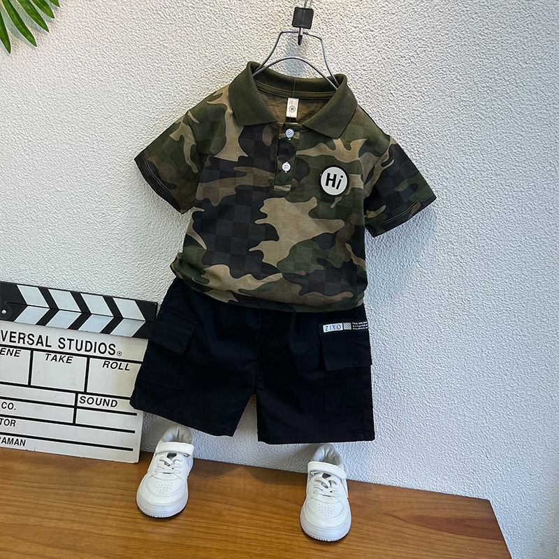 소년 위장 반팔 티셔츠 여름 2024 새로운 러피 잘 생긴 어린이 아기 여름 옷 옷깃 튀긴 거리 세트스토어 가기
