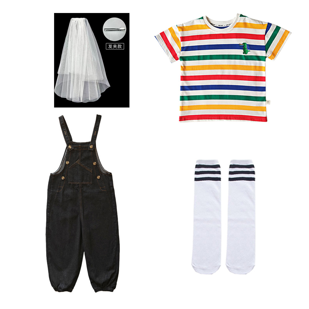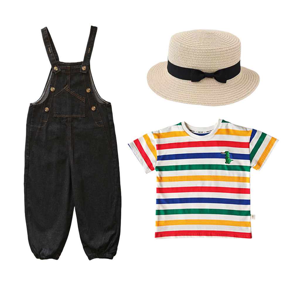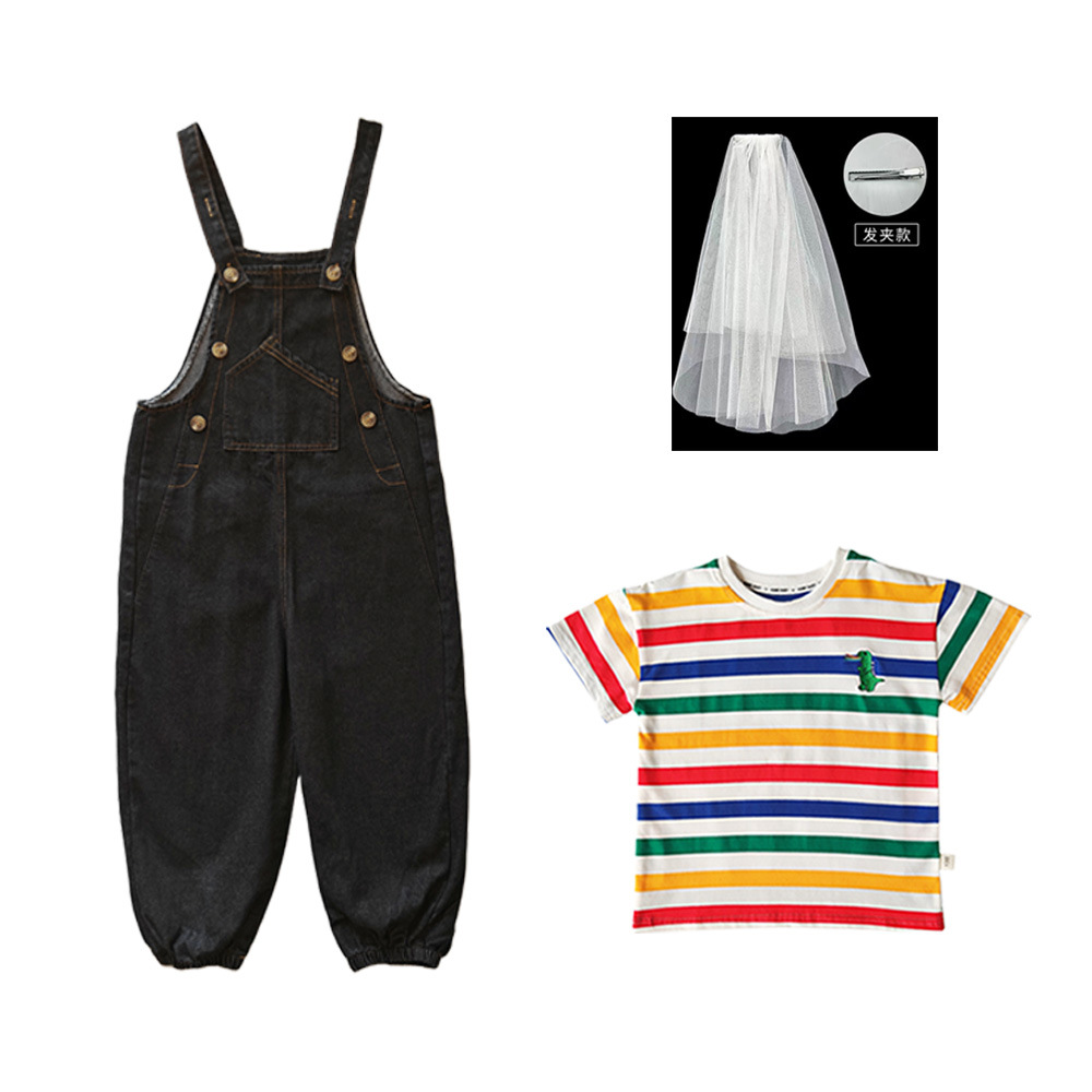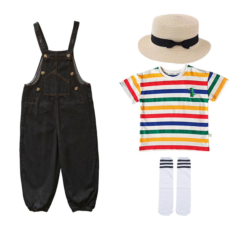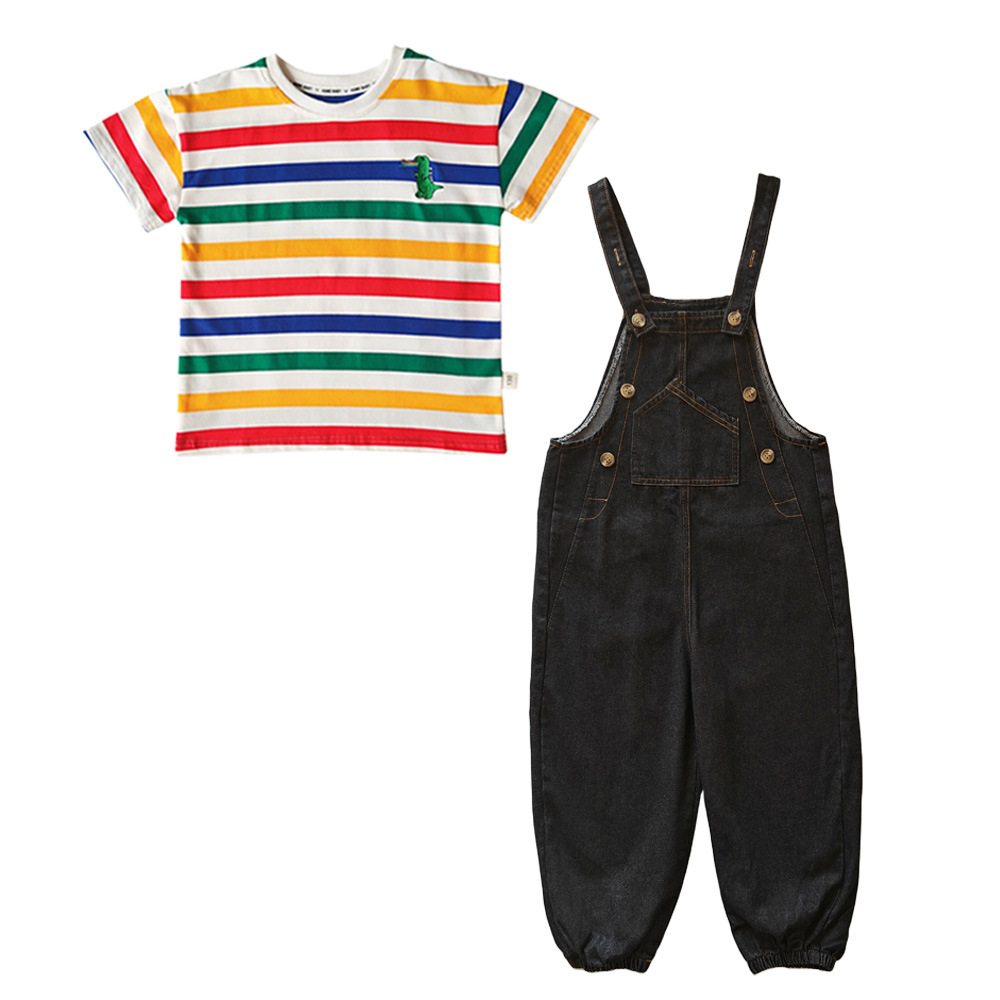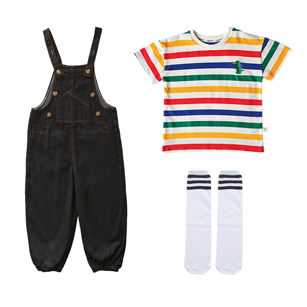 유치원 의류 어린이 여름 무지개 줄무늬 반팔 블랙 스트랩 롱 바지 클래스 의류 서양식 6 일 댄스스토어 가기
