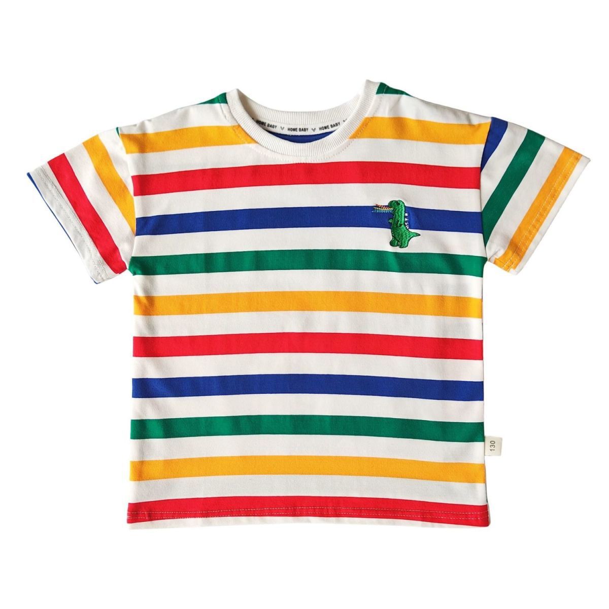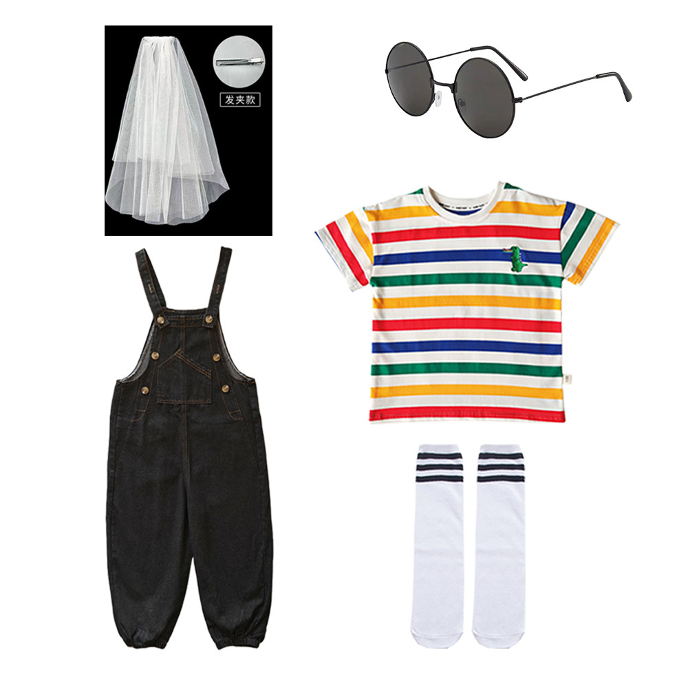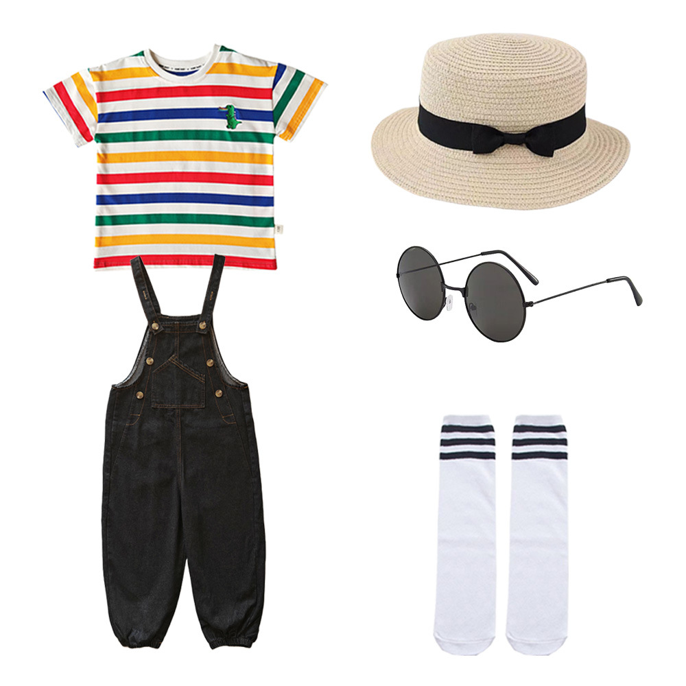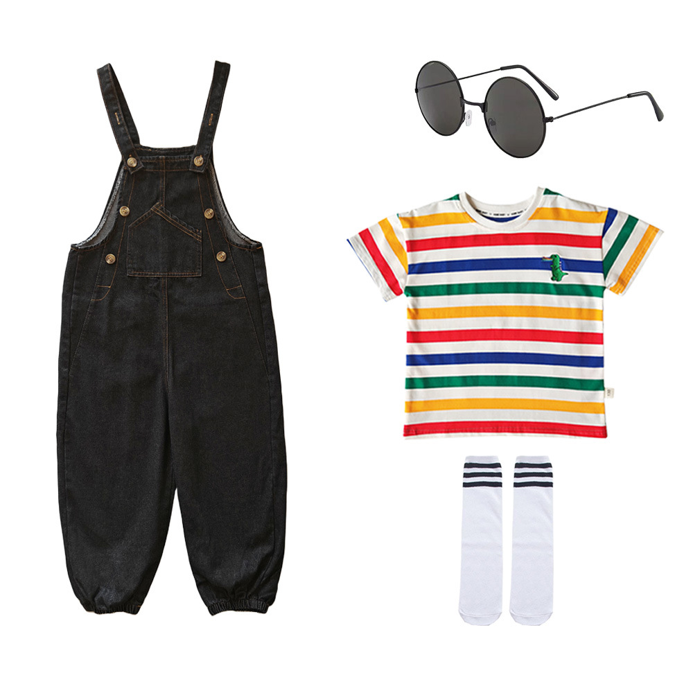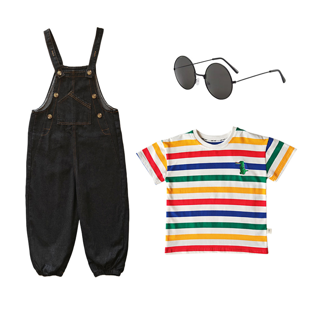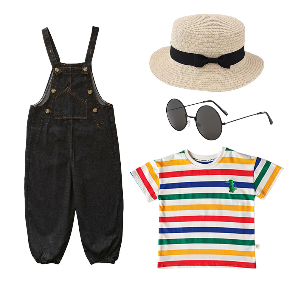 유치원 의류 어린이 여름 무지개 줄무늬 반팔 블랙 스트랩 롱 바지 클래스 의류 서양식 6 일 댄스스토어 가기
