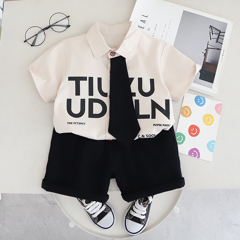 2024 년 여름 새 소년 넥타이 옷깃 셔츠 짧은 소매 세트 소년 아기 캐주얼 반바지 투피스 세트