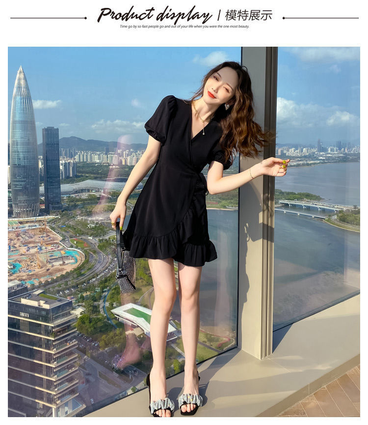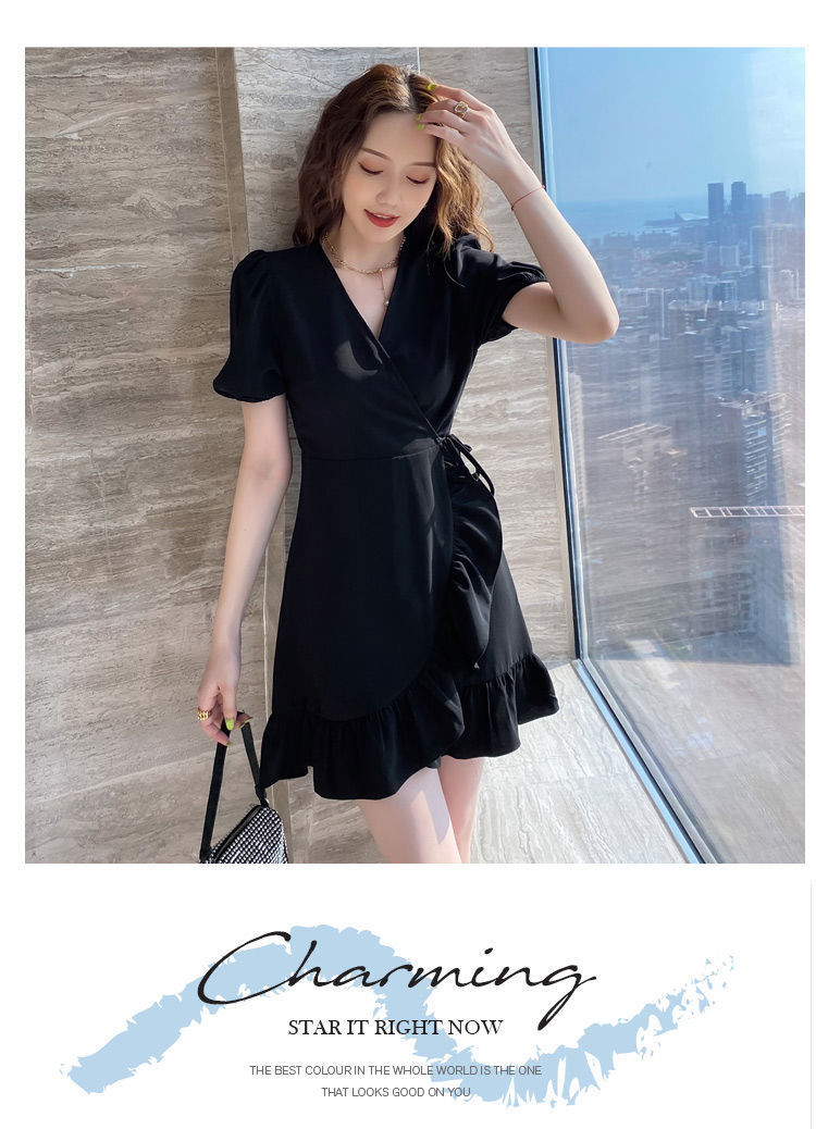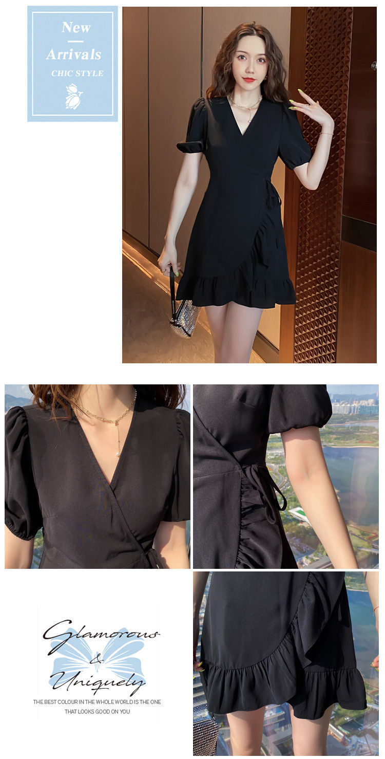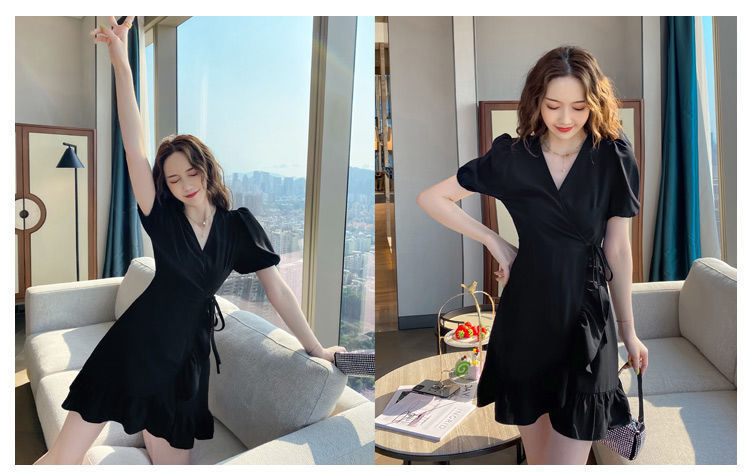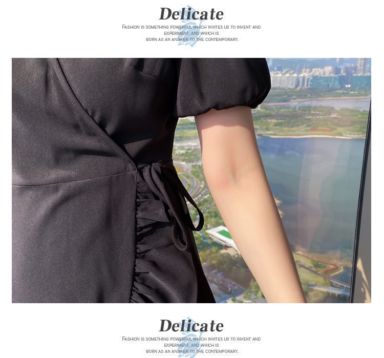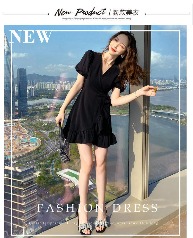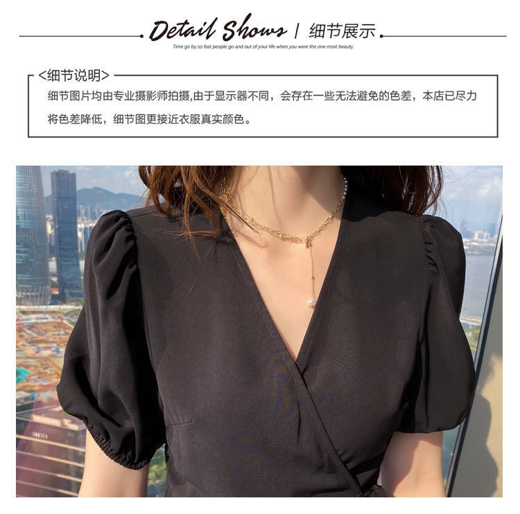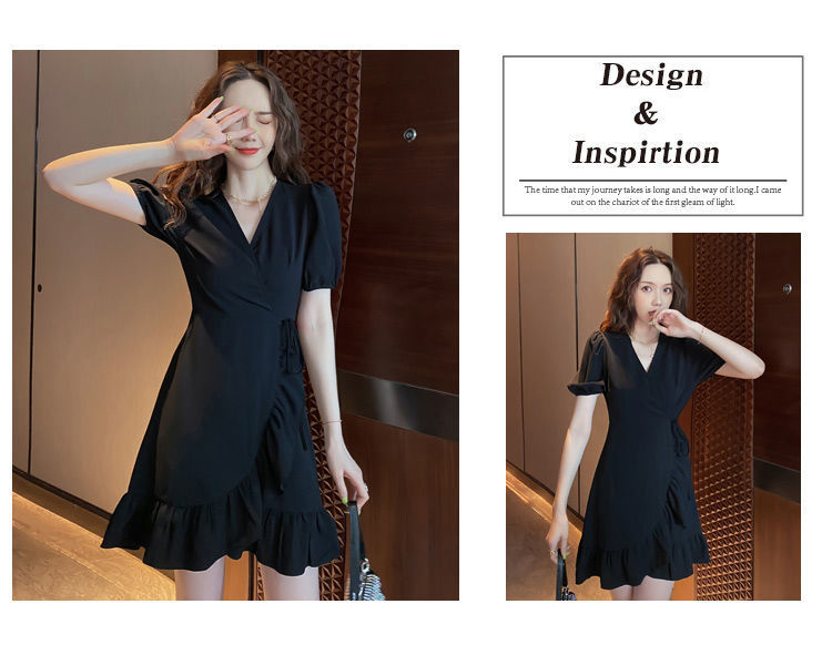 프랑스 퍼프 슬리브 원피스 여성 여름 2024 새로운 스타일 작은 하이 엔드 슬리밍 러플 블랙 스커트스토어 가기