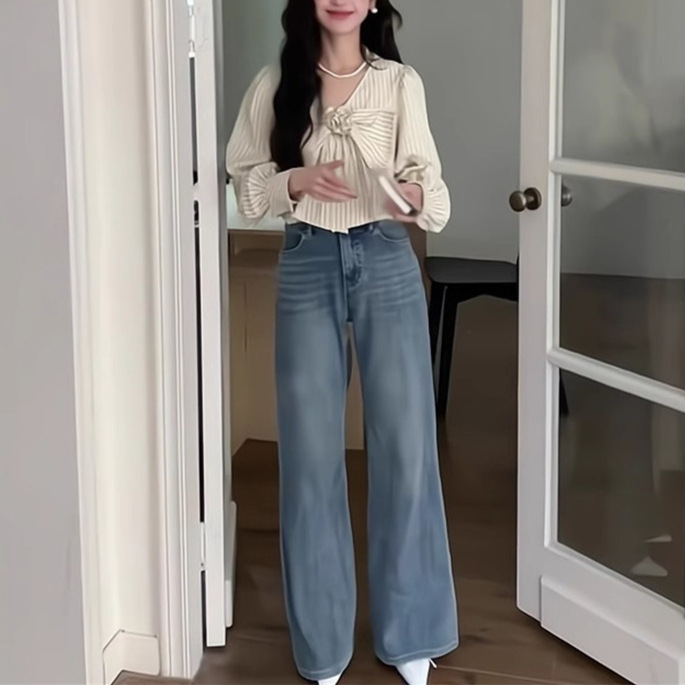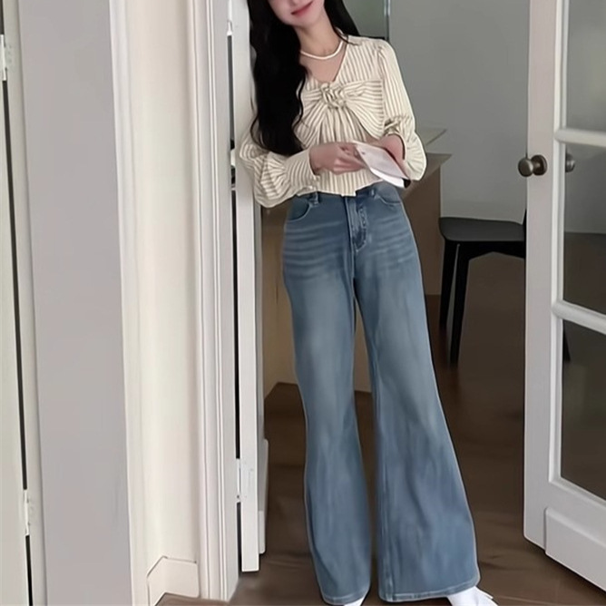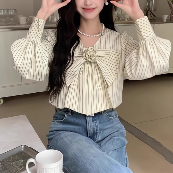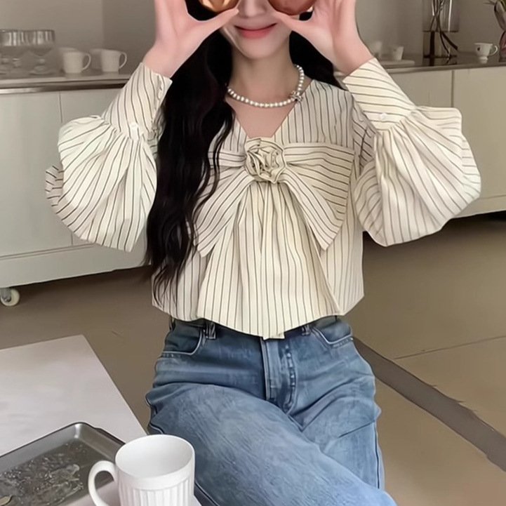 우유 노란색 줄무늬 V 넥 활 긴팔 쉬폰 셔츠 여성의 여름 선 스크린 셔츠 디자인 틈새스토어 가기