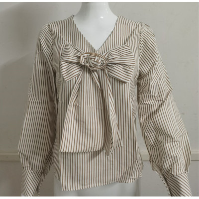 우유 노란색 줄무늬 V 넥 활 긴팔 쉬폰 셔츠 여성의 여름 선 스크린 셔츠 디자인 틈새