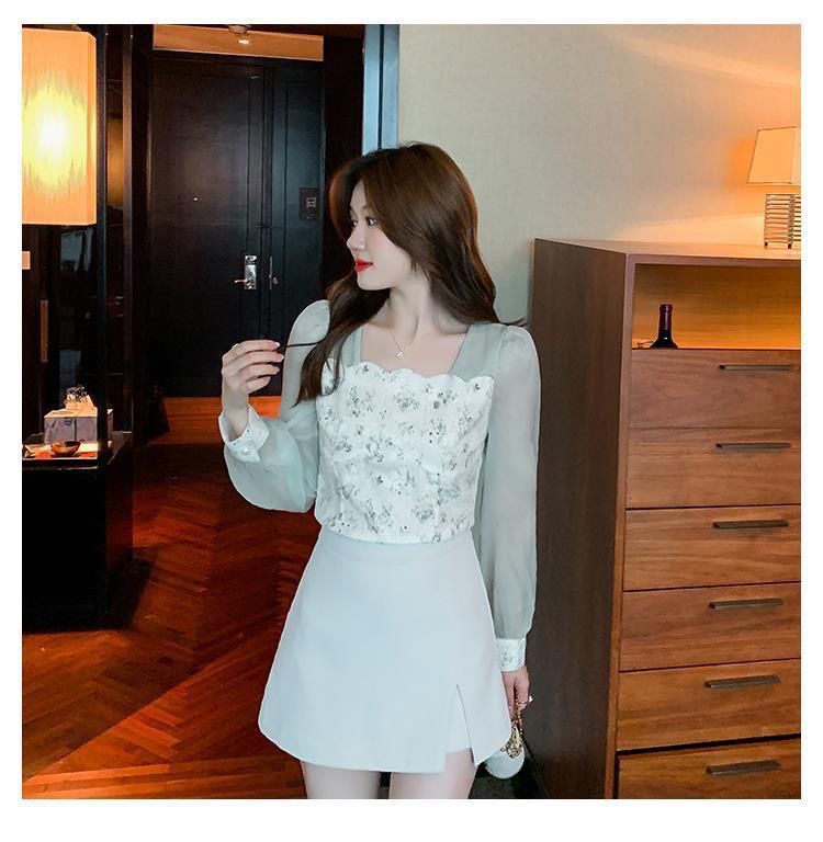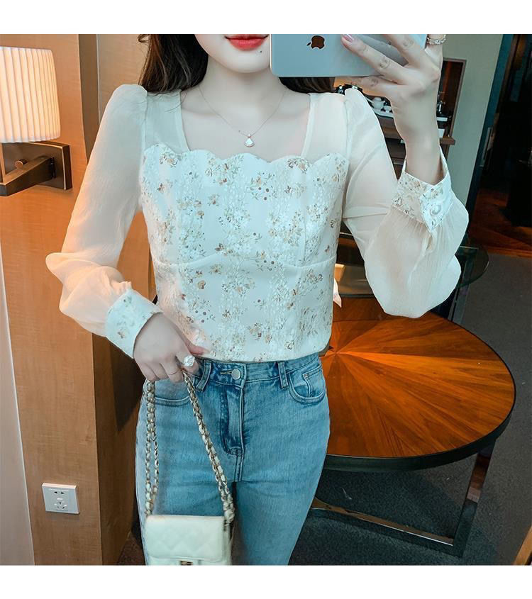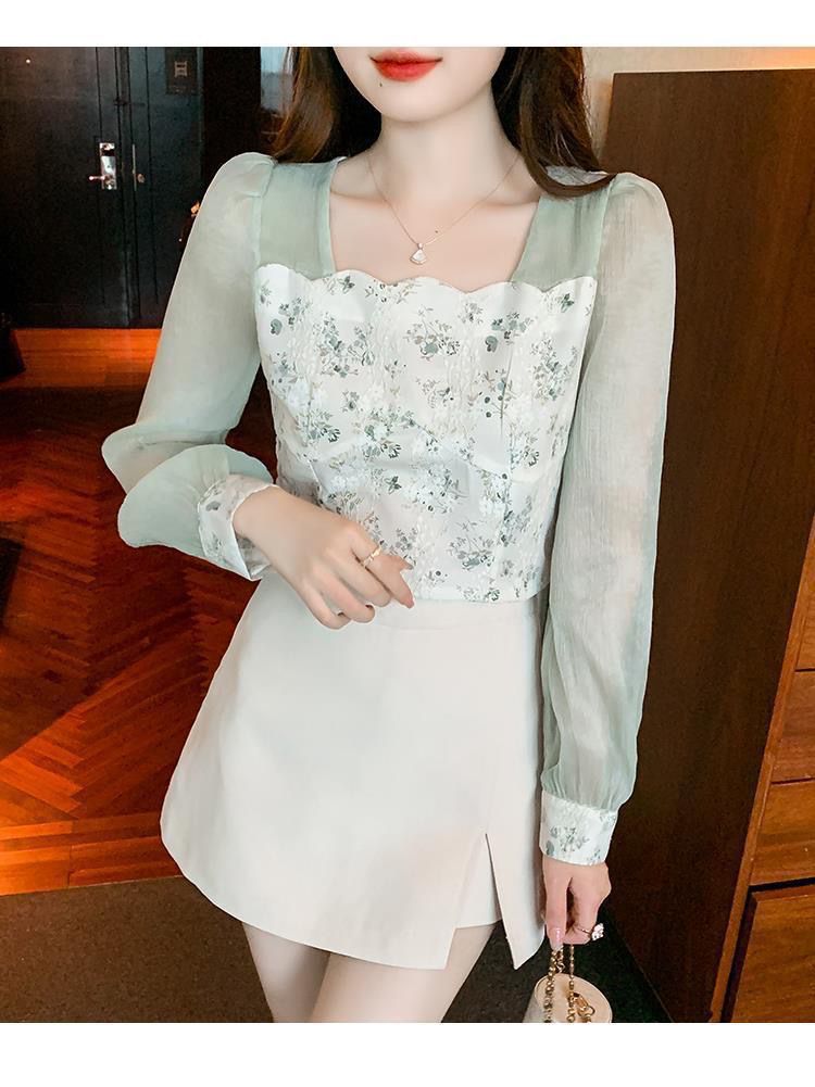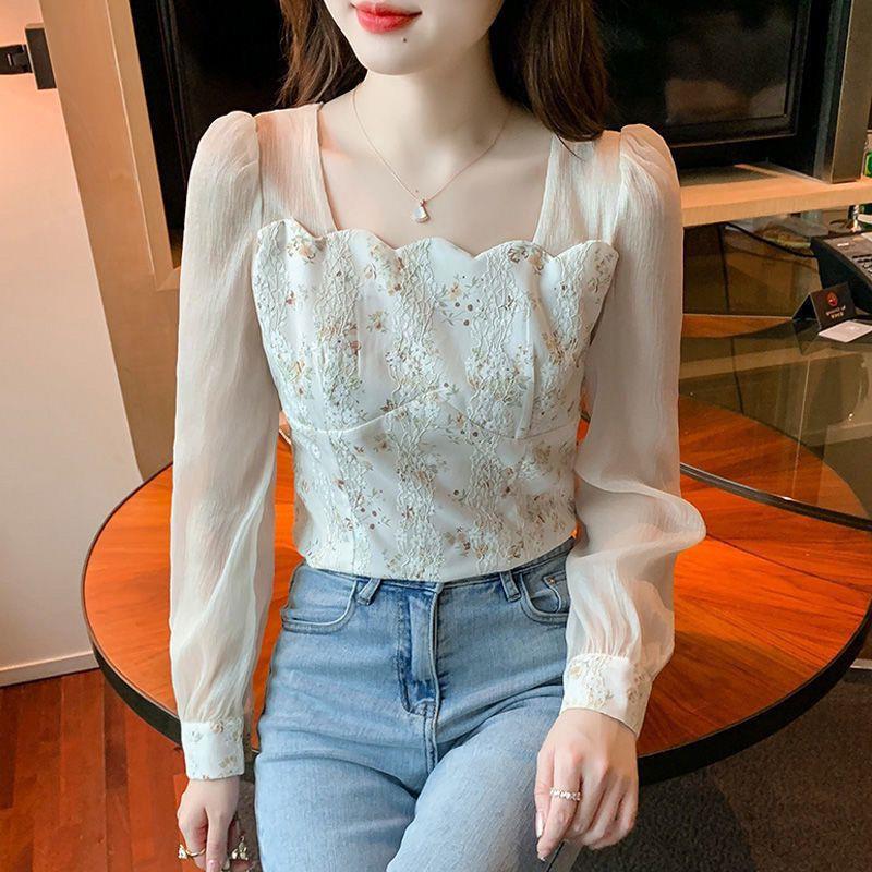 레이스 바느질 쉬폰 셔츠 여성의 2024 봄 새로운 신선한 달콤한 광장 칼라 세련된 꽃 탑 작은 셔츠스토어 가기