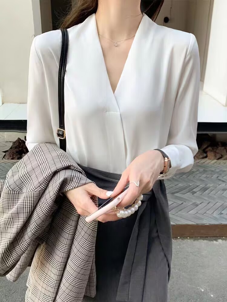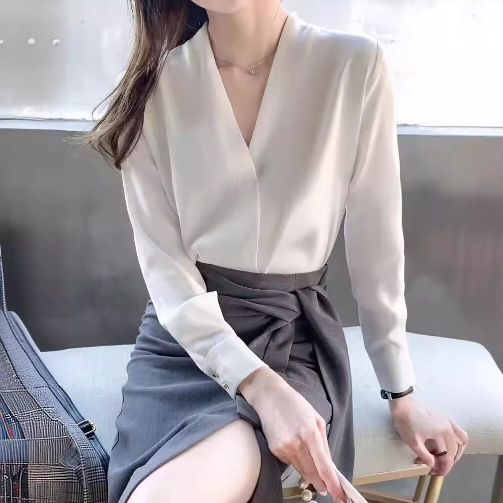 콜라리스 화이트 셔츠 여성 작업 의류 최고 가을 스타일 우아한 V-넥 전문 긴 소매 셔츠스토어 가기