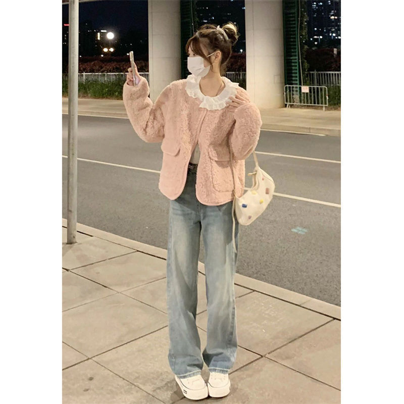 높은 허리 직선 다리 청바지 여성의 2023 새로운 작은 슬림 미국 폭발 가을과 겨울 기모 넓은 다리 바지