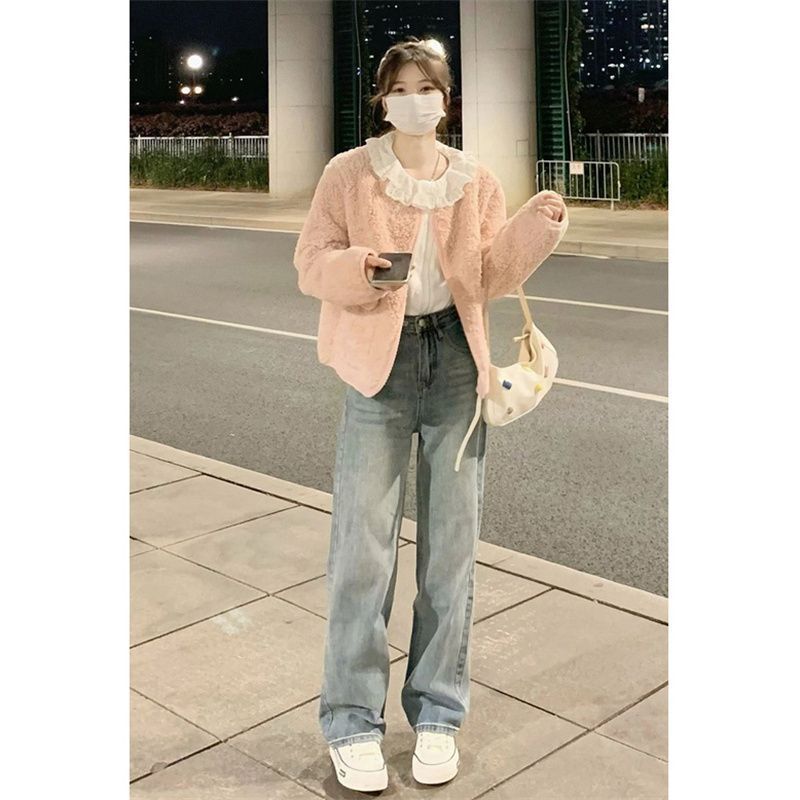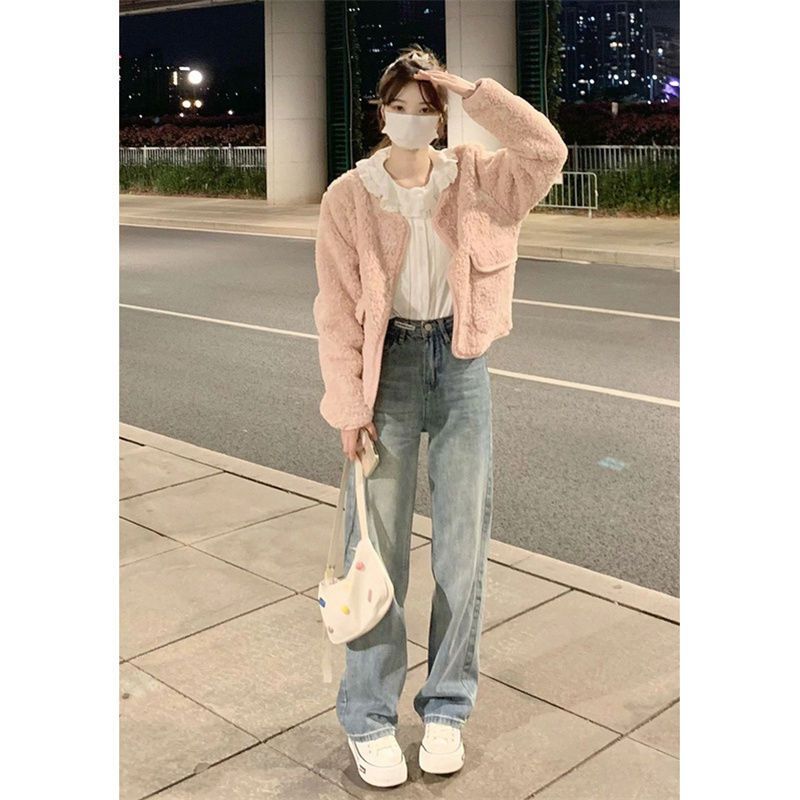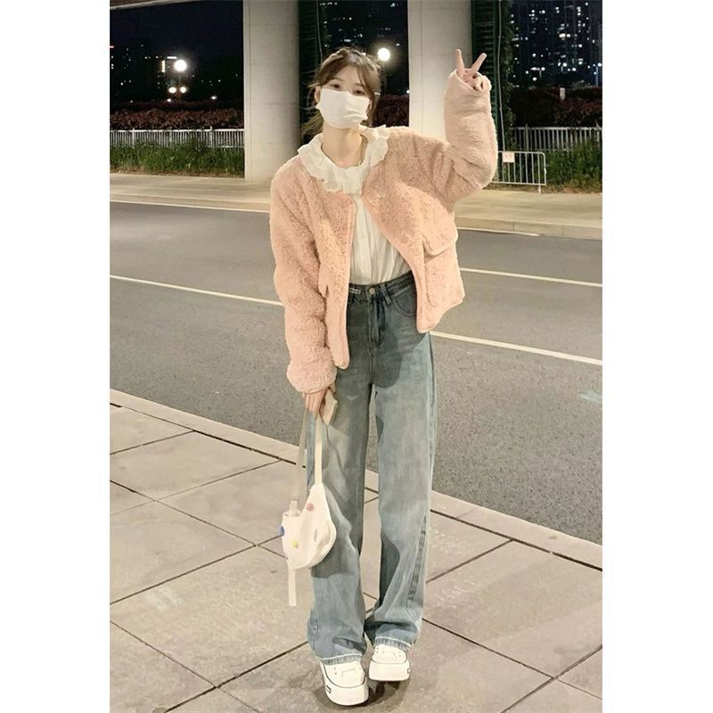 높은 허리 직선 다리 청바지 여성의 2023 새로운 작은 슬림 미국 폭발 가을과 겨울 기모 넓은 다리 바지스토어 가기