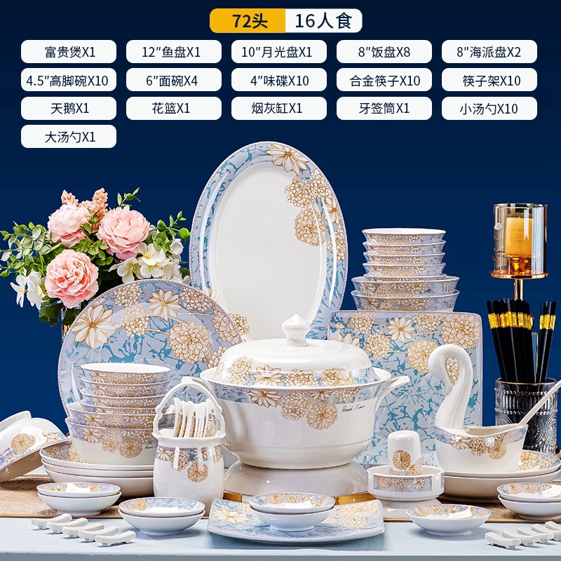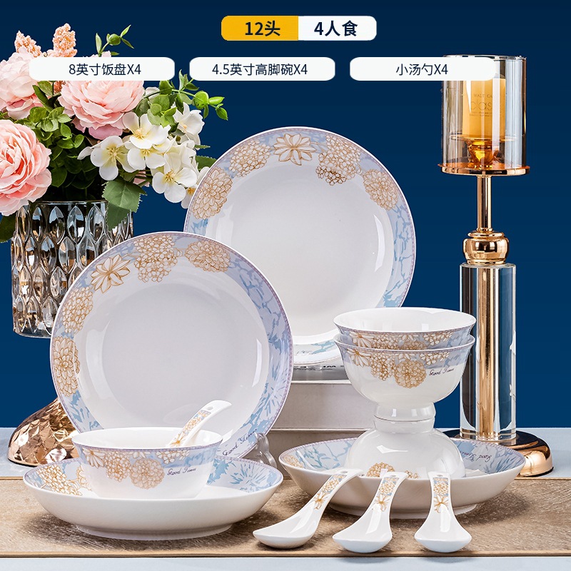 세라믹 요리 도매 Jingdezhen 뼈 중국 식기 세트 요리 젓가락 조합 가구 선물 높은 색상 가치의 전체 세트스토어 가기