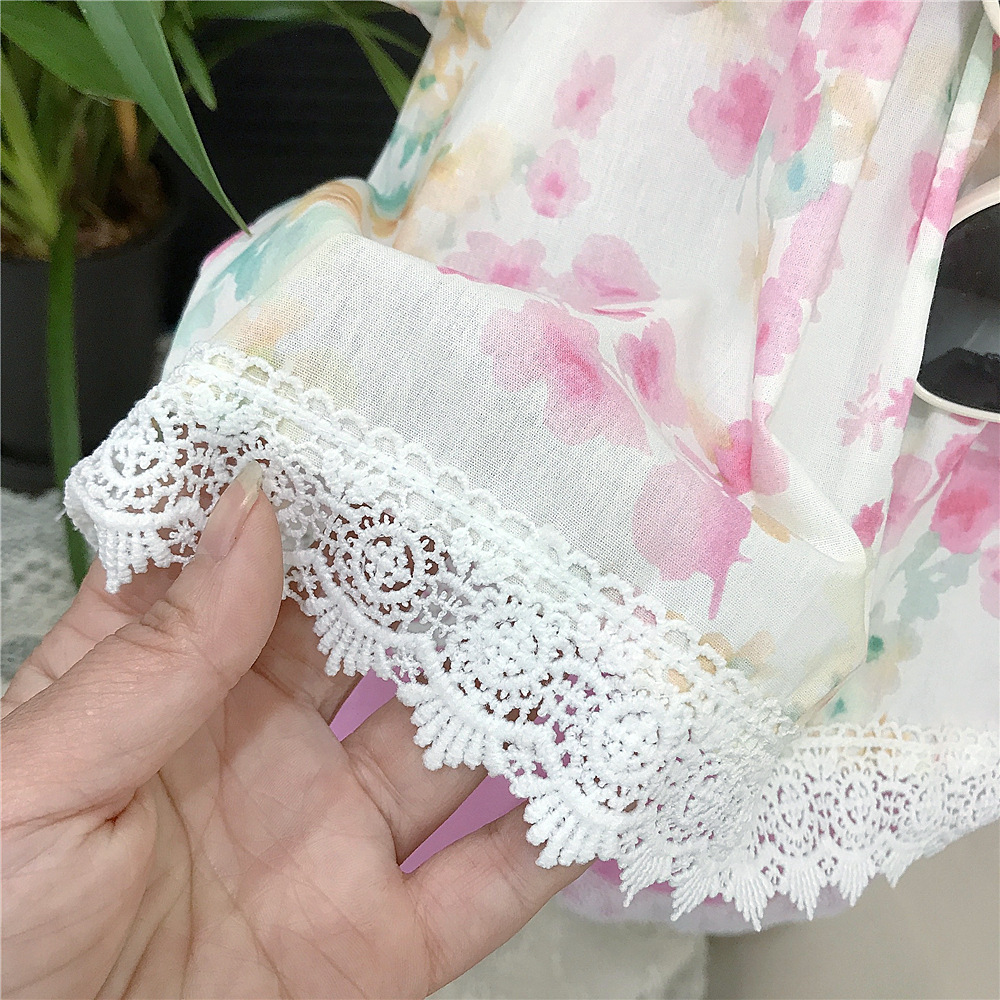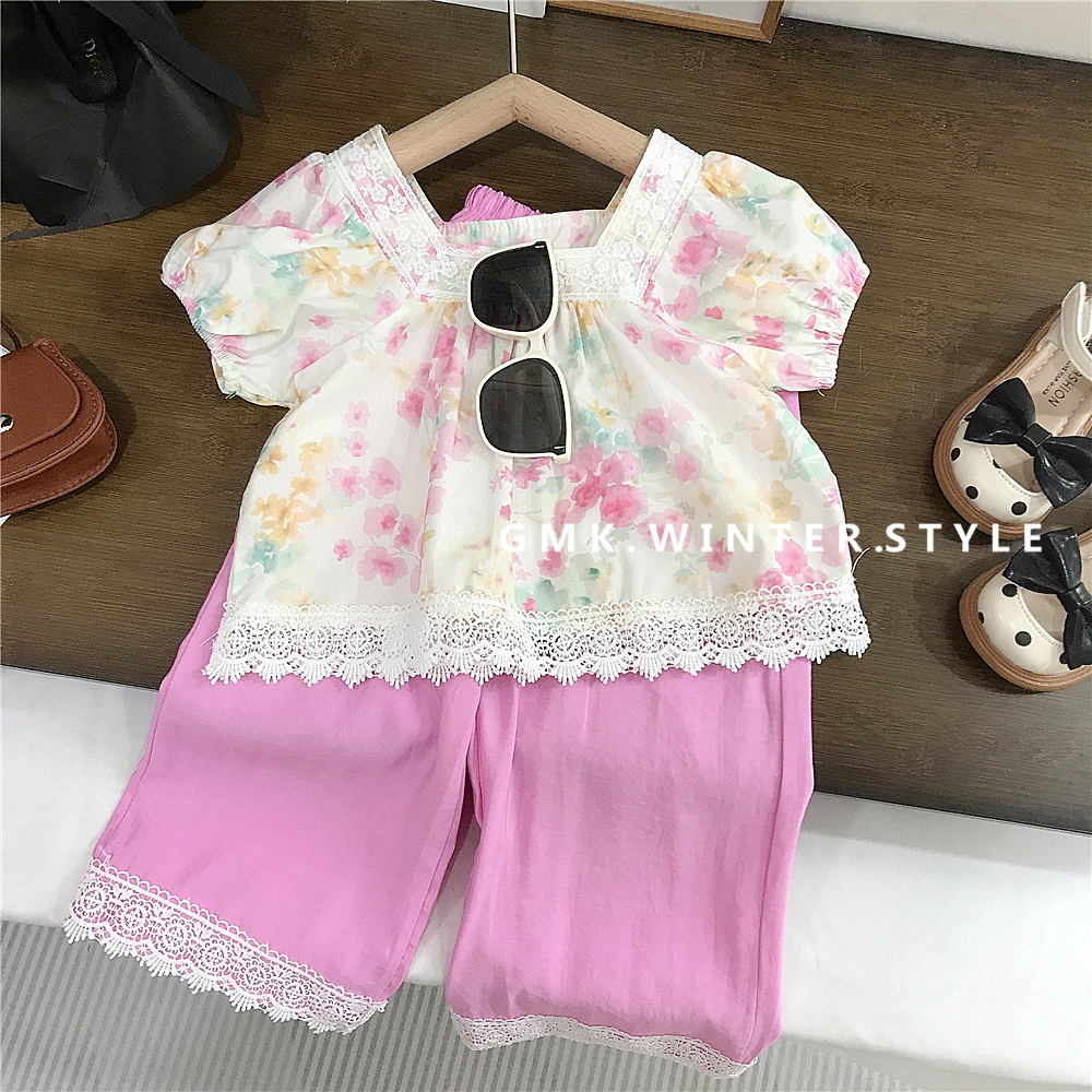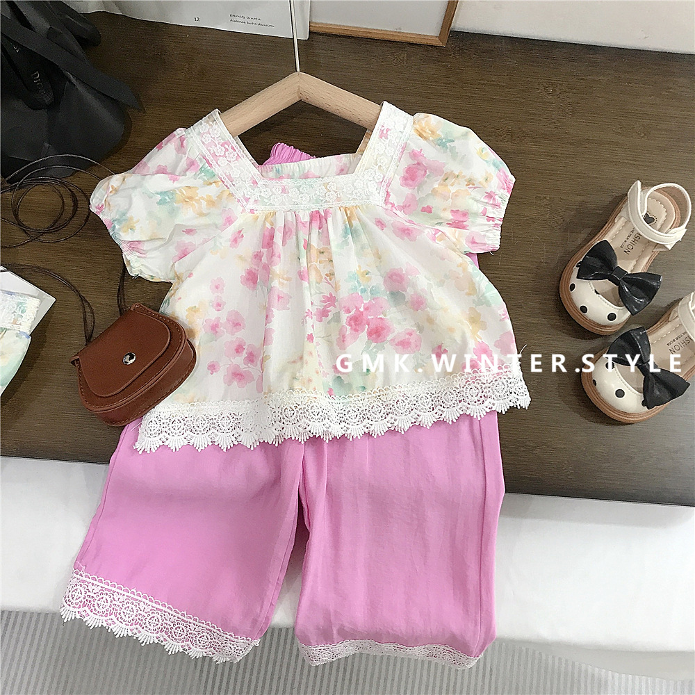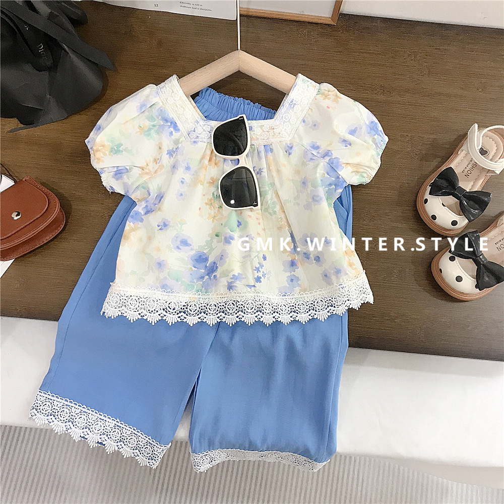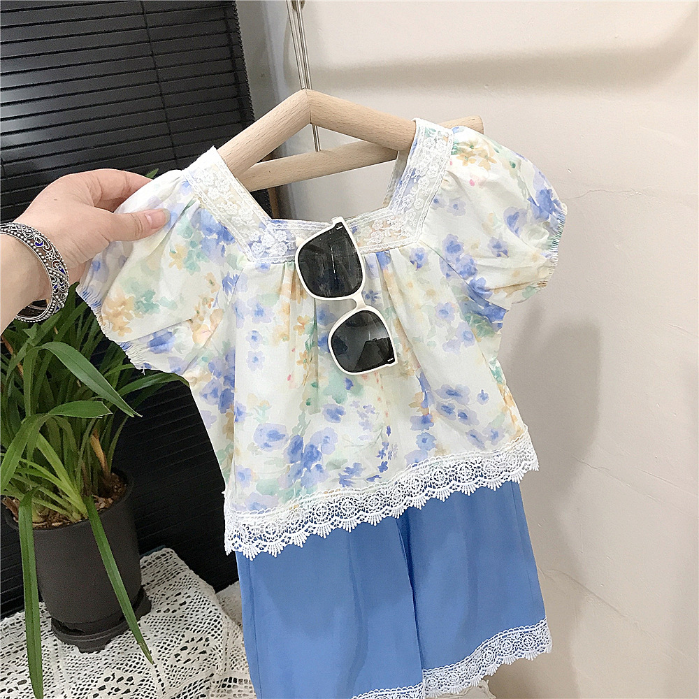 소녀 세련된 패션 여름 옷 새로운 인터넷-유명한 어린이 달콤한 꽃 레이스 세트 얇은 반팔 옷 대외 무역스토어 가기