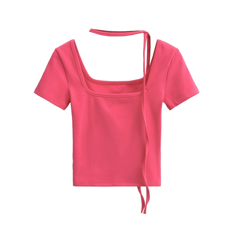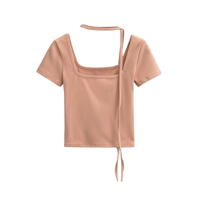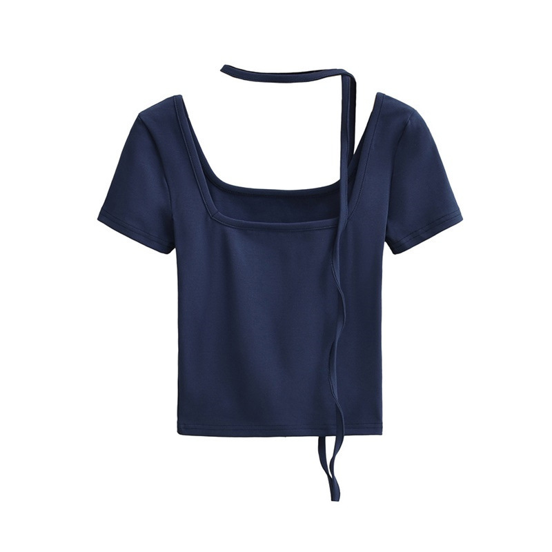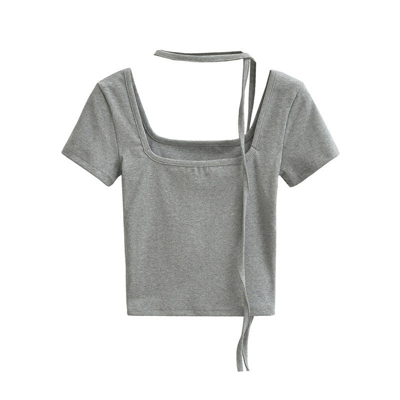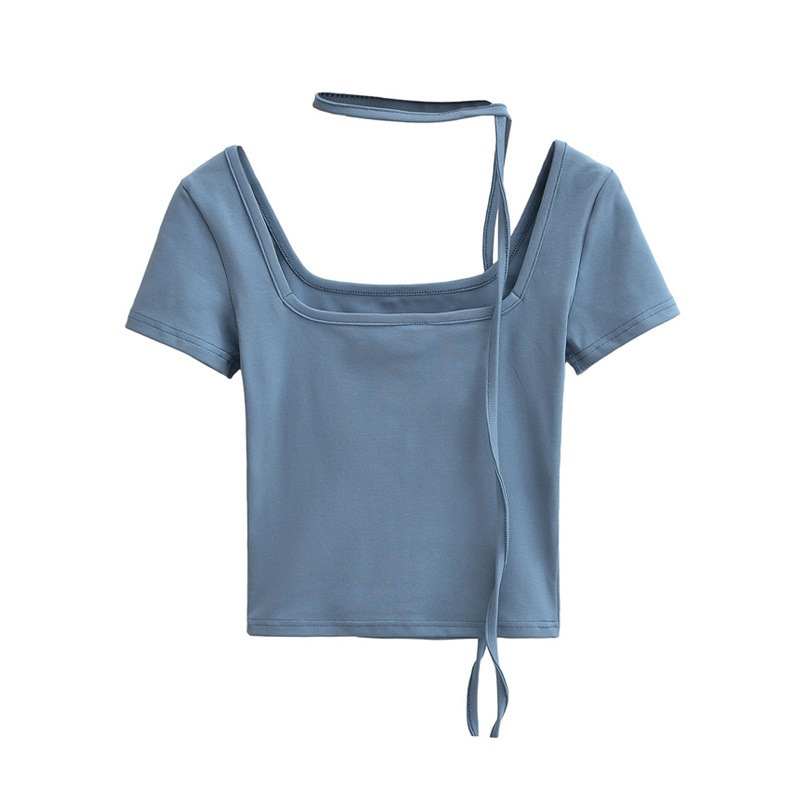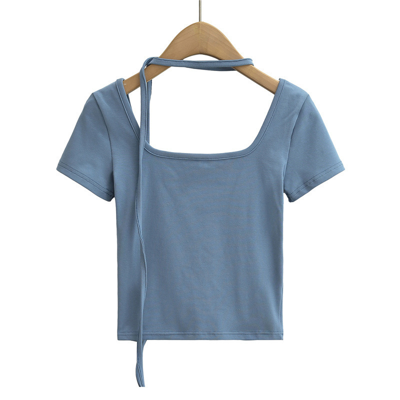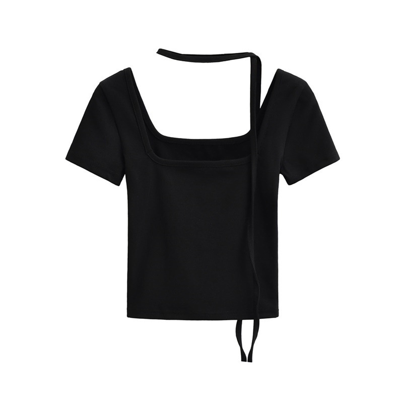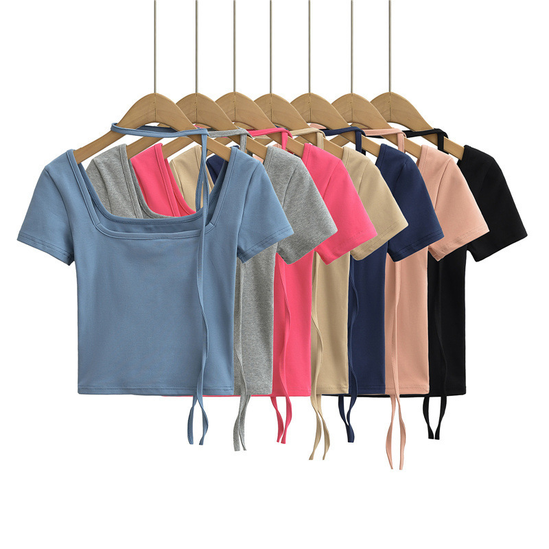 퓨어 스파이스 걸 스퀘어 칼라 반팔 티셔츠 스트랩 여름 새로운 스타일 슬림핏 슬리밍 짧은 배꼽 노출 베이스 탑스토어 가기