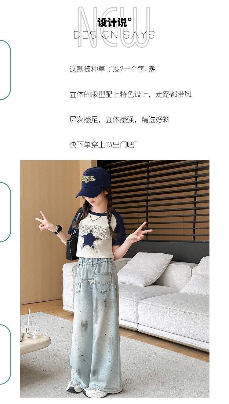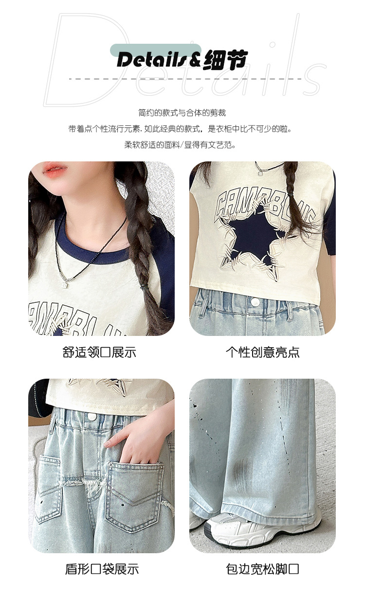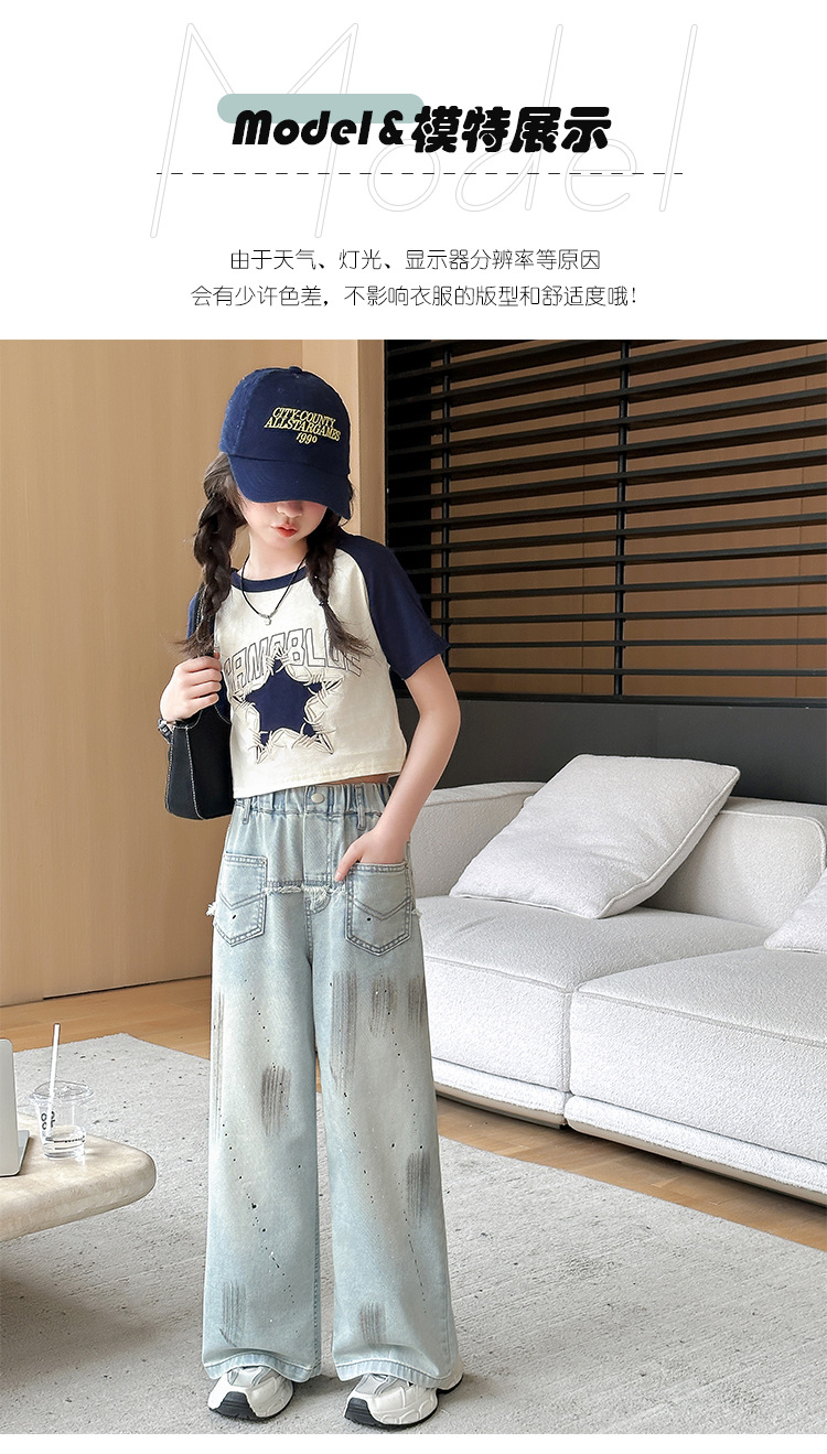 여자 반팔 티셔츠 캐주얼 서양식 세트 2024 새로운 어린이 유행 여름 느슨한 직선 청바지스토어 가기