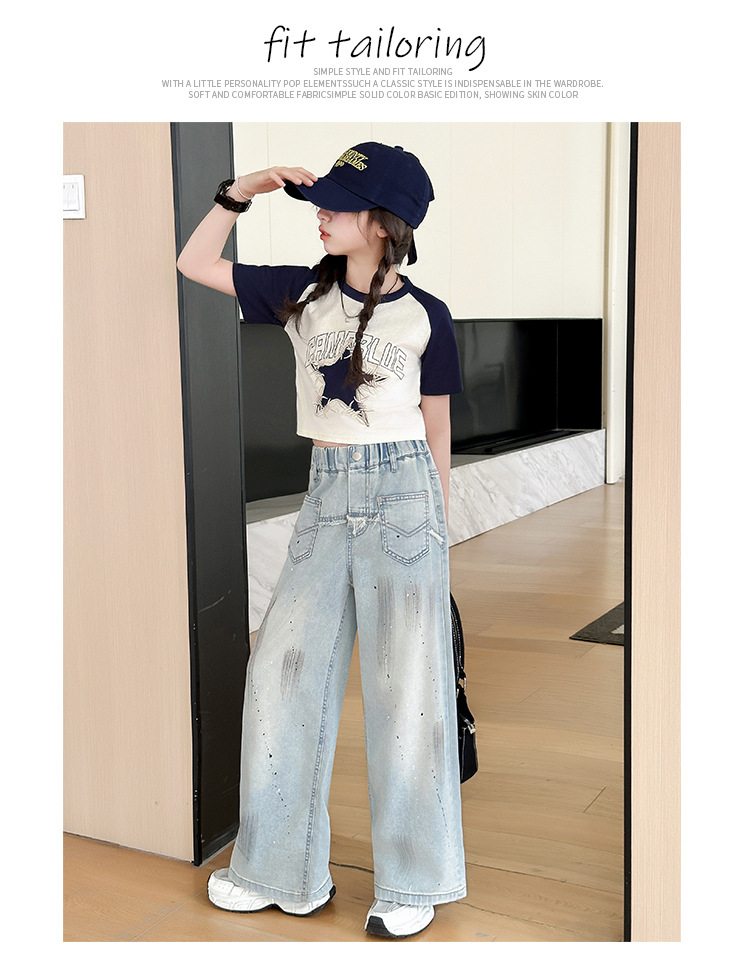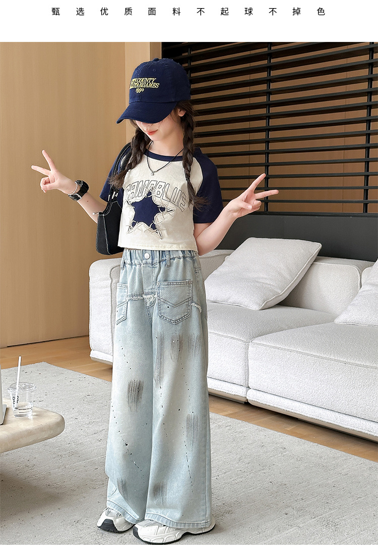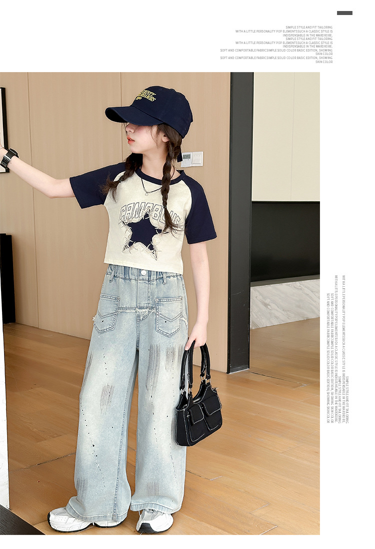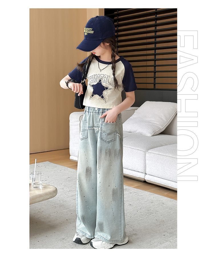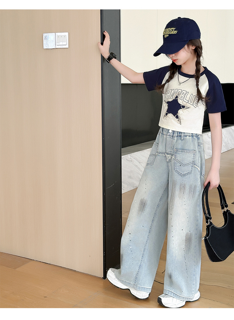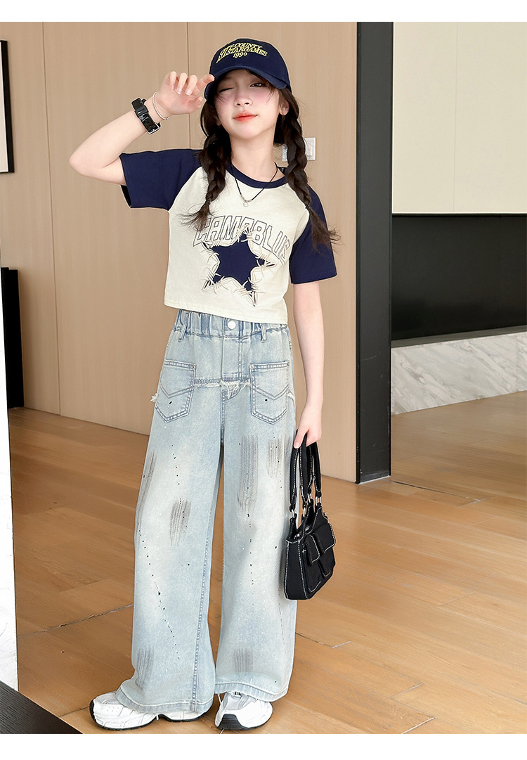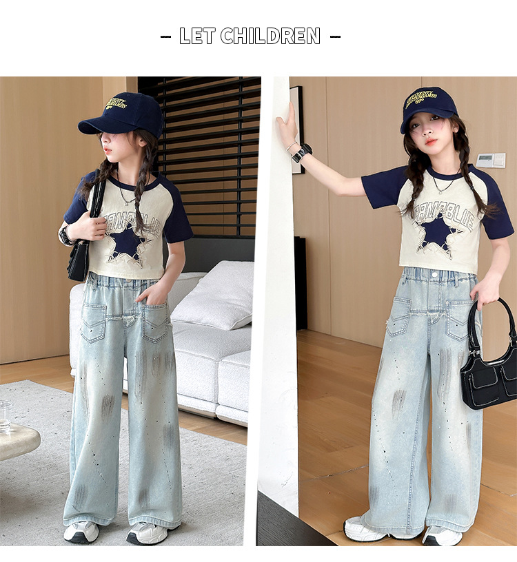 여자 반팔 티셔츠 캐주얼 서양식 세트 2024 새로운 어린이 유행 여름 느슨한 직선 청바지