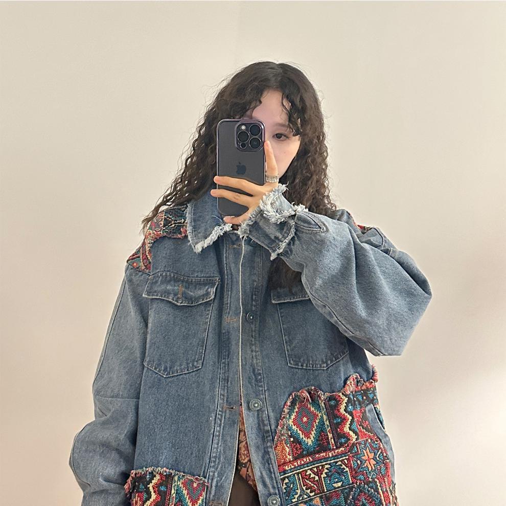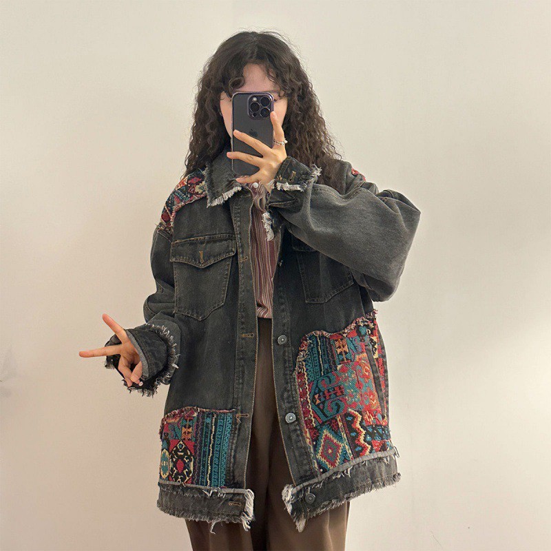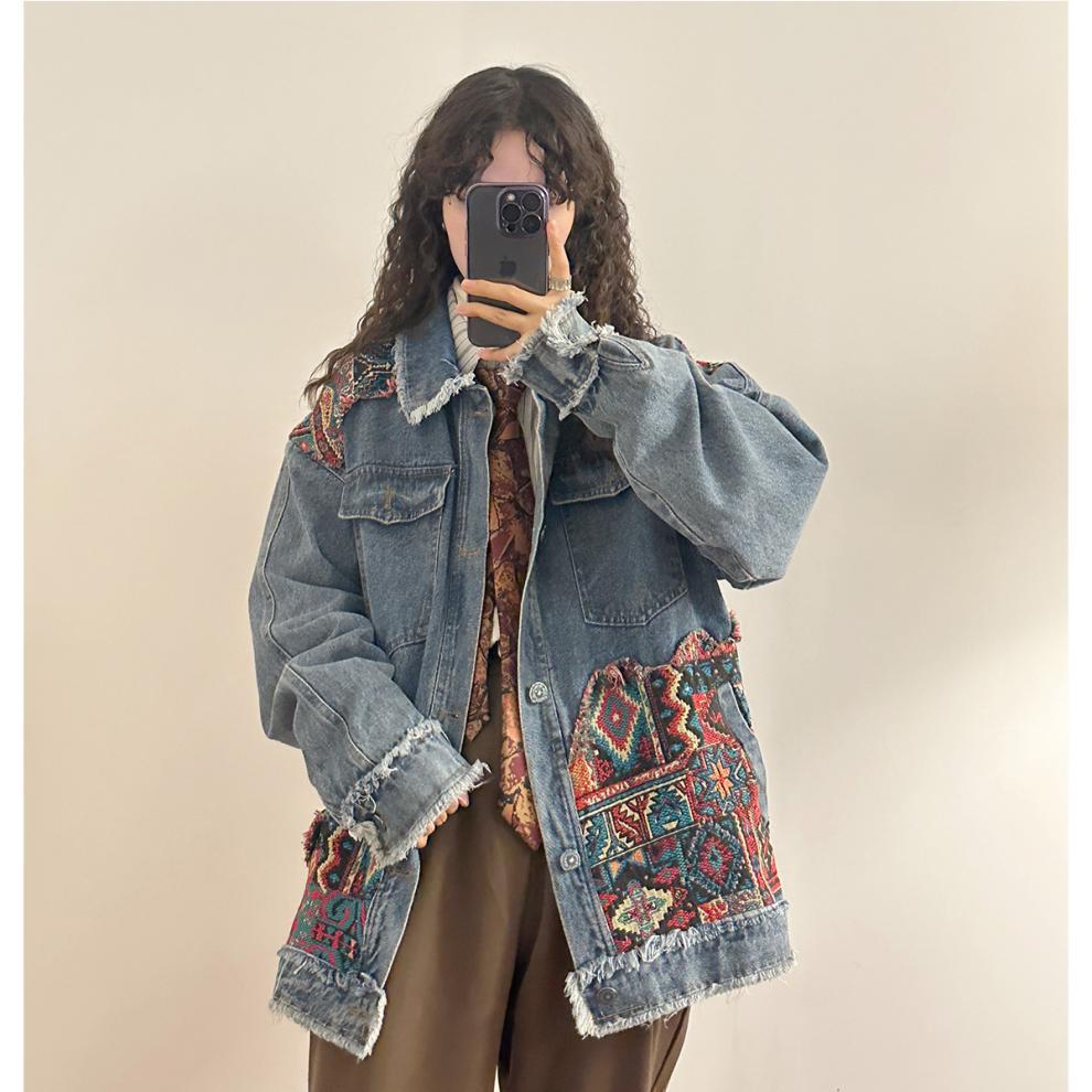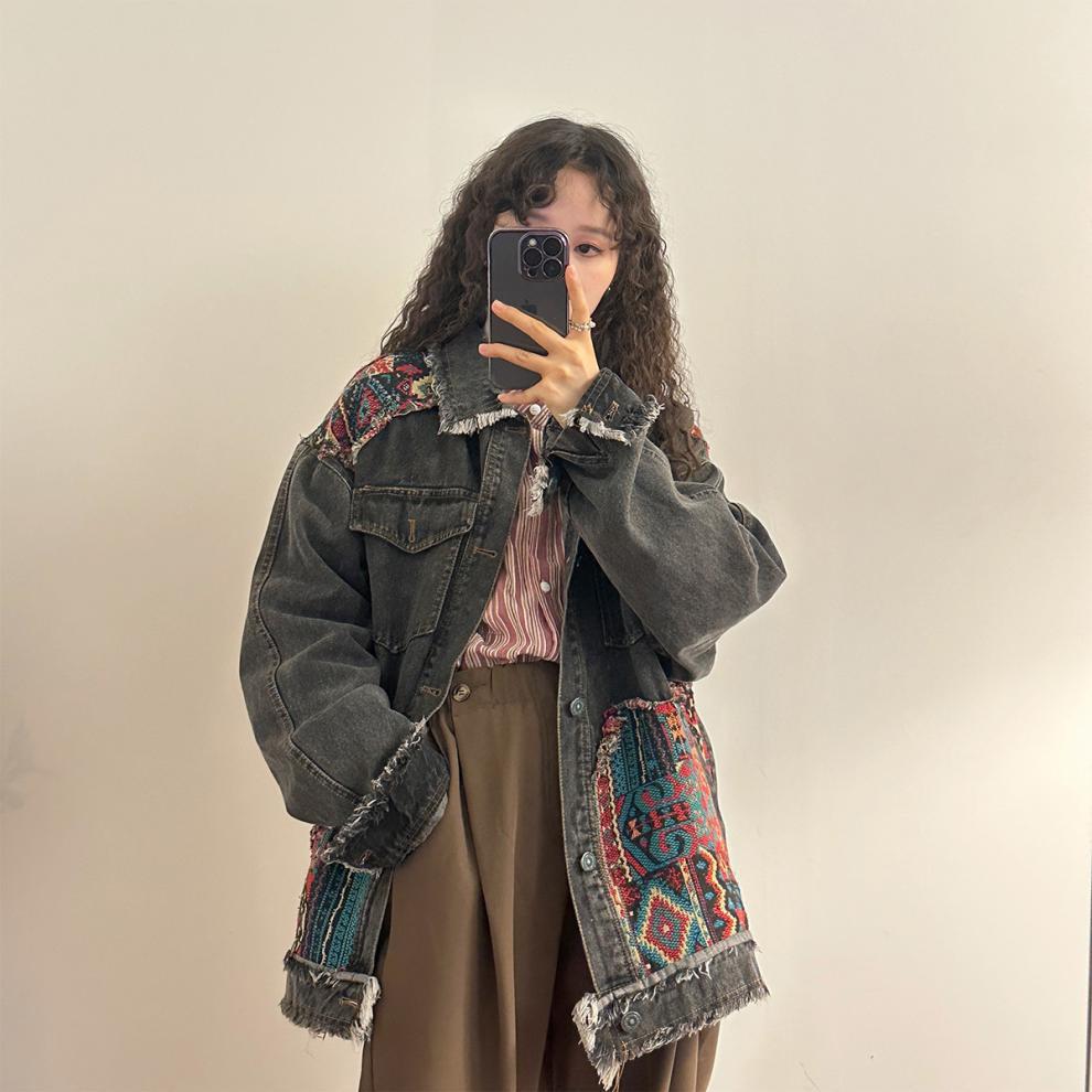 여성을위한 민족 스타일 스플 라이스 로우 엣지 데님 재킷 2025 봄, 가을 새로운 디자인 느슨한 BF 스트리트 레트로 재킷스토어 가기