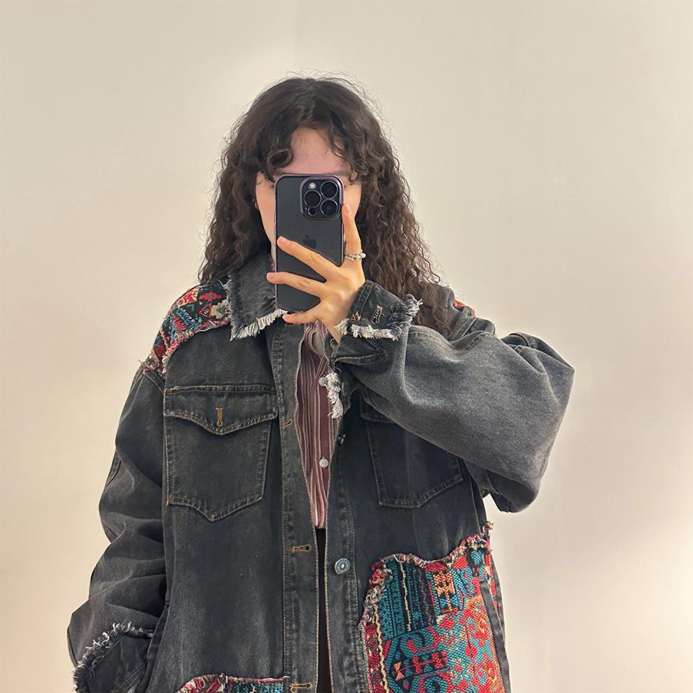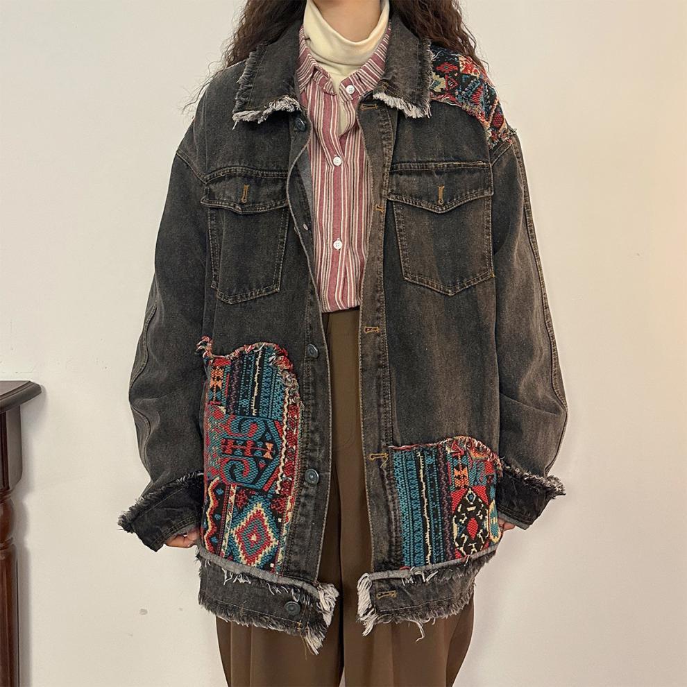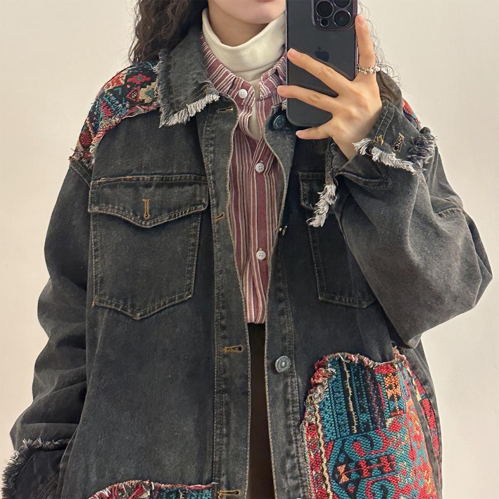 여성을위한 민족 스타일 스플 라이스 로우 엣지 데님 재킷 2025 봄, 가을 새로운 디자인 느슨한 BF 스트리트 레트로 재킷스토어 가기