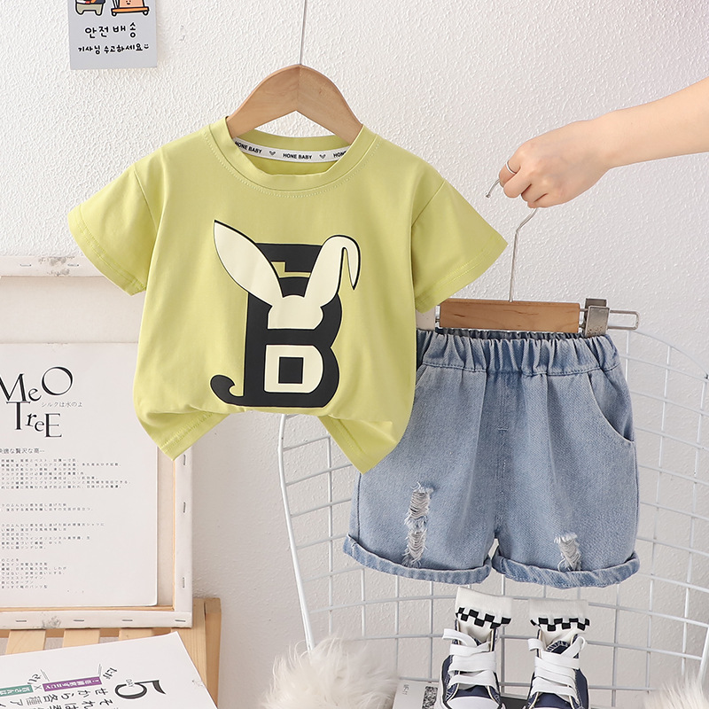 2024 여름 뉴 보이즈 여름 세트 어린이 아기 패션 반팔 크루 넥 티셔츠 투피스 반바지스토어 가기