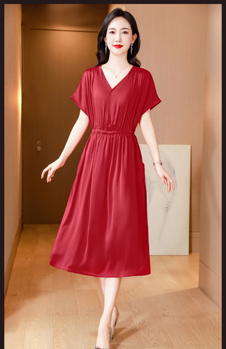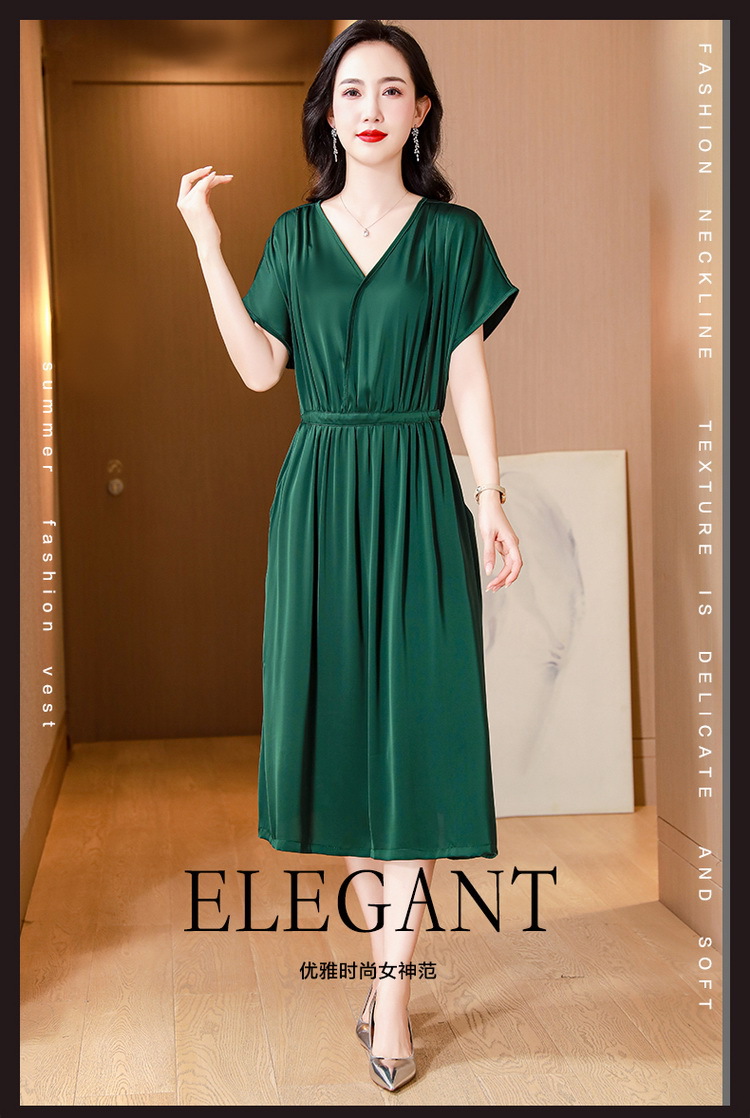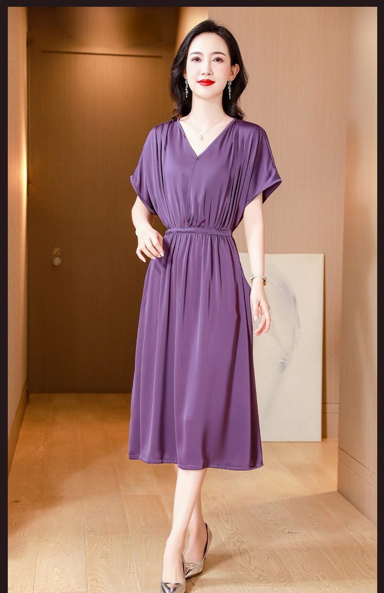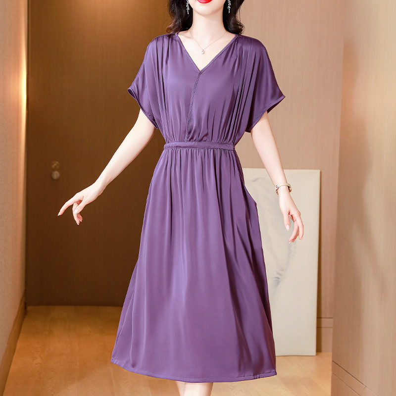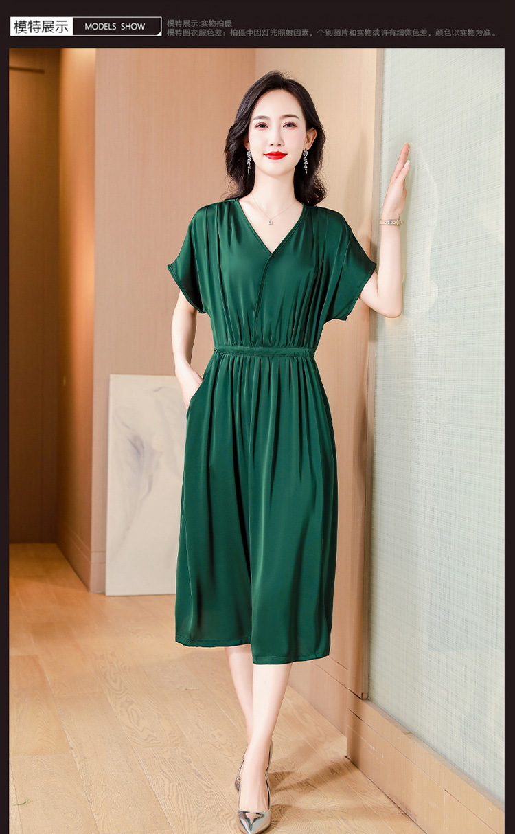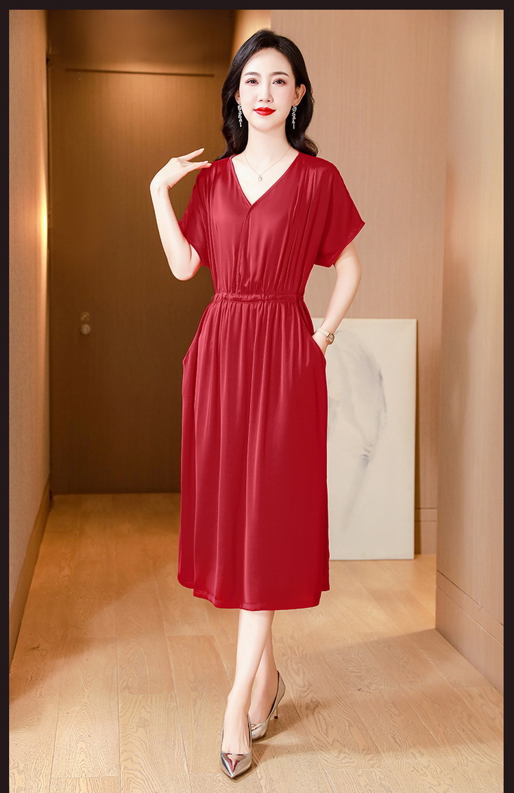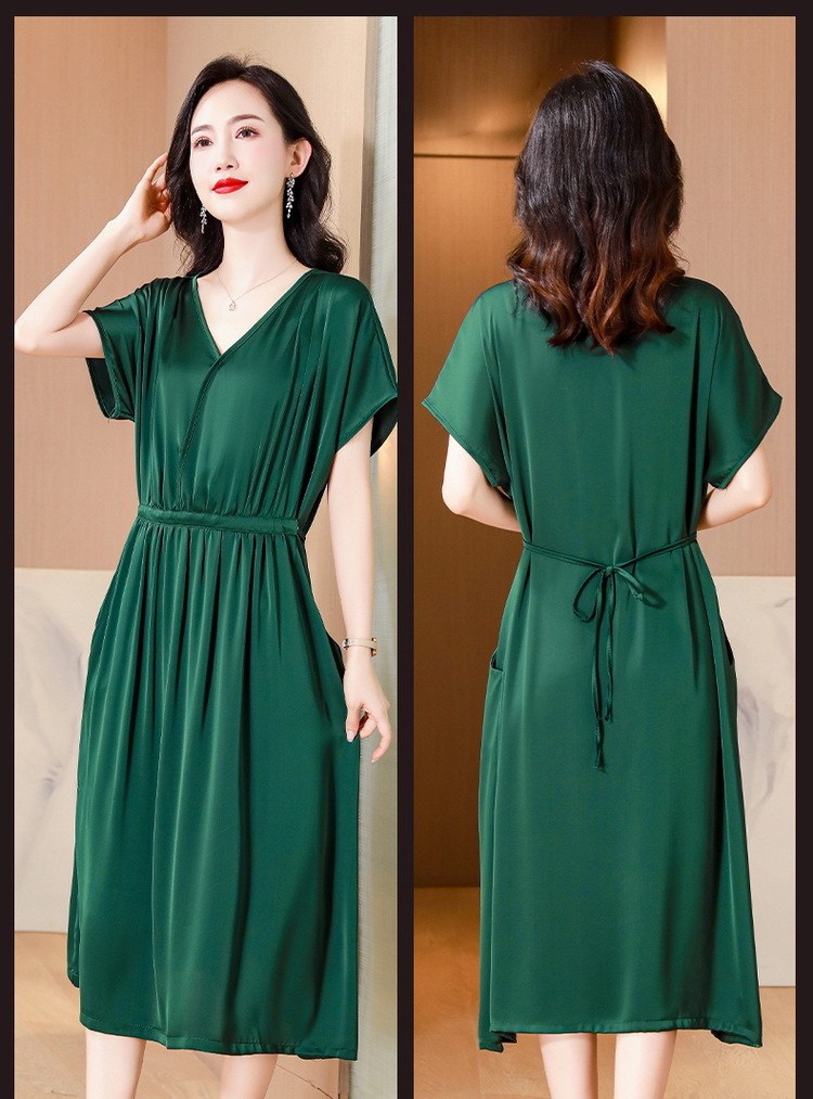 중년 어머니 원피스 여성의 2024 년 새 여름 V-목 배꼽이 허리 슬리밍 박리 실크 롱 스커트스토어 가기