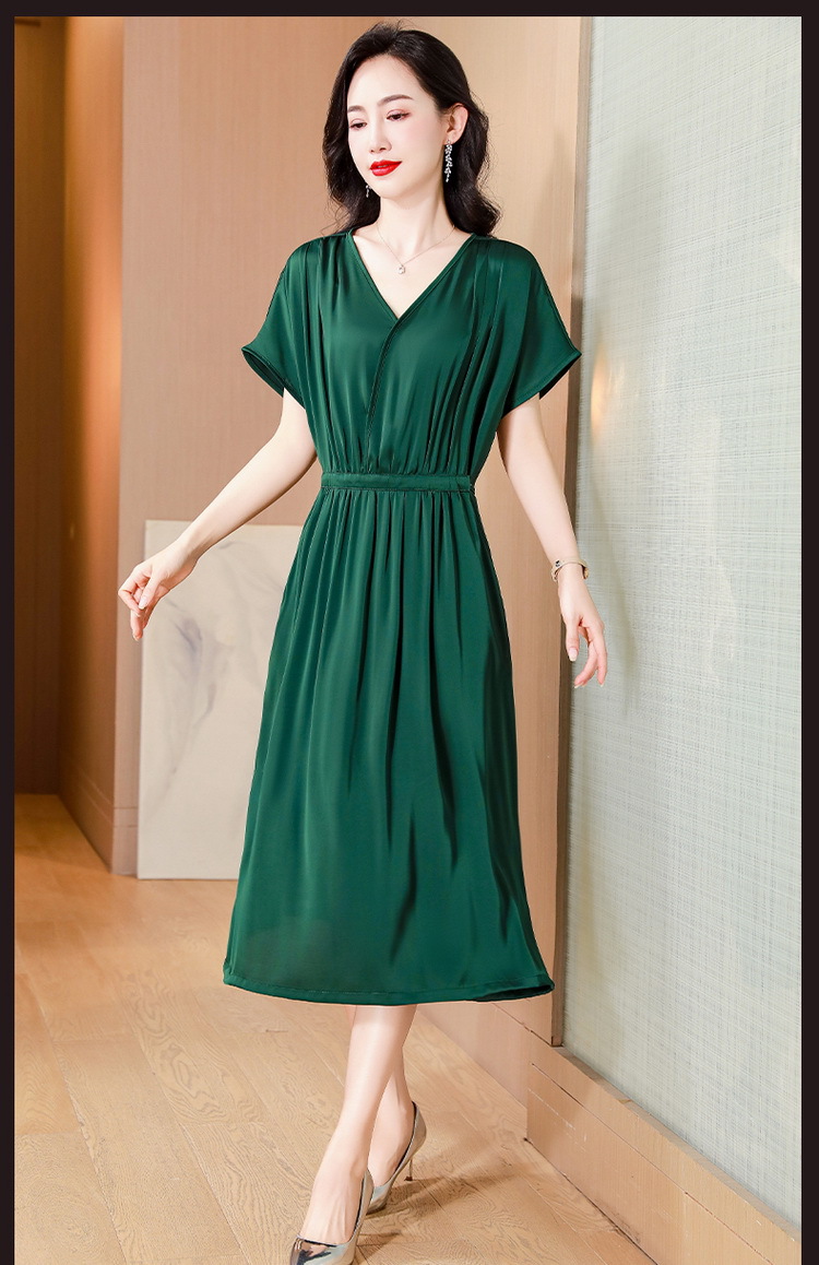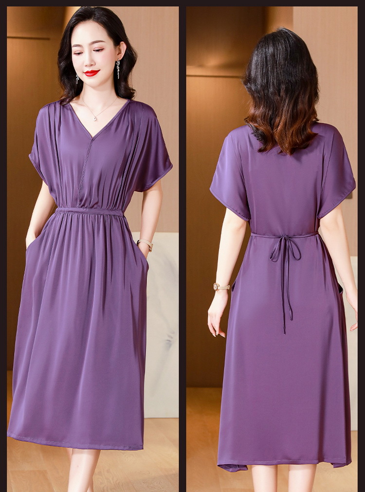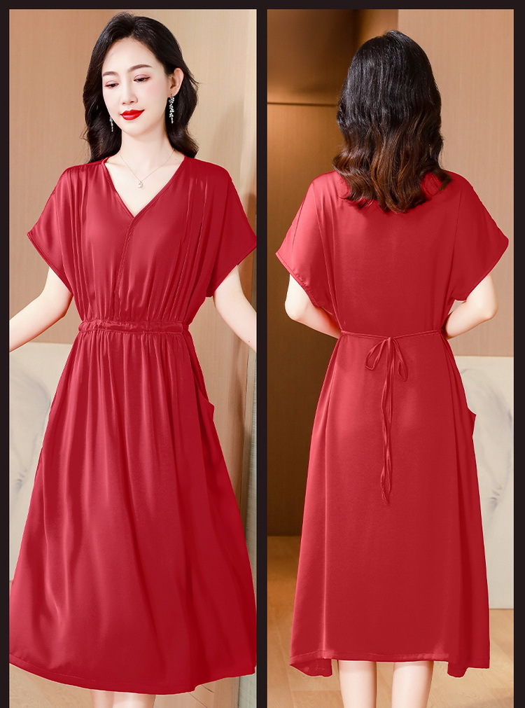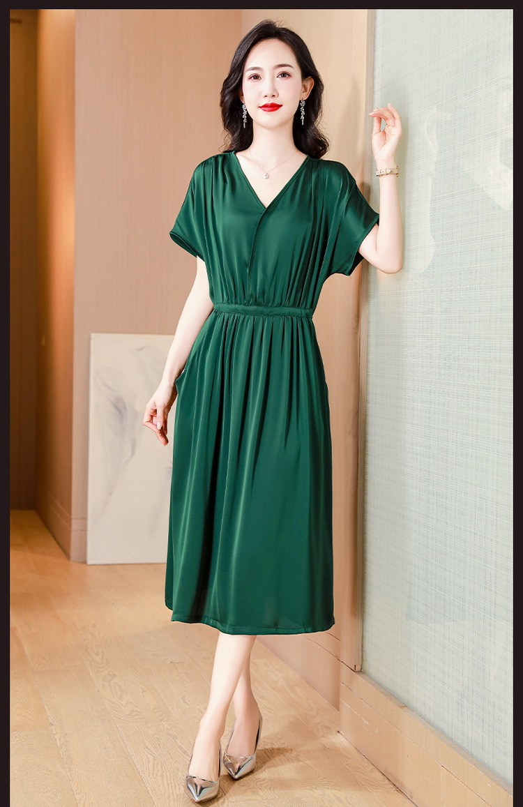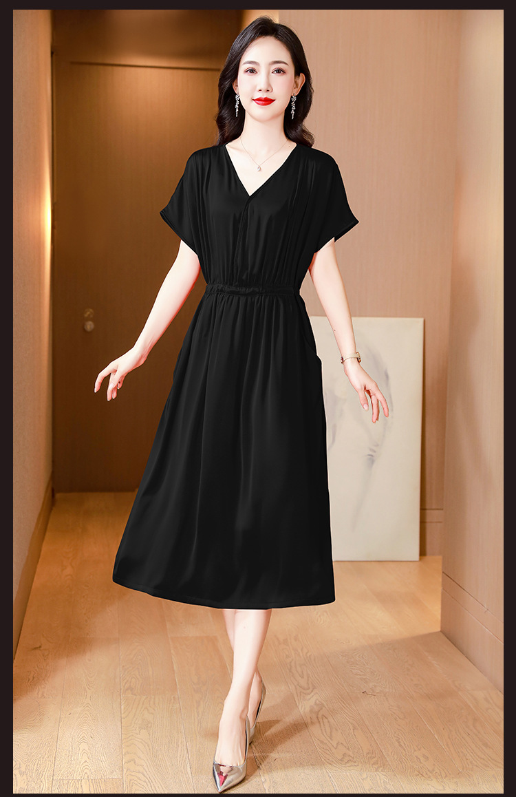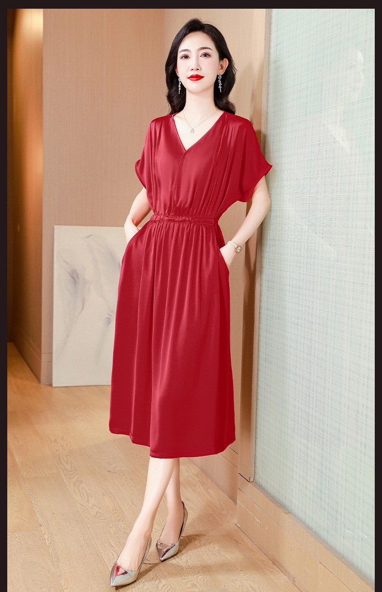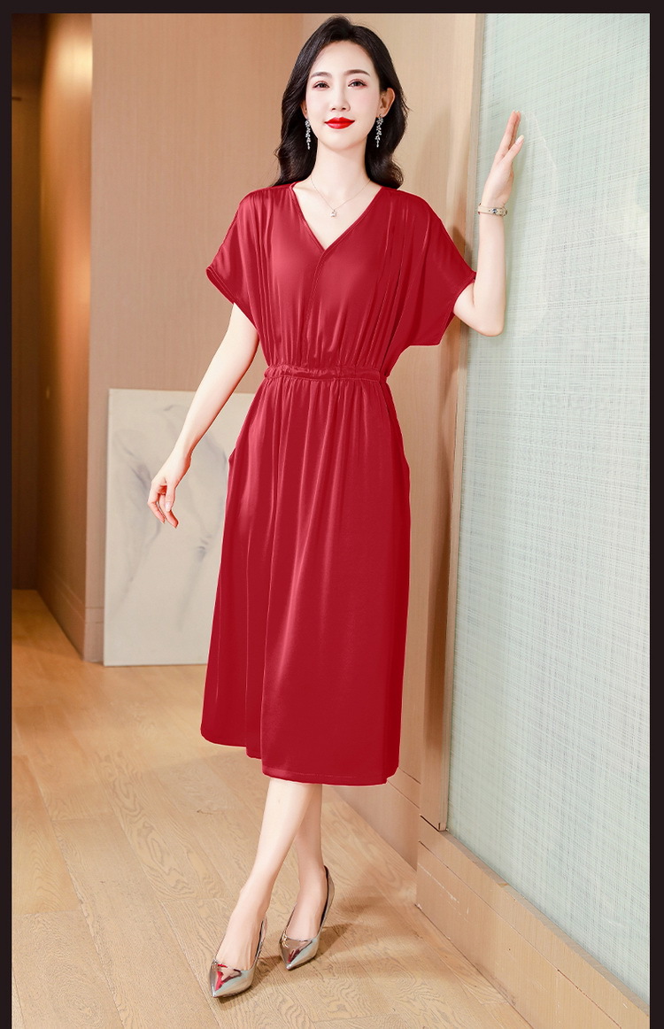 중년 어머니 원피스 여성의 2024 년 새 여름 V-목 배꼽이 허리 슬리밍 박리 실크 롱 스커트스토어 가기