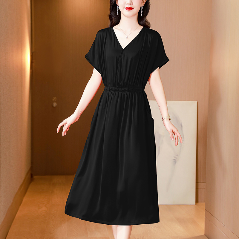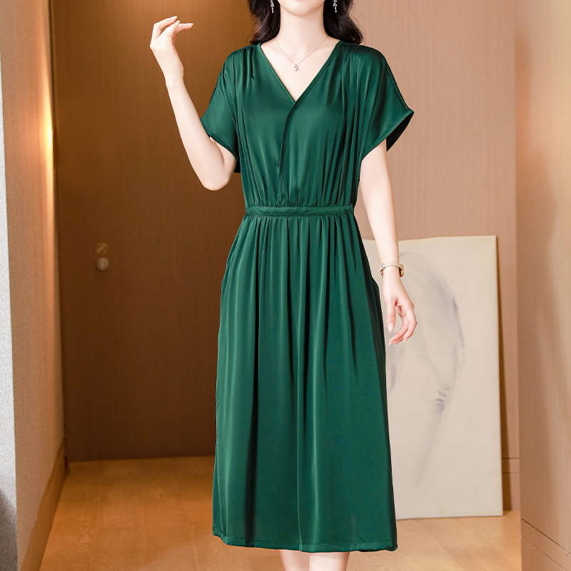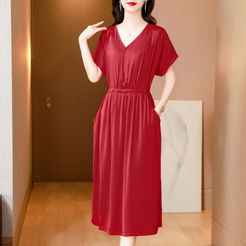 중년 어머니 원피스 여성의 2024 년 새 여름 V-목 배꼽이 허리 슬리밍 박리 실크 롱 스커트