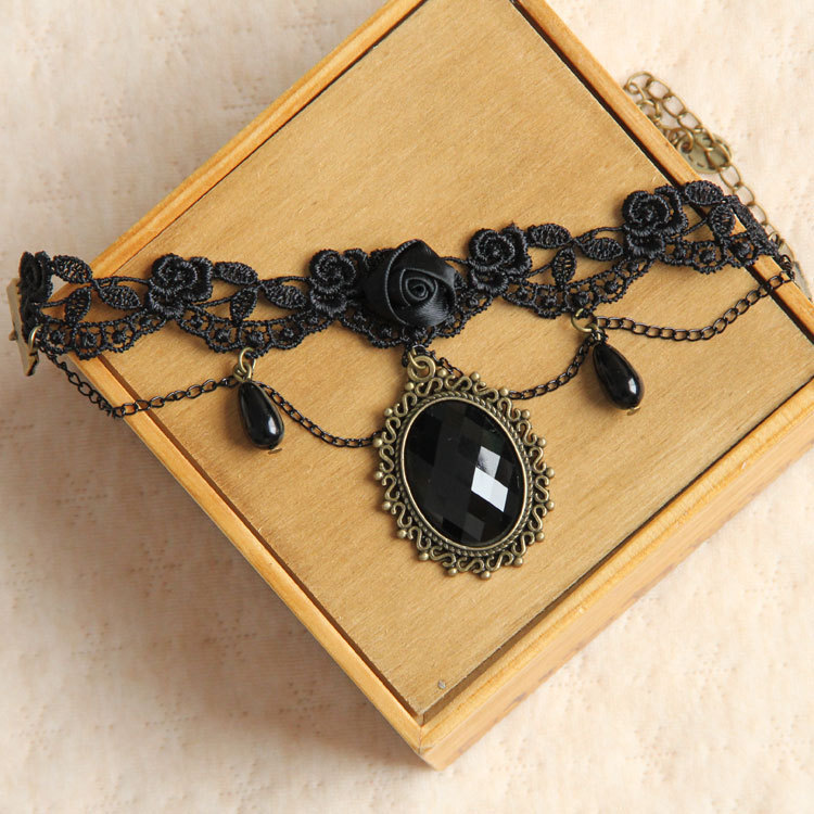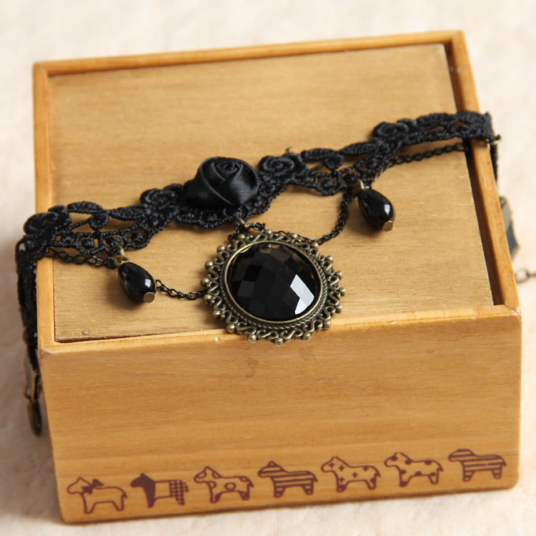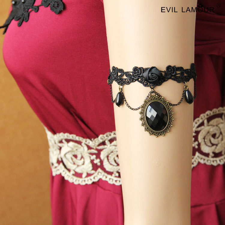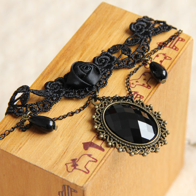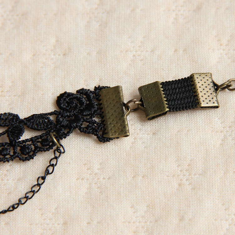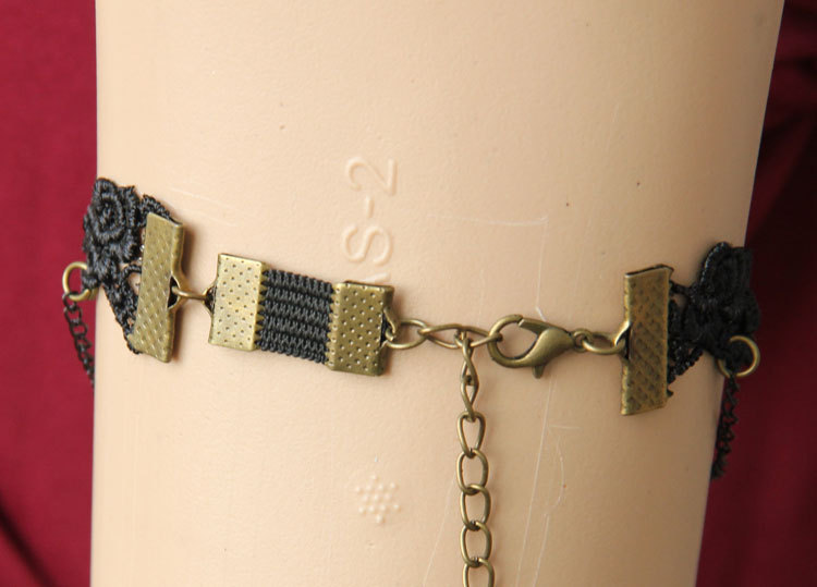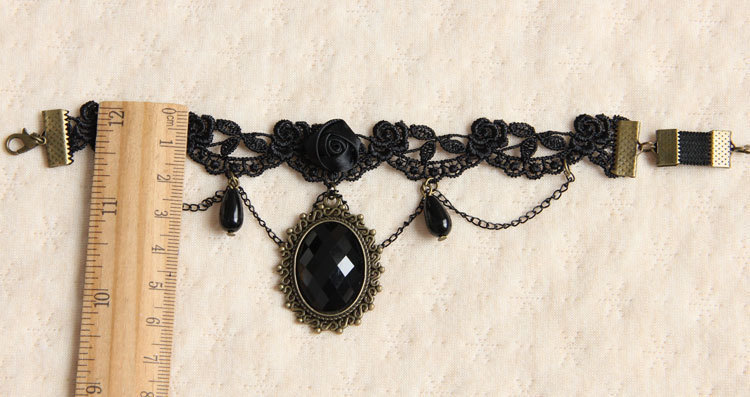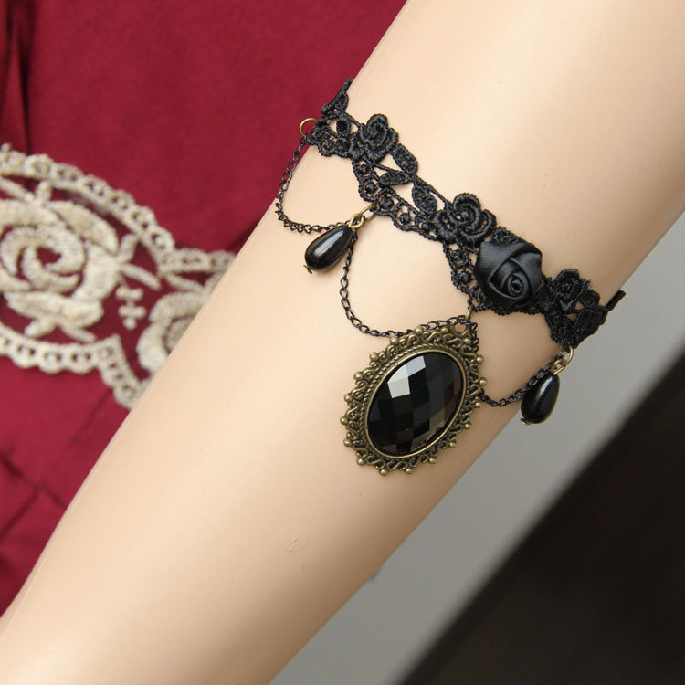 【材料】:弹力带,黑色蕾丝,古铜色合金配件,树脂钻,人造珍珠。