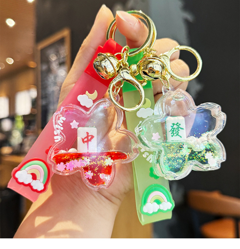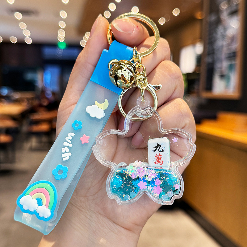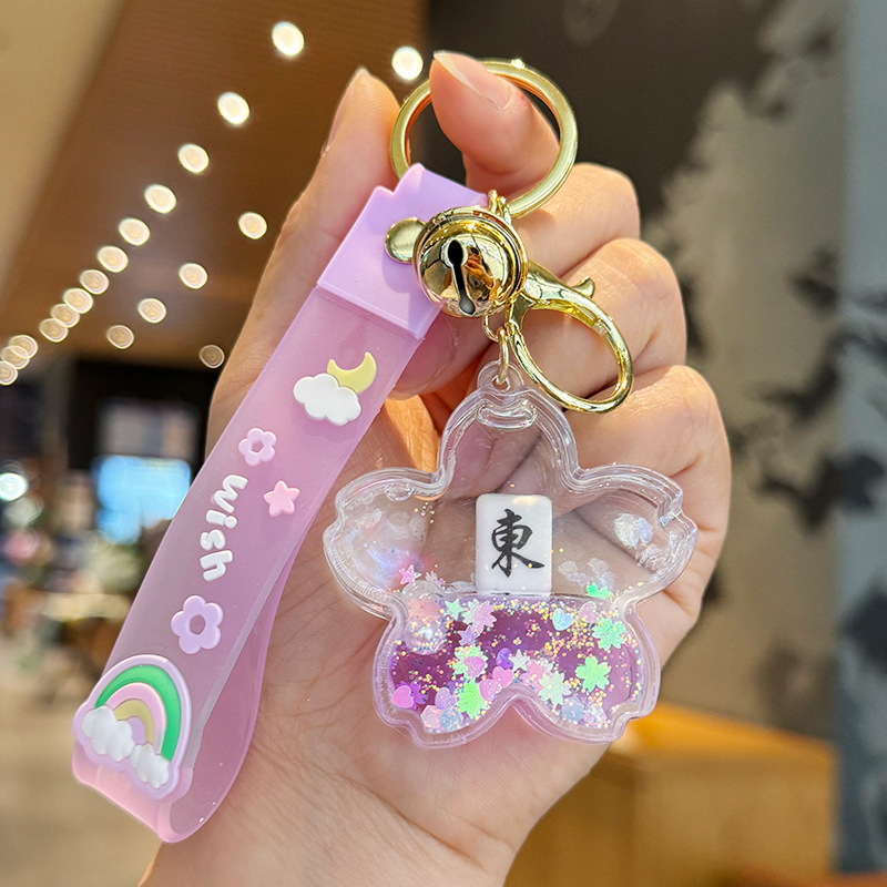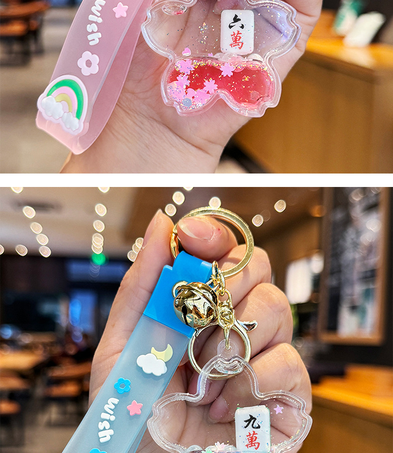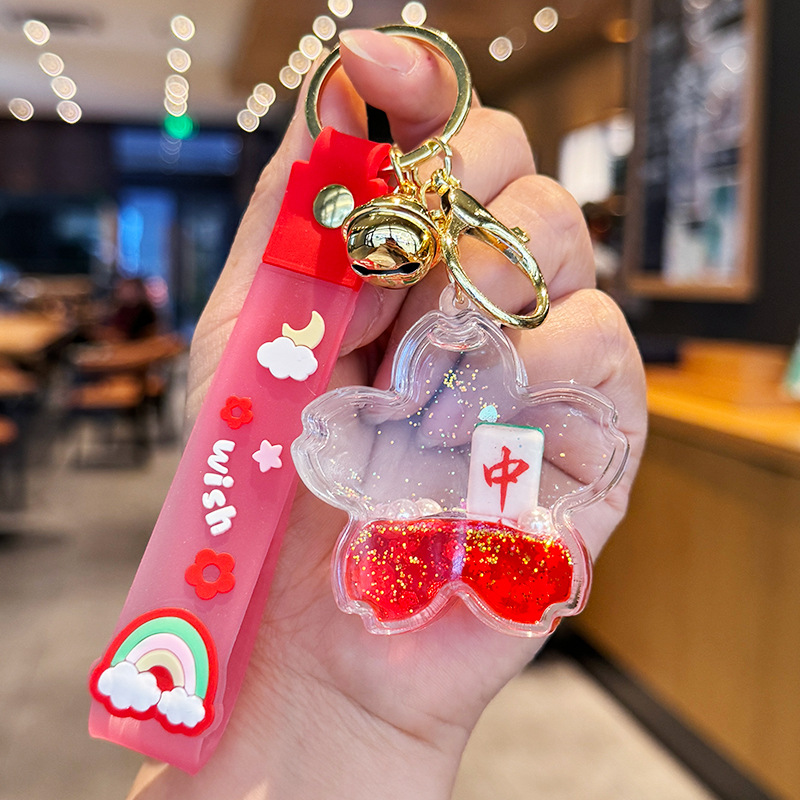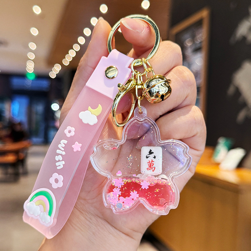 창조적 인 마작 붉은 포춘 모래 병 키 체인 여성의 귀여운 벚꽃 플로팅 액체 펜던트 절묘한 키 체인스토어 가기