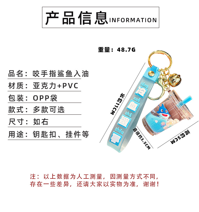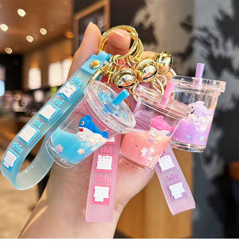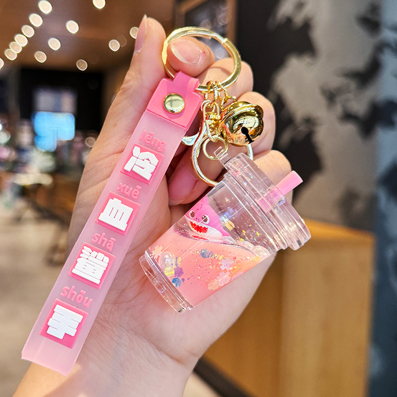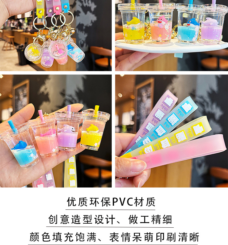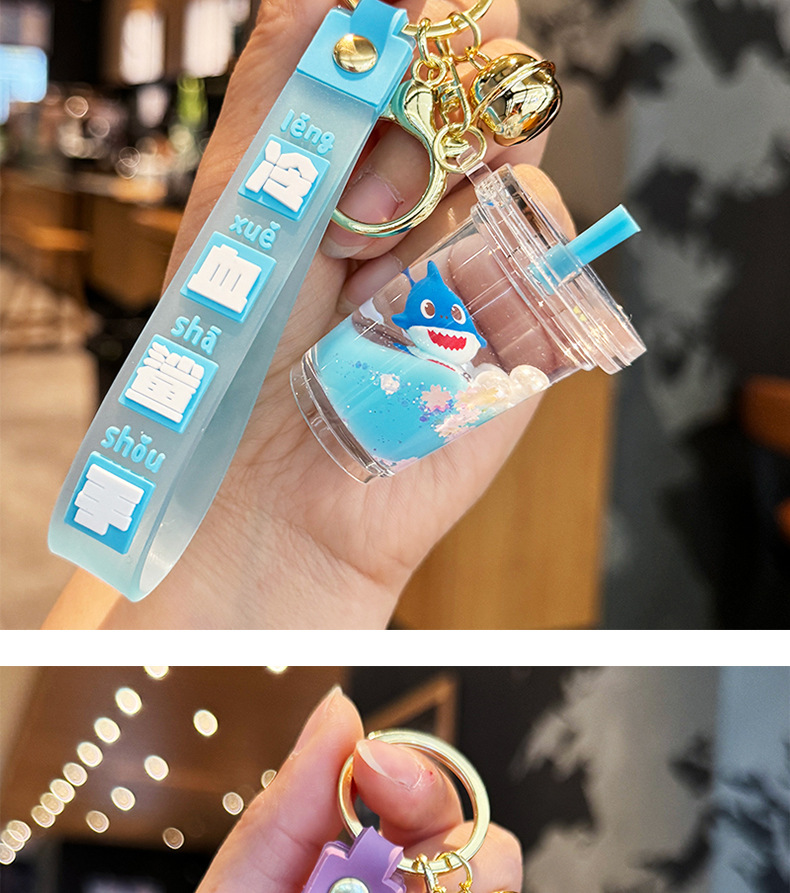 손가락 물린 상어 퀵 샌드 인형 키 체인 오일 액체 우유 티 컵 절묘한 펜던트 여성용 가방 펜던트 선물