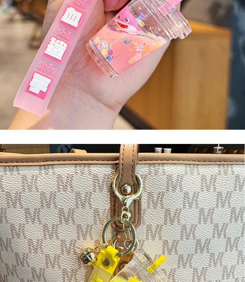 손가락 물린 상어 퀵 샌드 인형 키 체인 오일 액체 우유 티 컵 절묘한 펜던트 여성용 가방 펜던트 선물스토어 가기