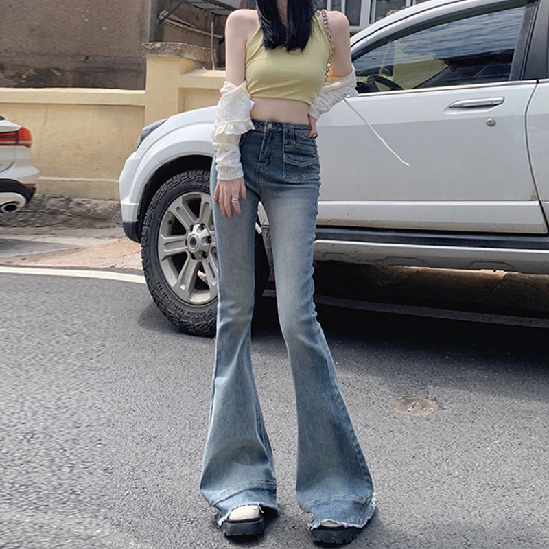 랩핑된 틈새 하이 웨이스트 청바지 여성용 배 모양의 새로운 디자인 센스 마이크로 플레어 바지 슬림 핏 스트레치 말굽 바지스토어 가기