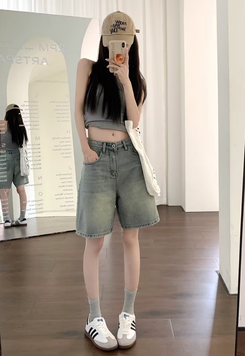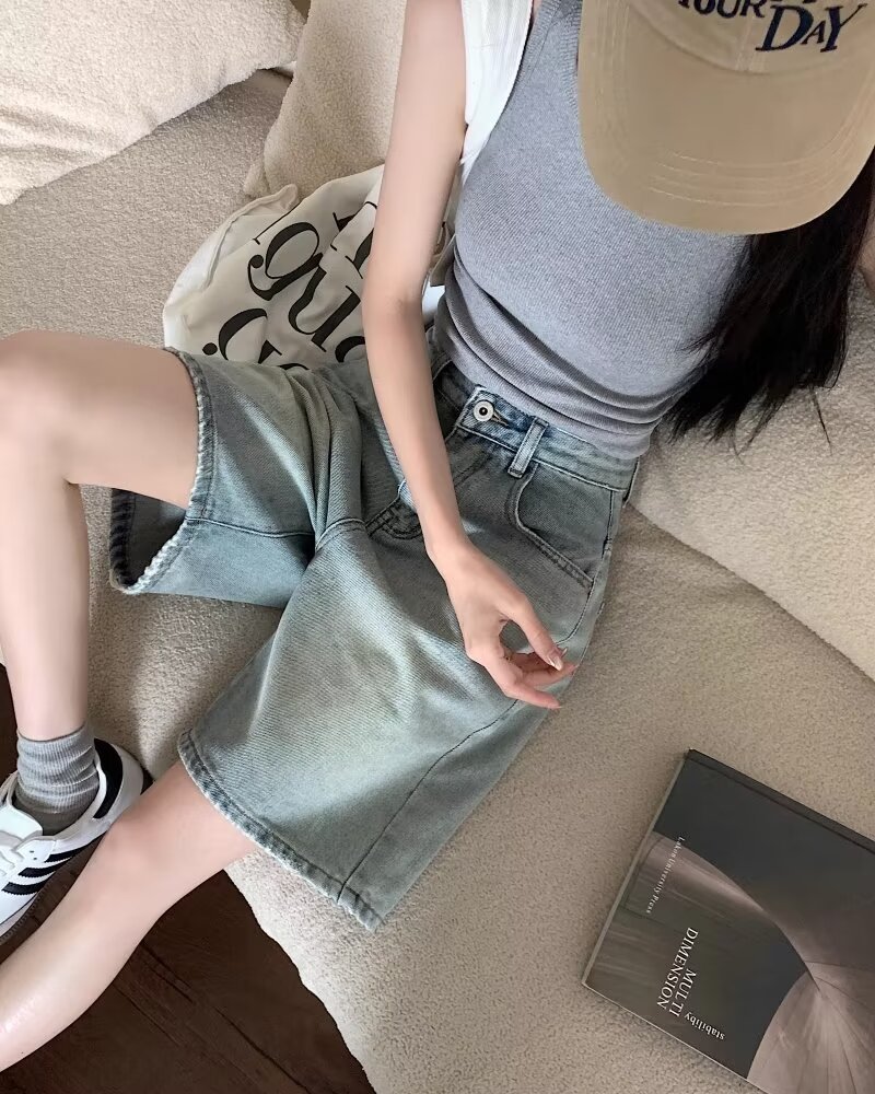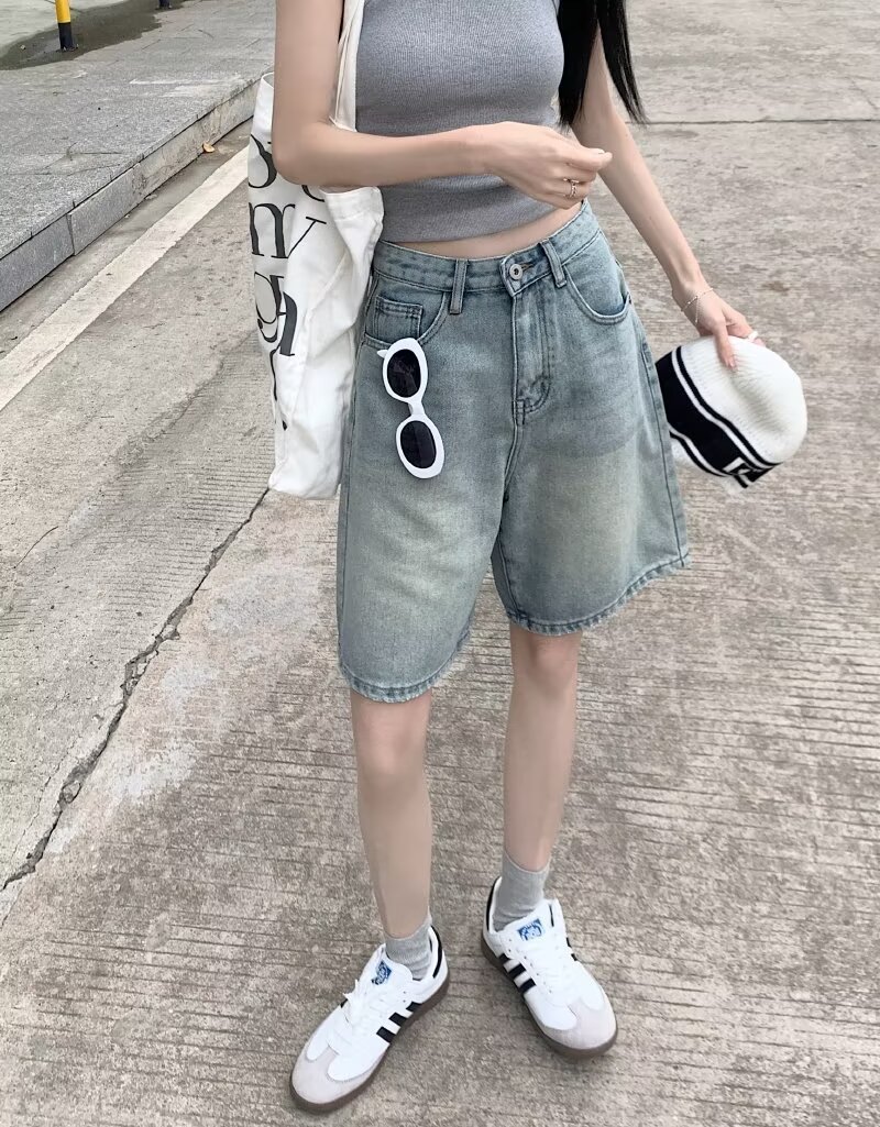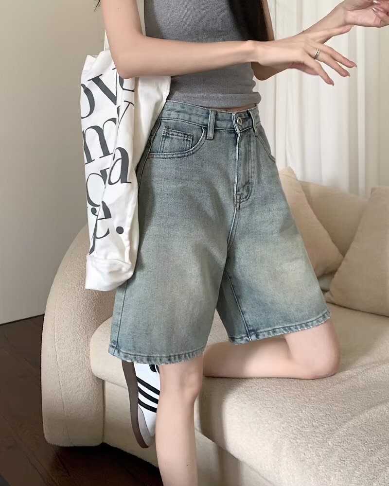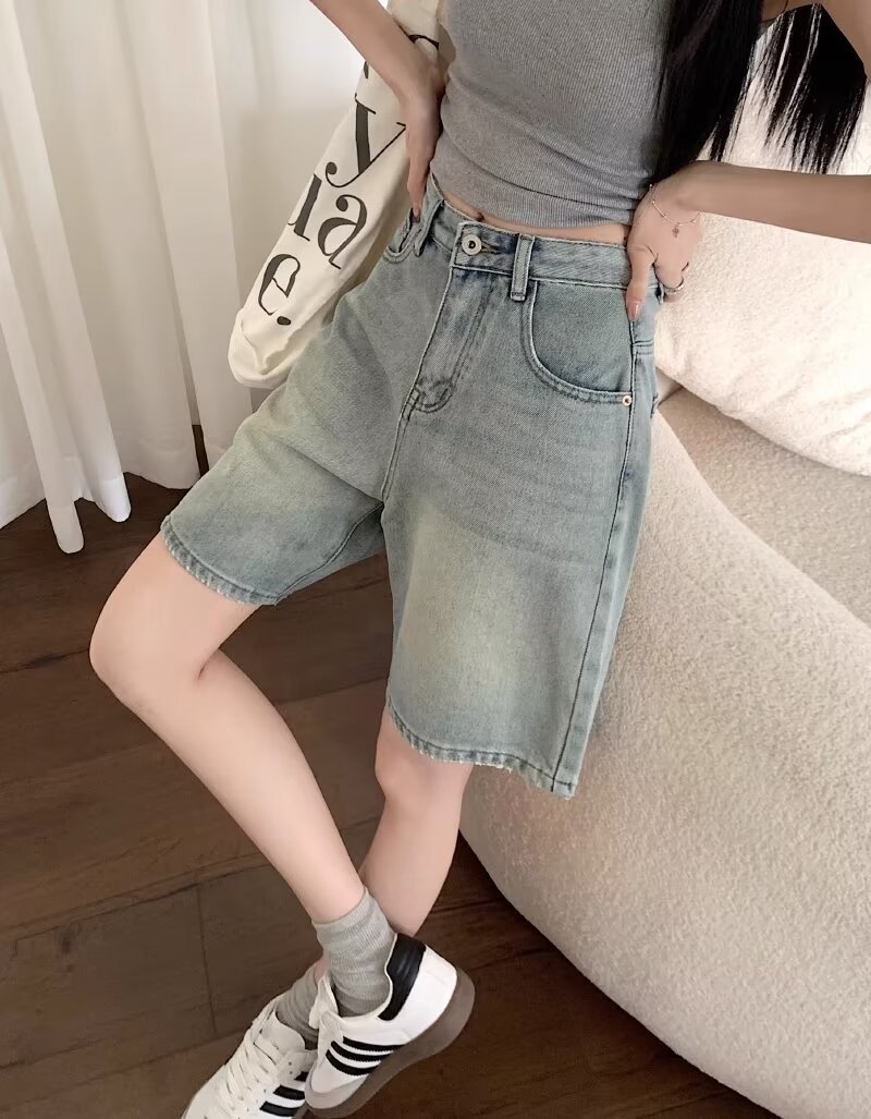 데님 반바지 여성 트렌디 다재다능한 여름 얇은 새로운 하이 웨이스트 복고풍 작은 루즈 스트레이트 슬림 5부 바지스토어 가기