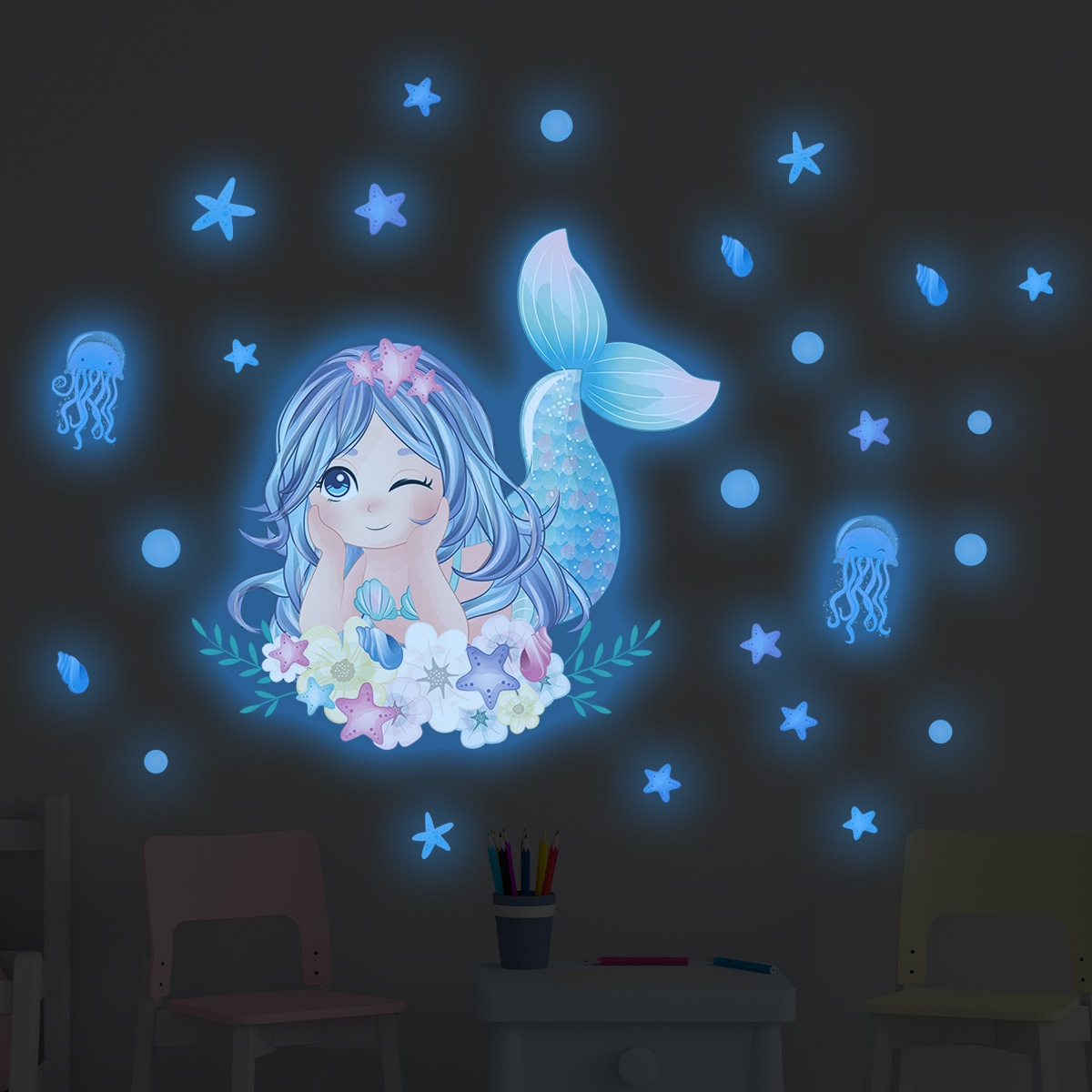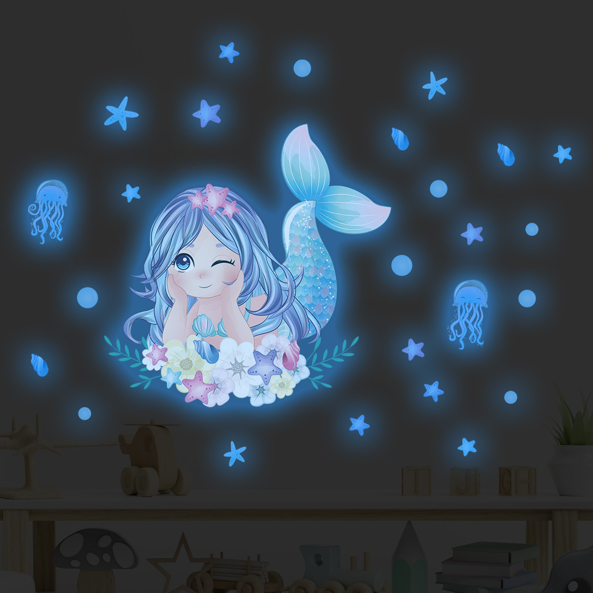창조적 인 빛나는 귀여운 인어 자기 접착 벽 스티커 거실 침실 어린이 방 장식 스티커 BR-YG023