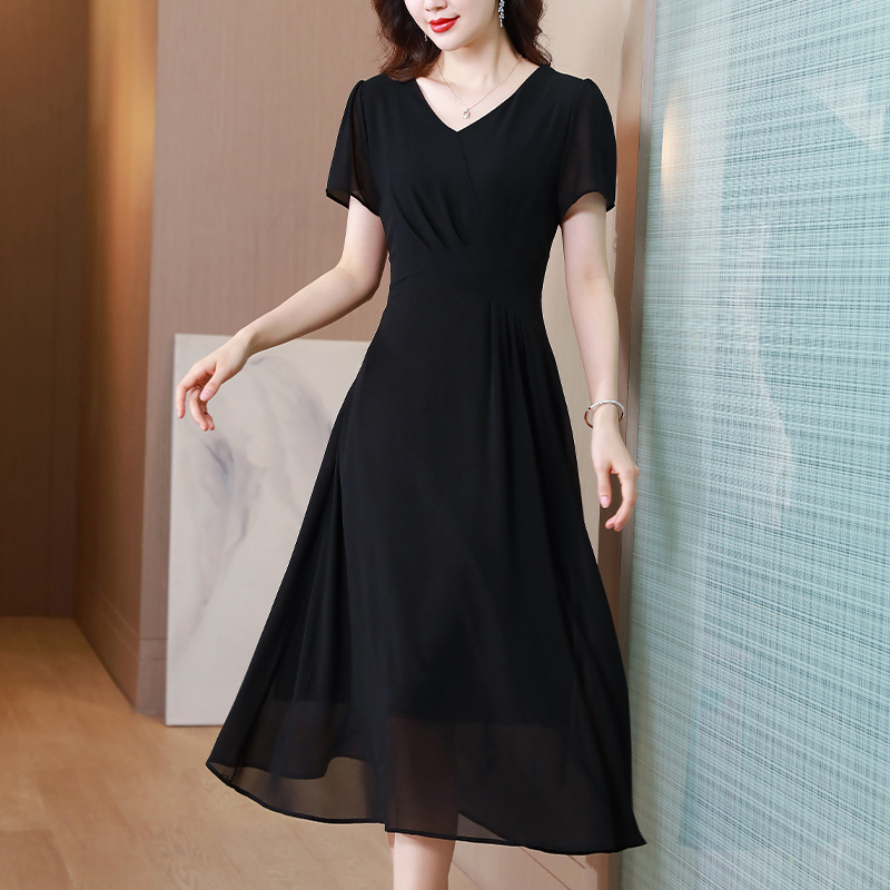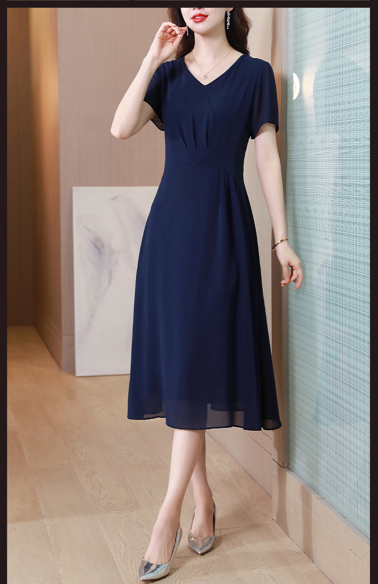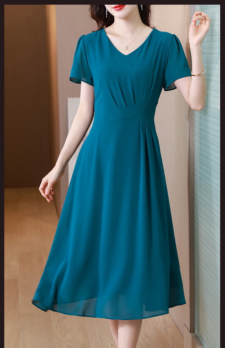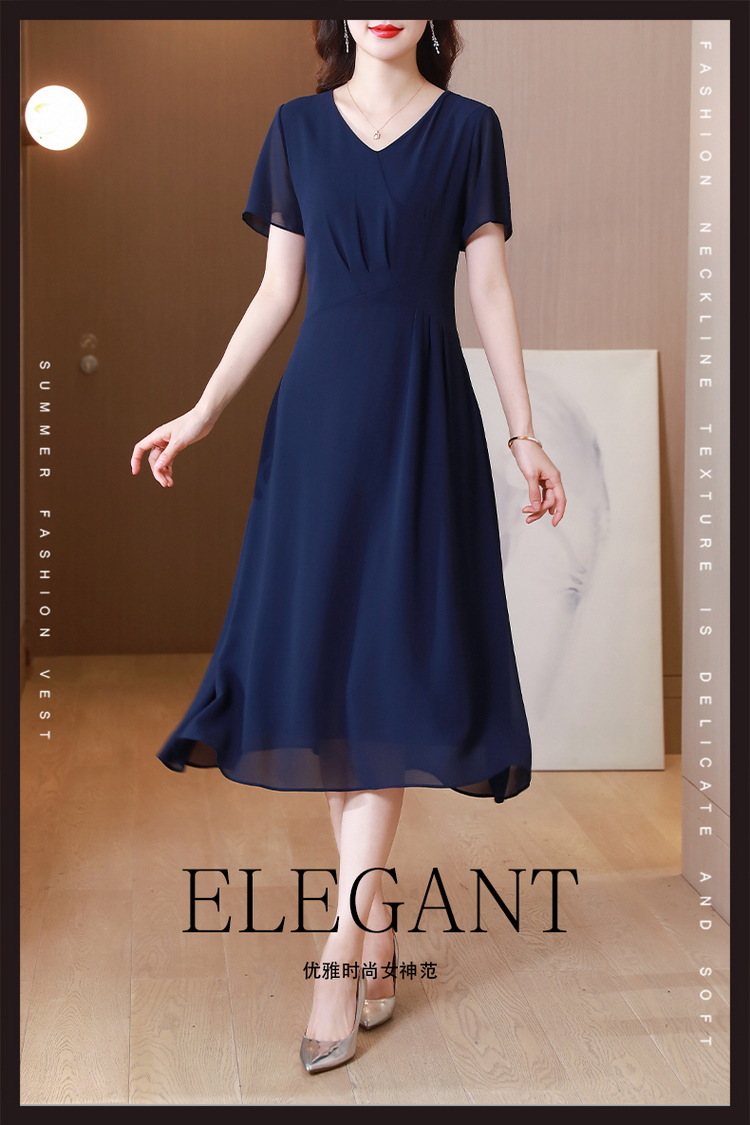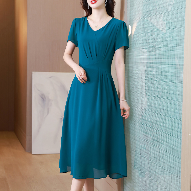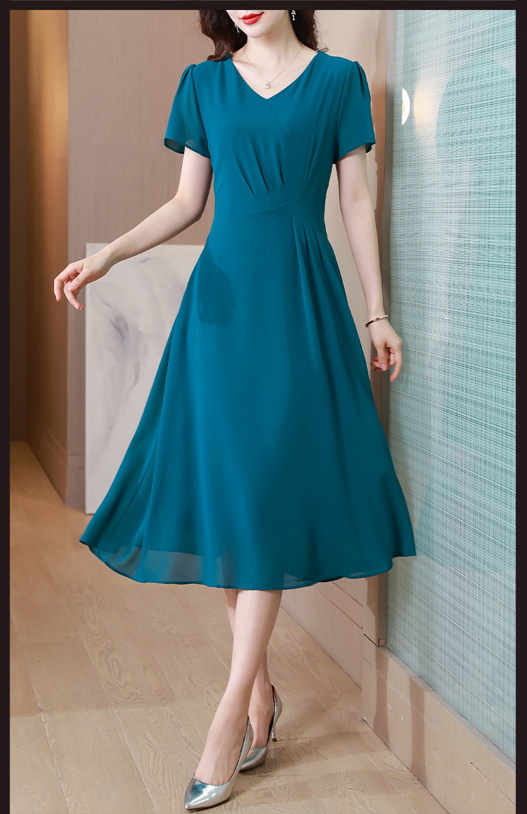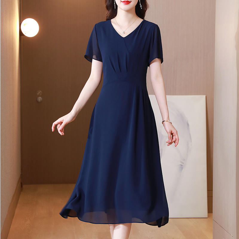 어머니의 날 여름 실크 원피스 여성 플러스 사이즈 패션 뽕나무 실크 V 넥 슬림 핏 미디 원피스