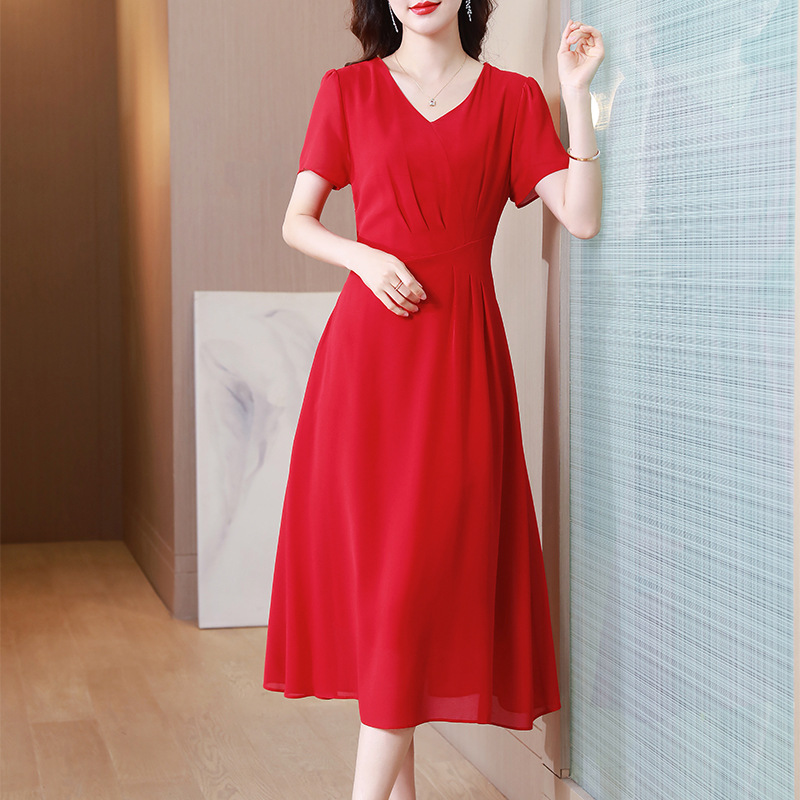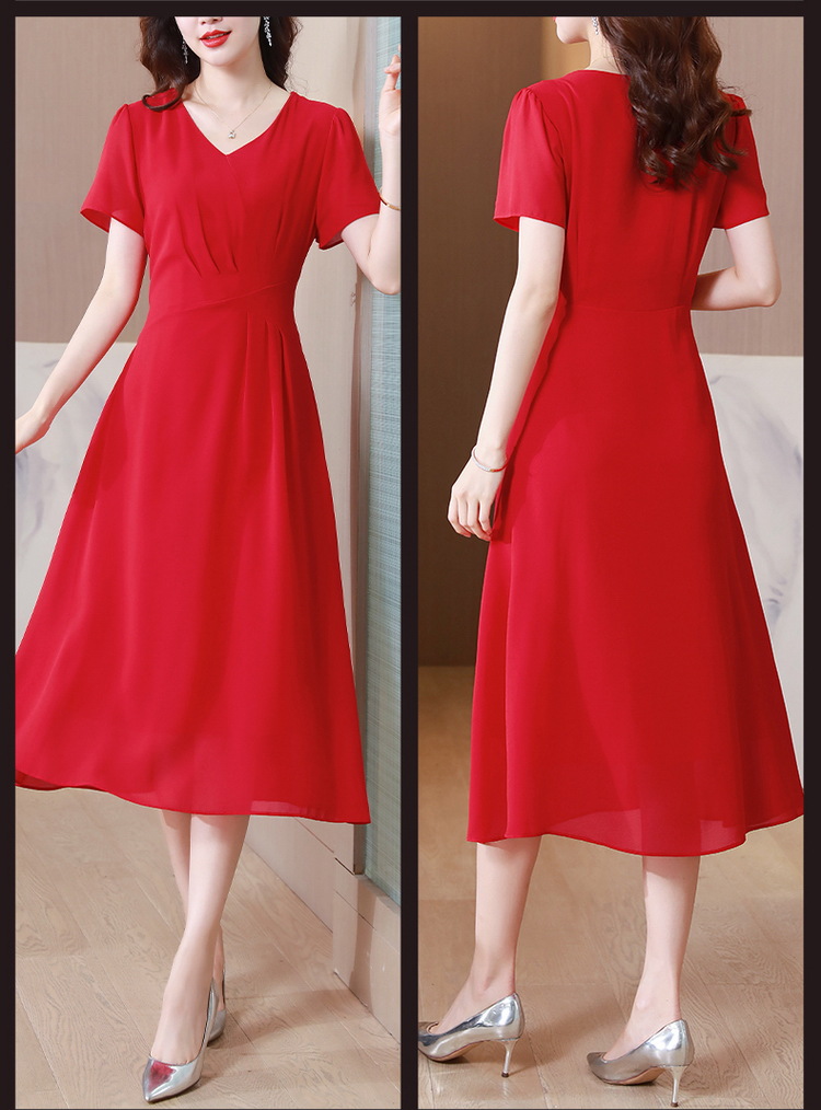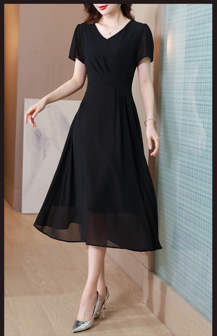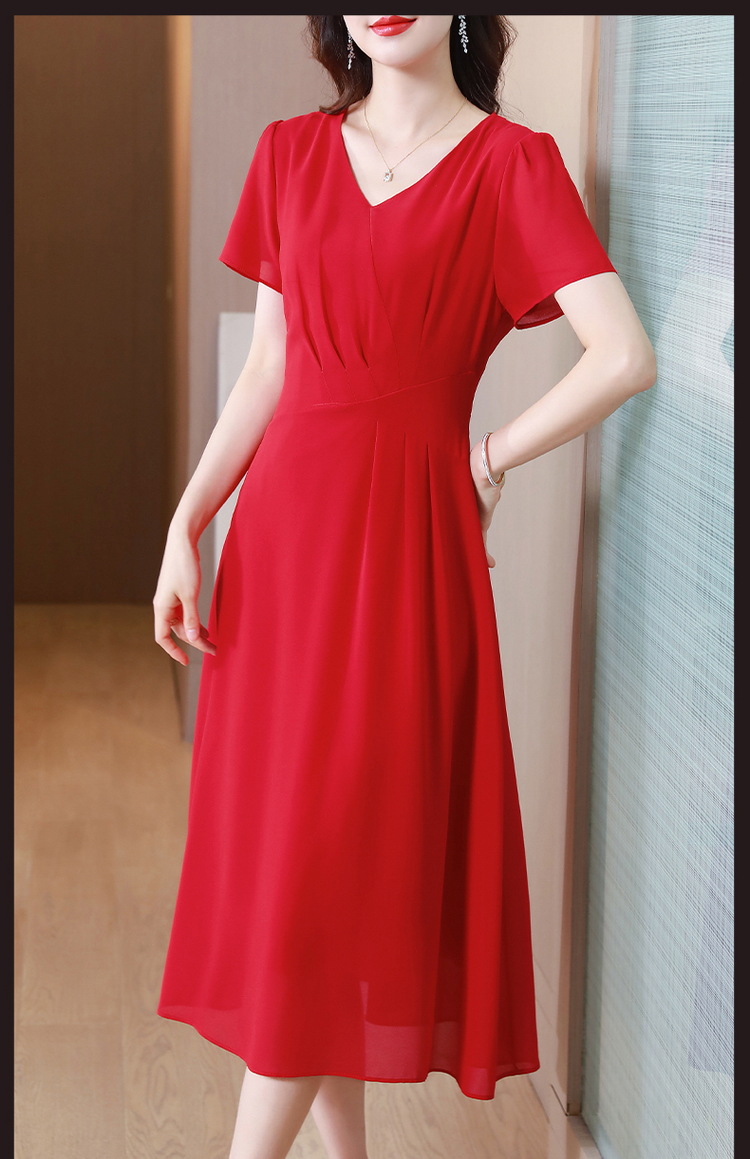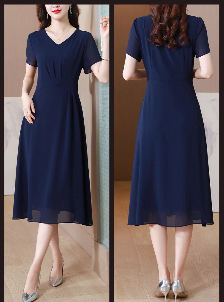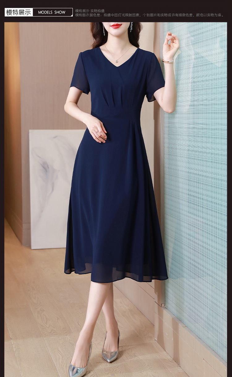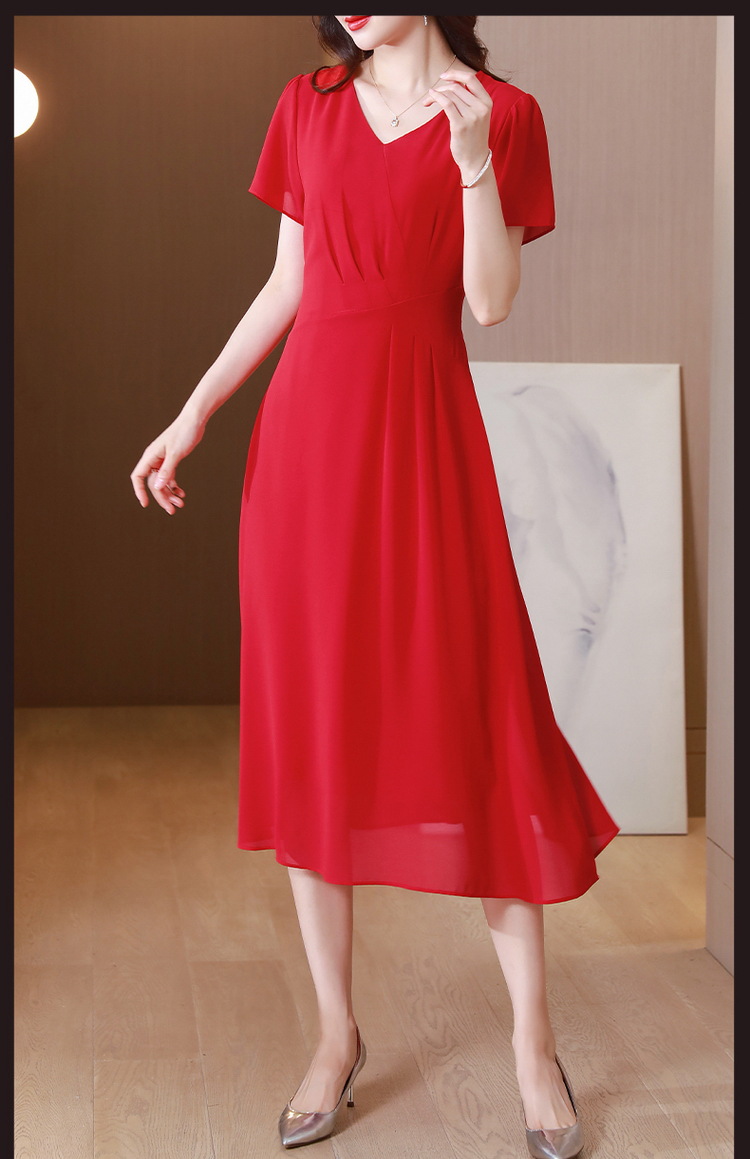 어머니의 날 여름 실크 원피스 여성 플러스 사이즈 패션 뽕나무 실크 V 넥 슬림 핏 미디 원피스