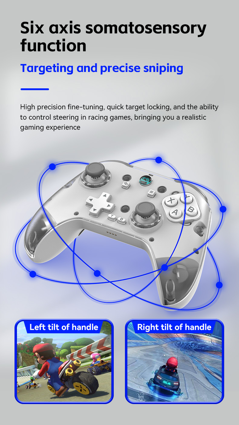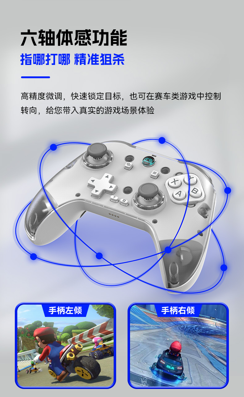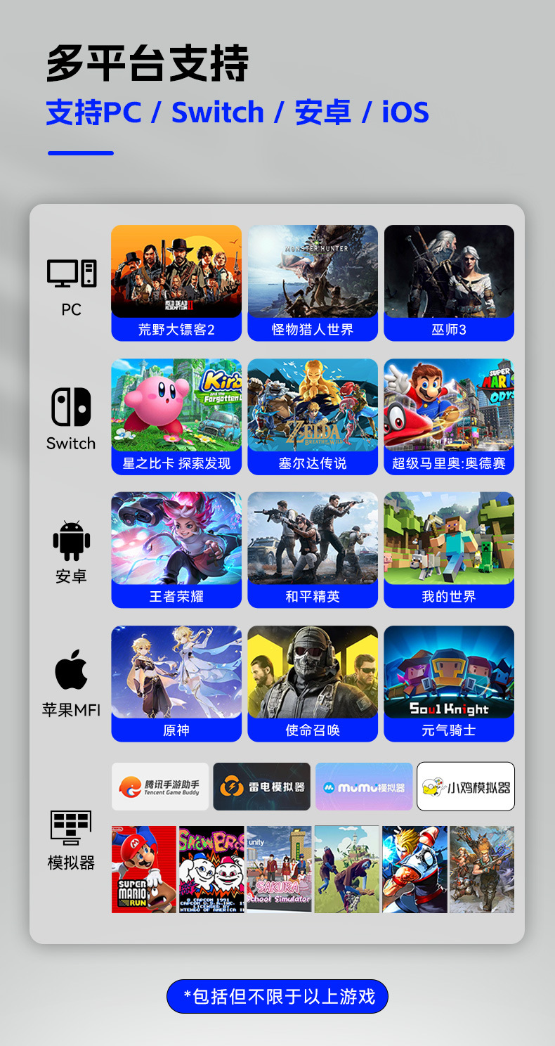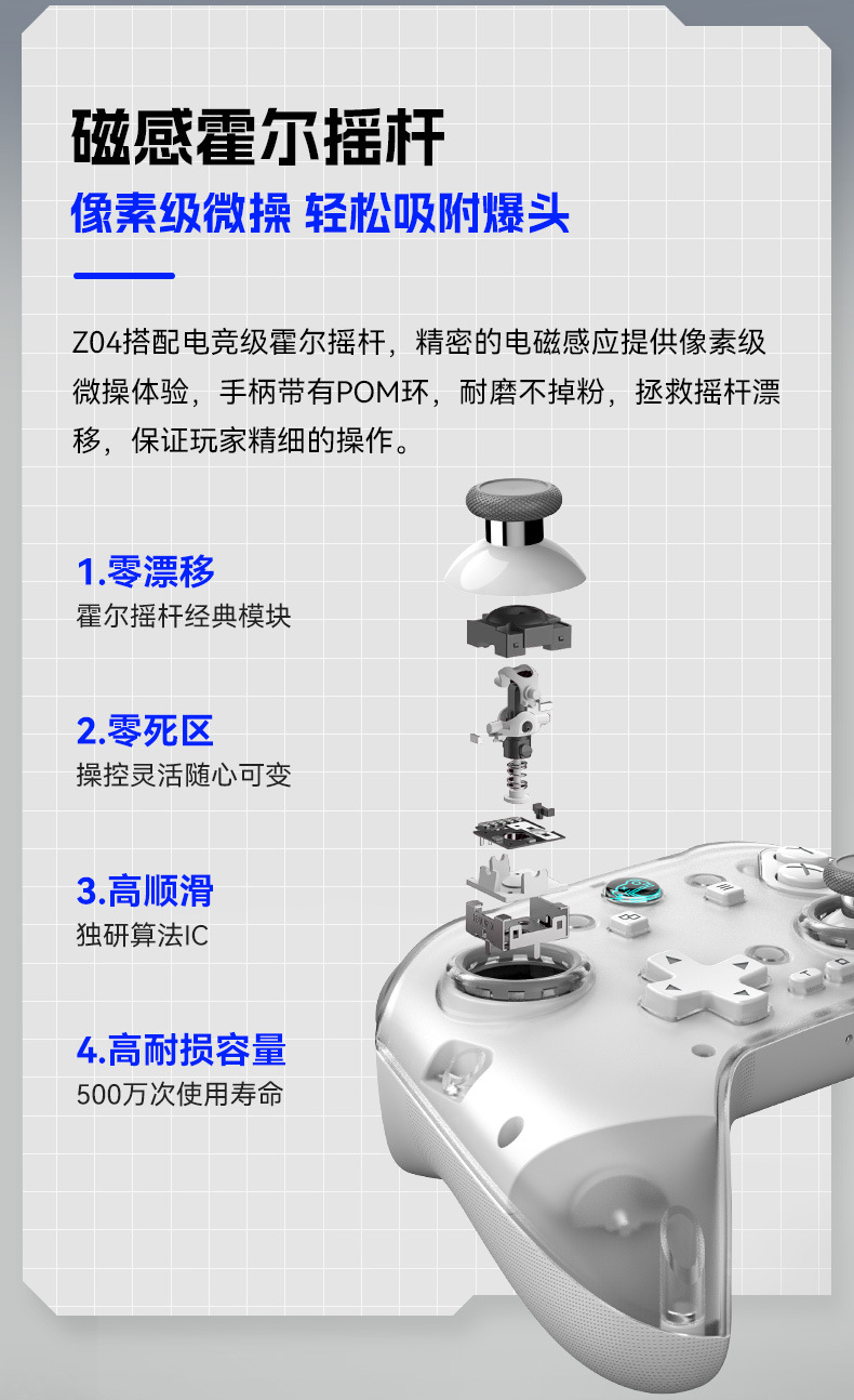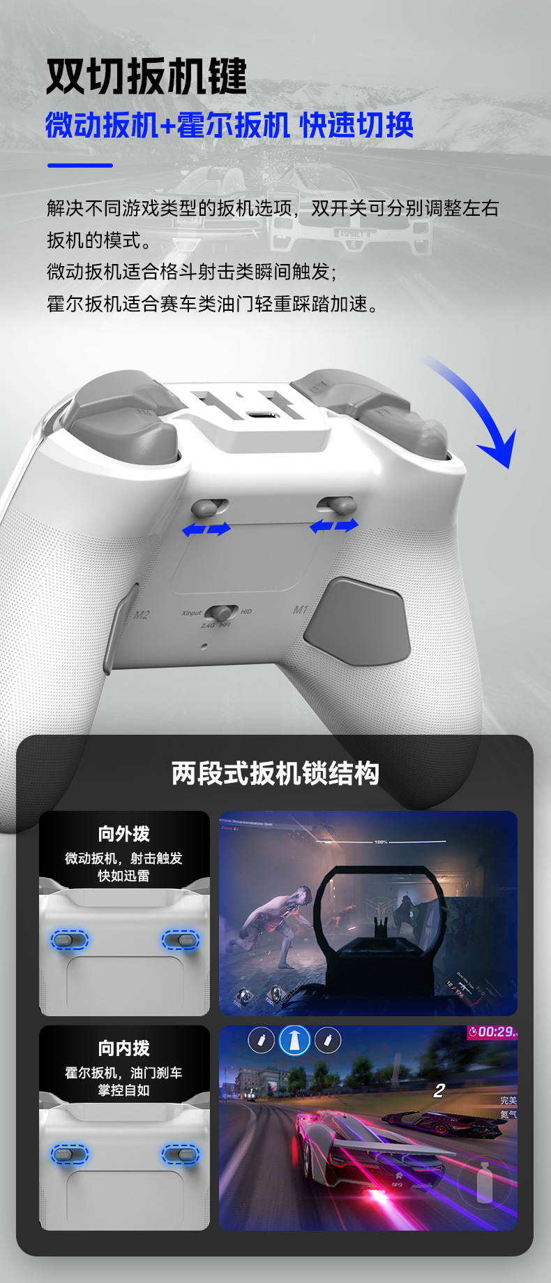 2.搭载霍尔摇杆,搭配POM环,耐磨不掉粉;双切扳机键:微动扳机+霍尔扳机快速切换。