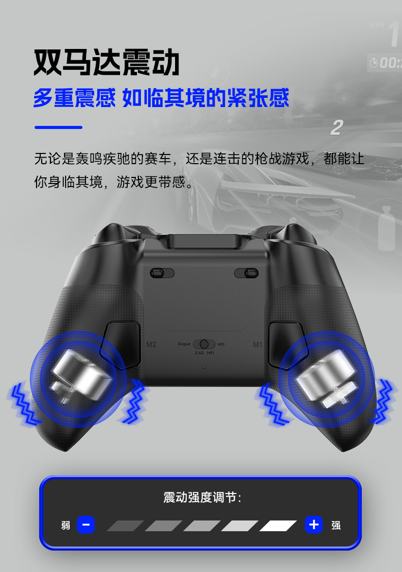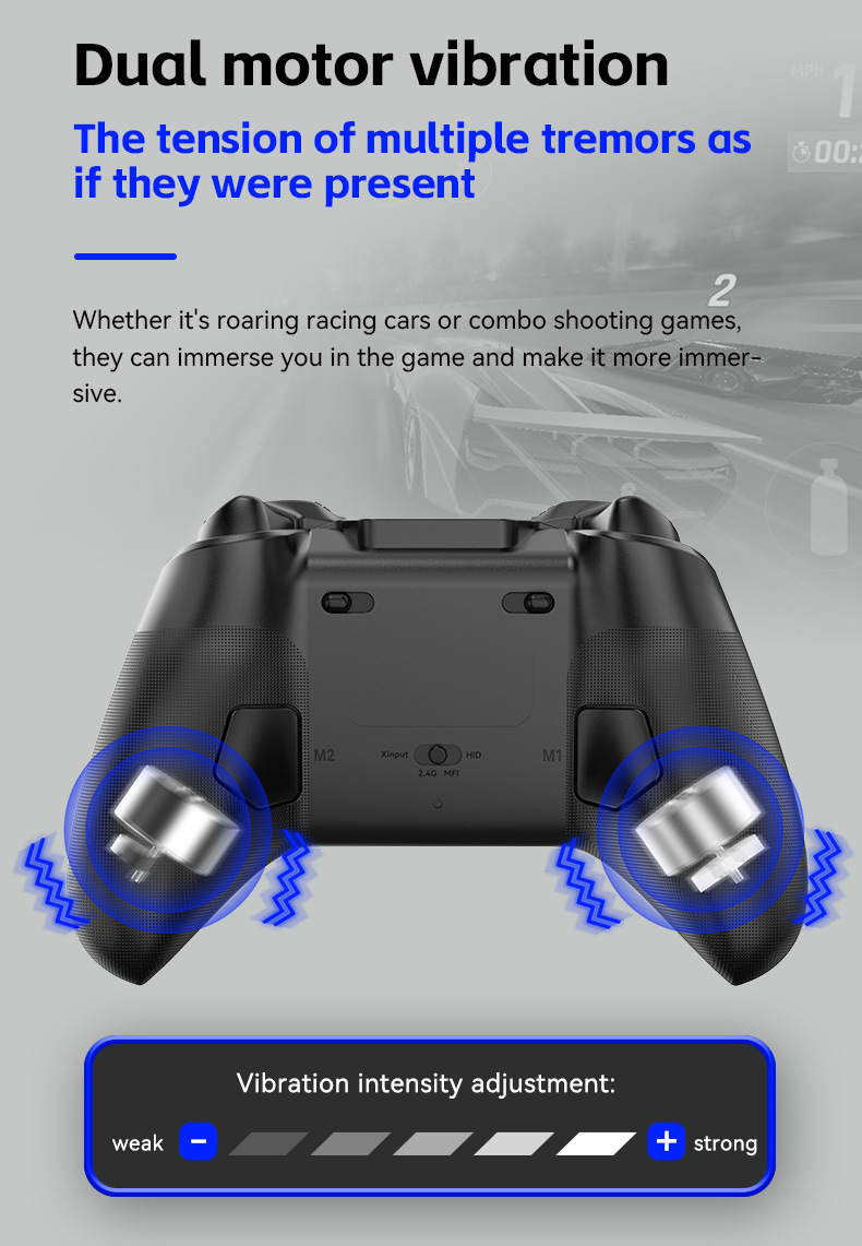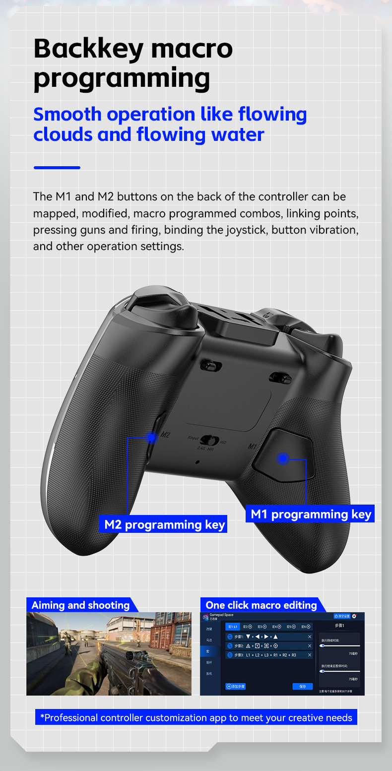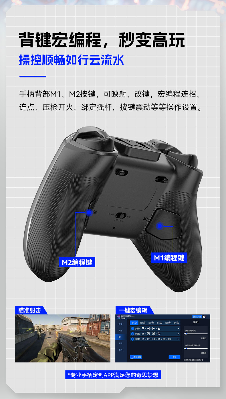 6.带宏编程背键、六轴体感陀螺仪、双震动马达可调节,TURBO一键连发。