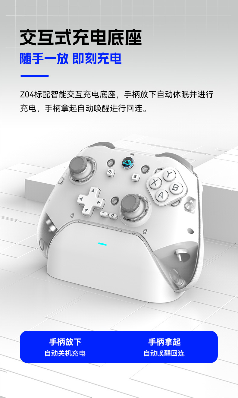 4.搭配交互式充电底座,随手一放,即刻充电,手柄放下自动休眠并进行充电,手柄拿起自动唤醒进行回连。