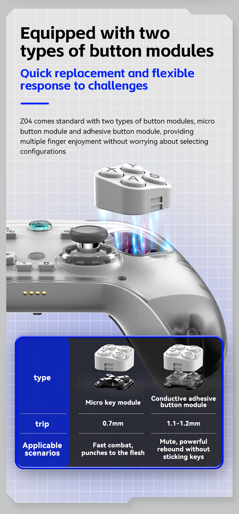 3.搭配两种按键模块,微动按键模块+导胶按键模块快速替换。