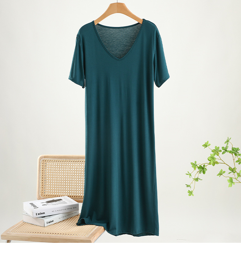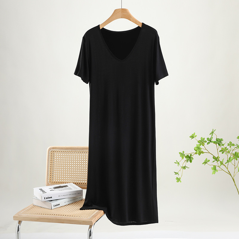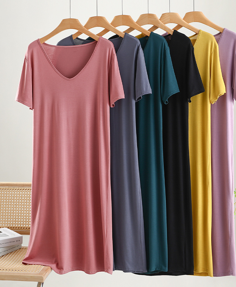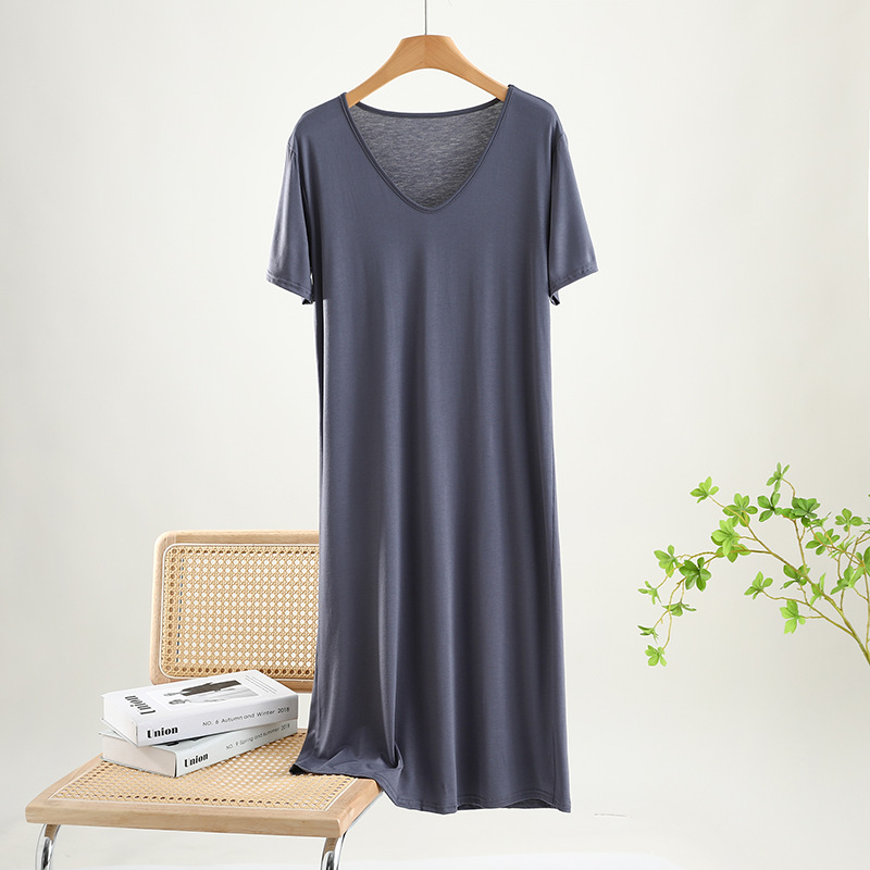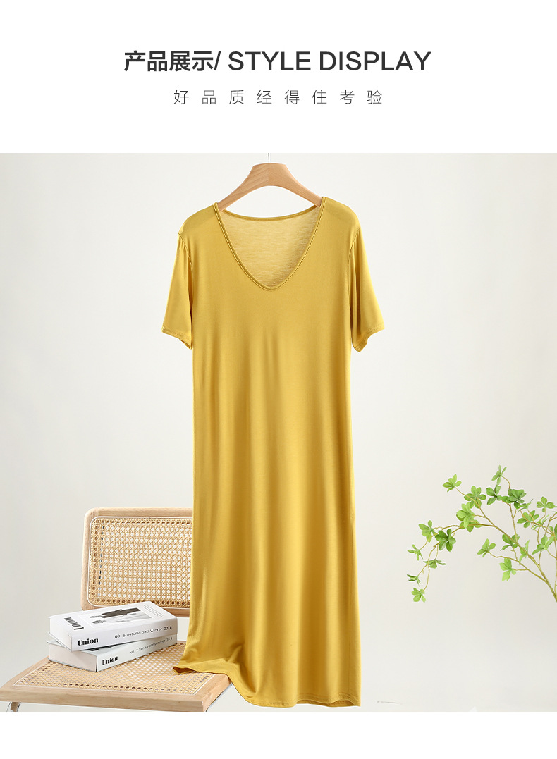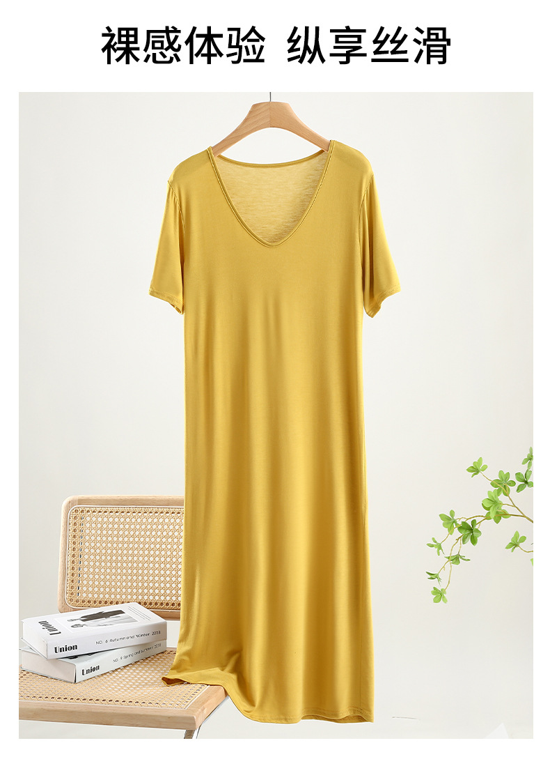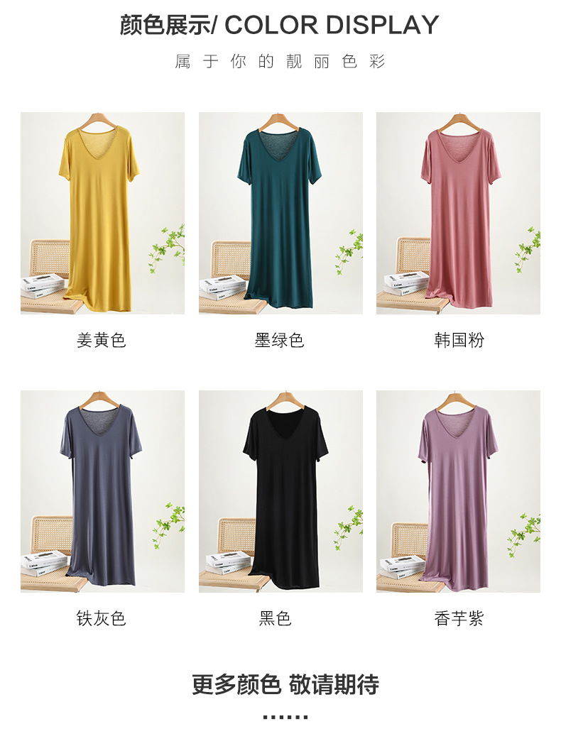 莫代尔U领短袖长裙女夏季薄款外穿睡裙家居裙纯色简约宽松连衣裙