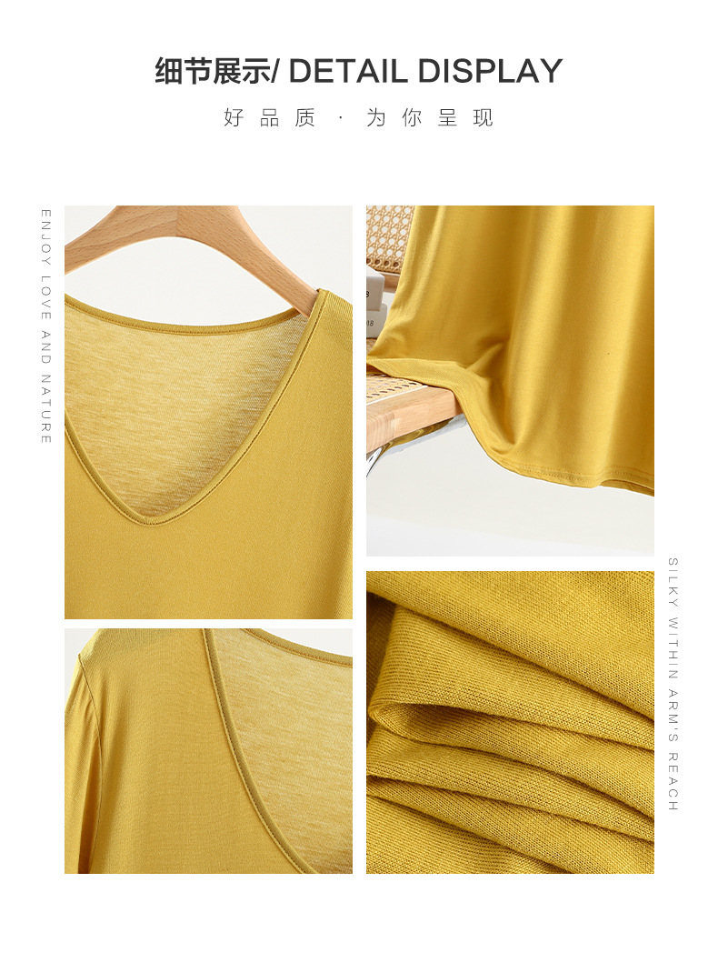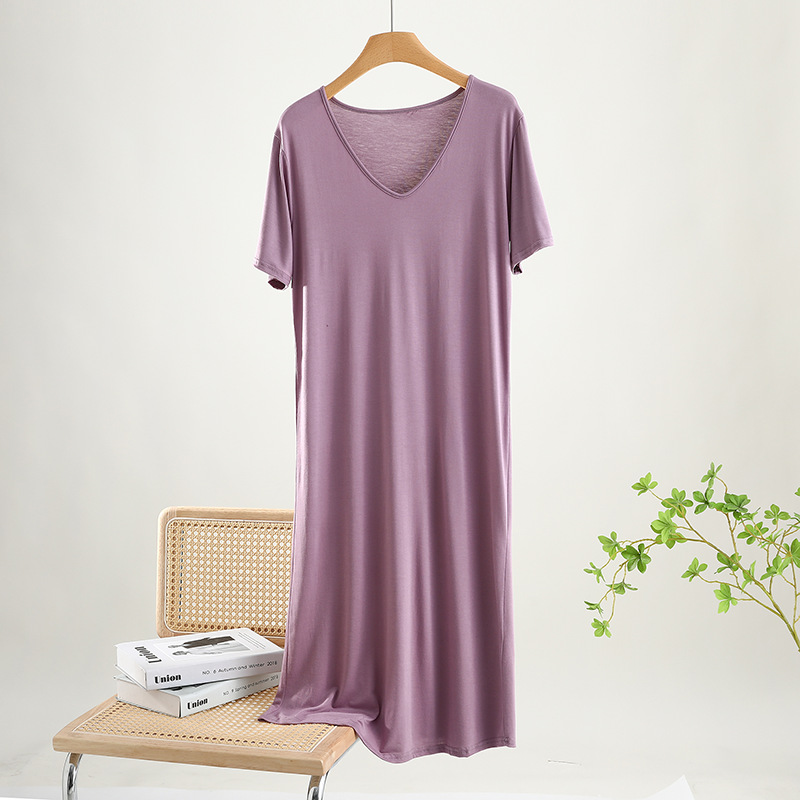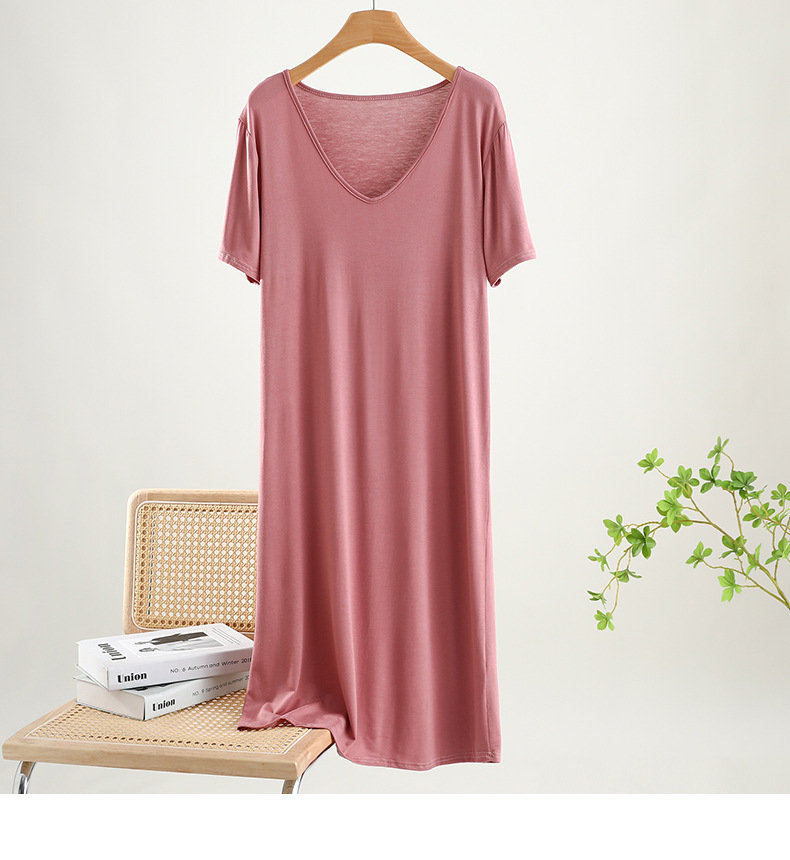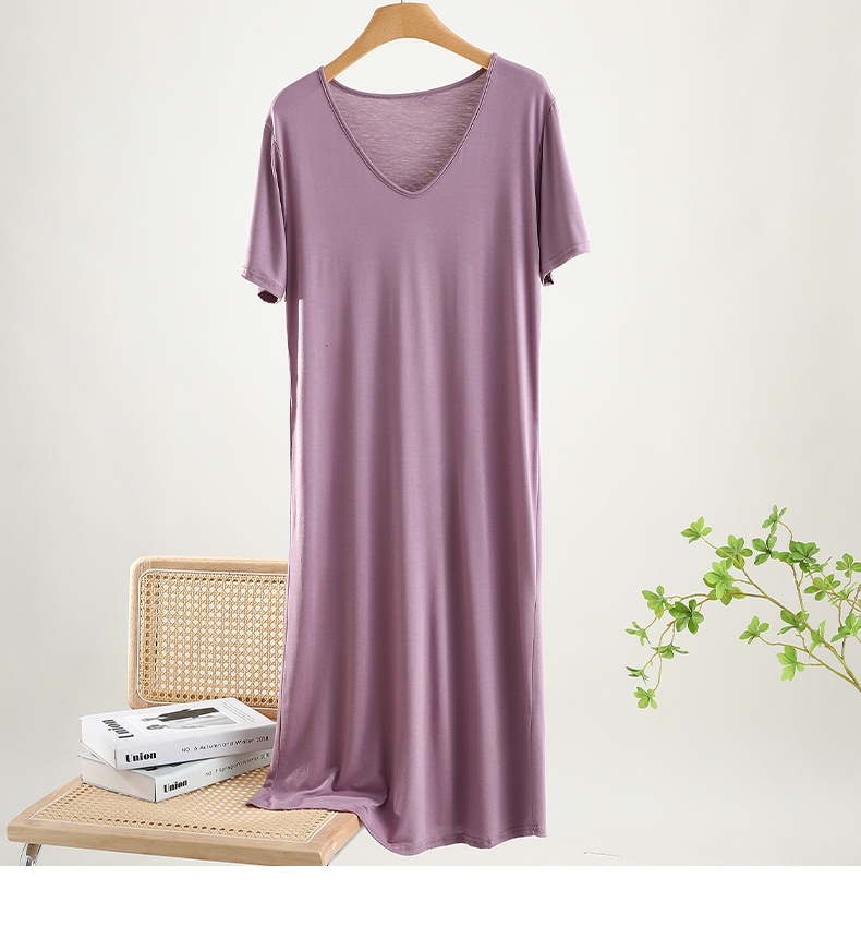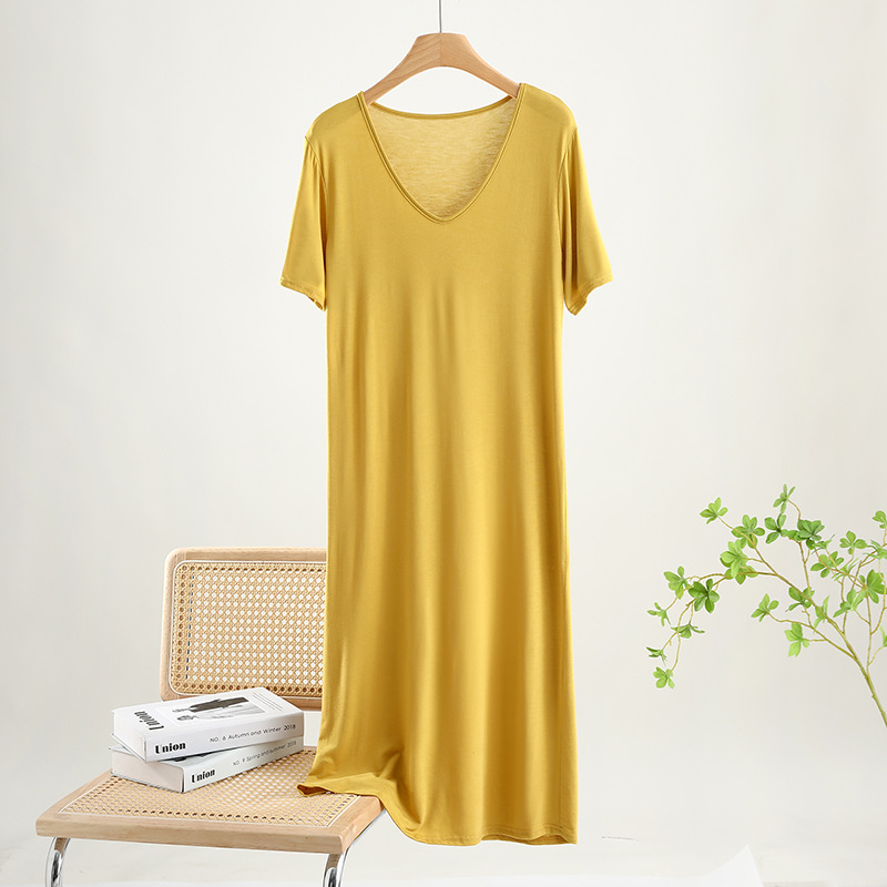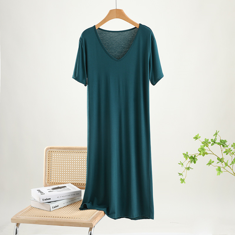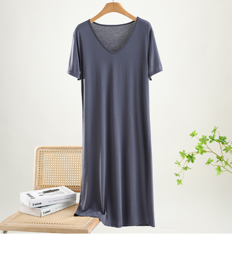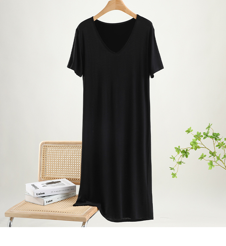 莫代尔U领短袖长裙女夏季薄款外穿睡裙家居裙纯色简约宽松连衣裙